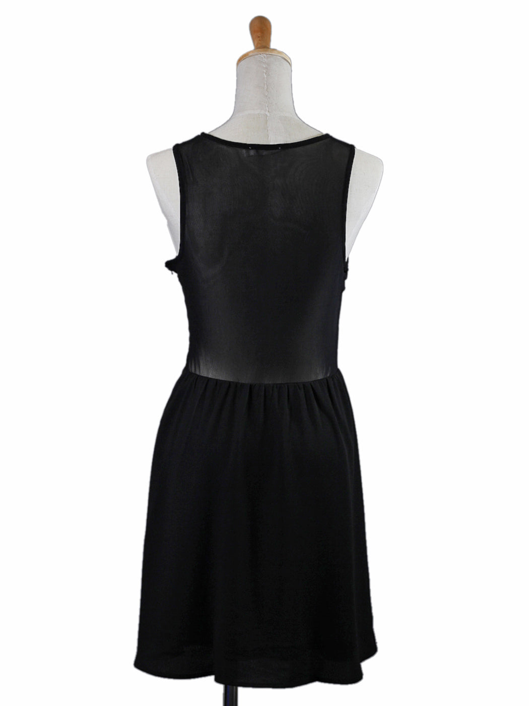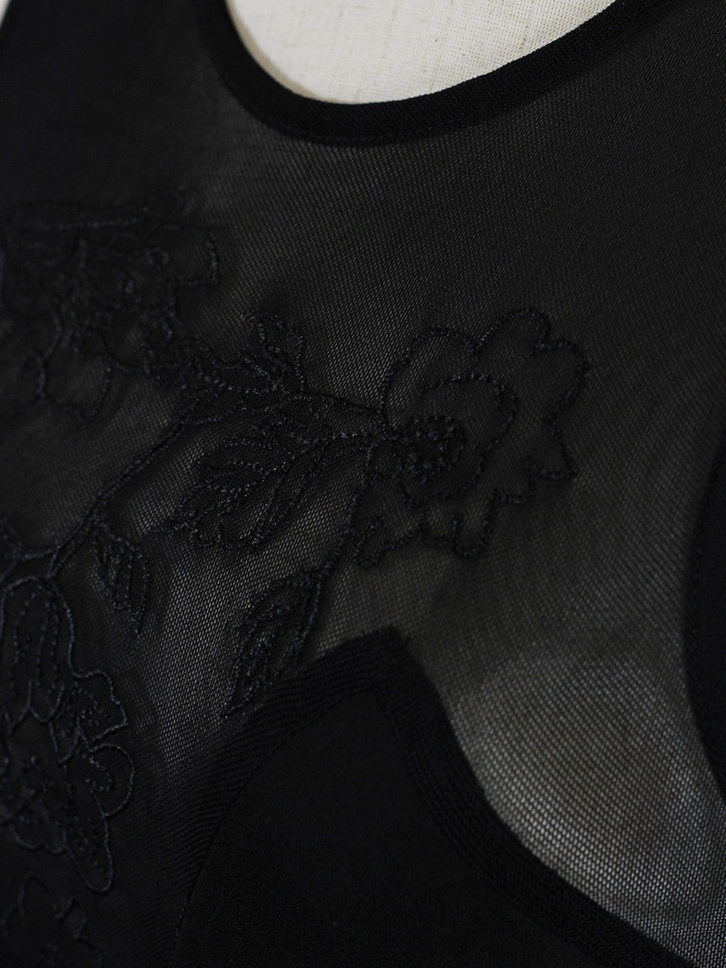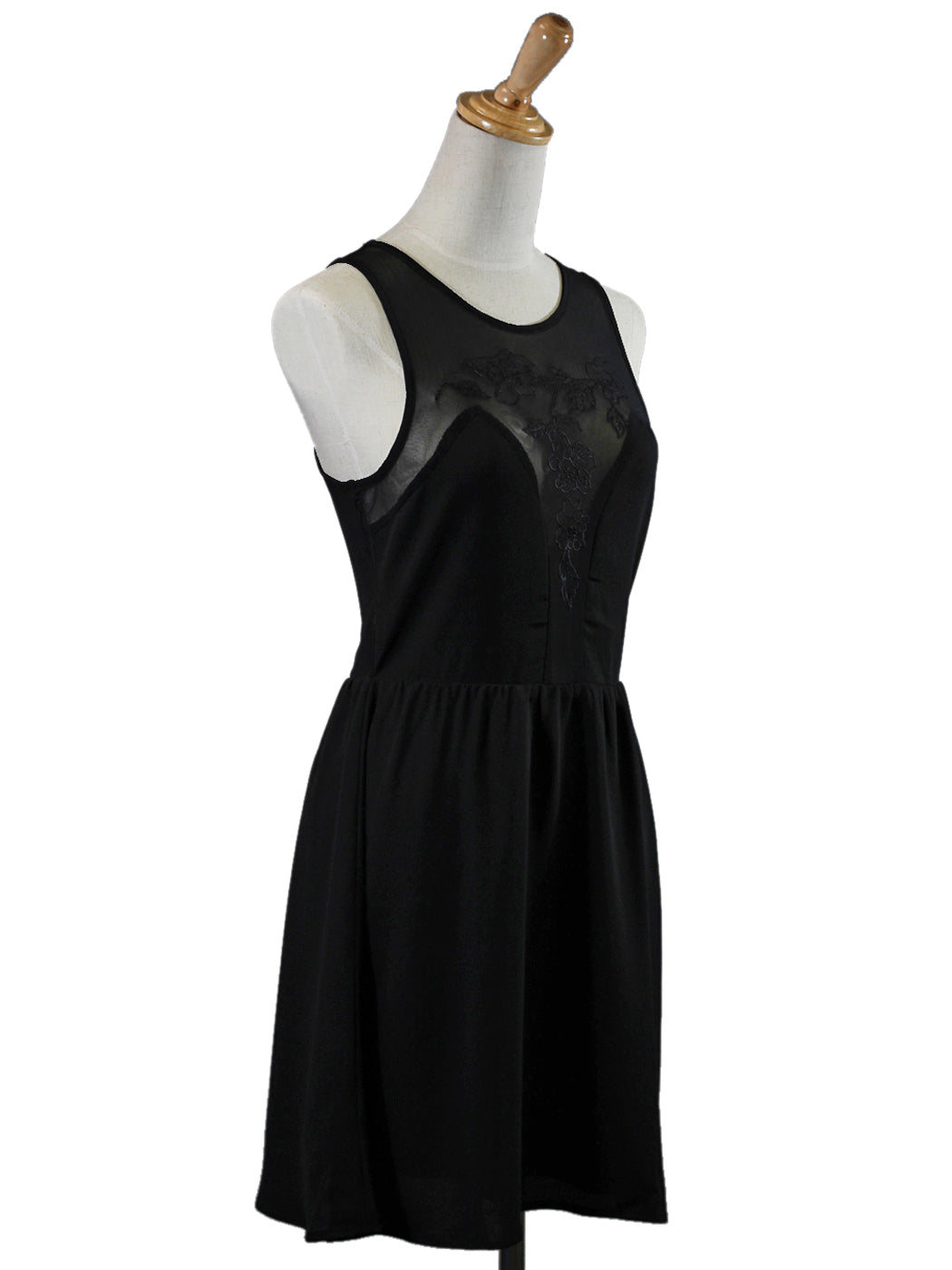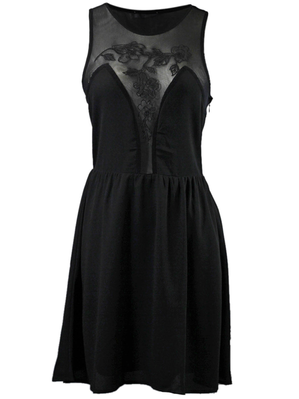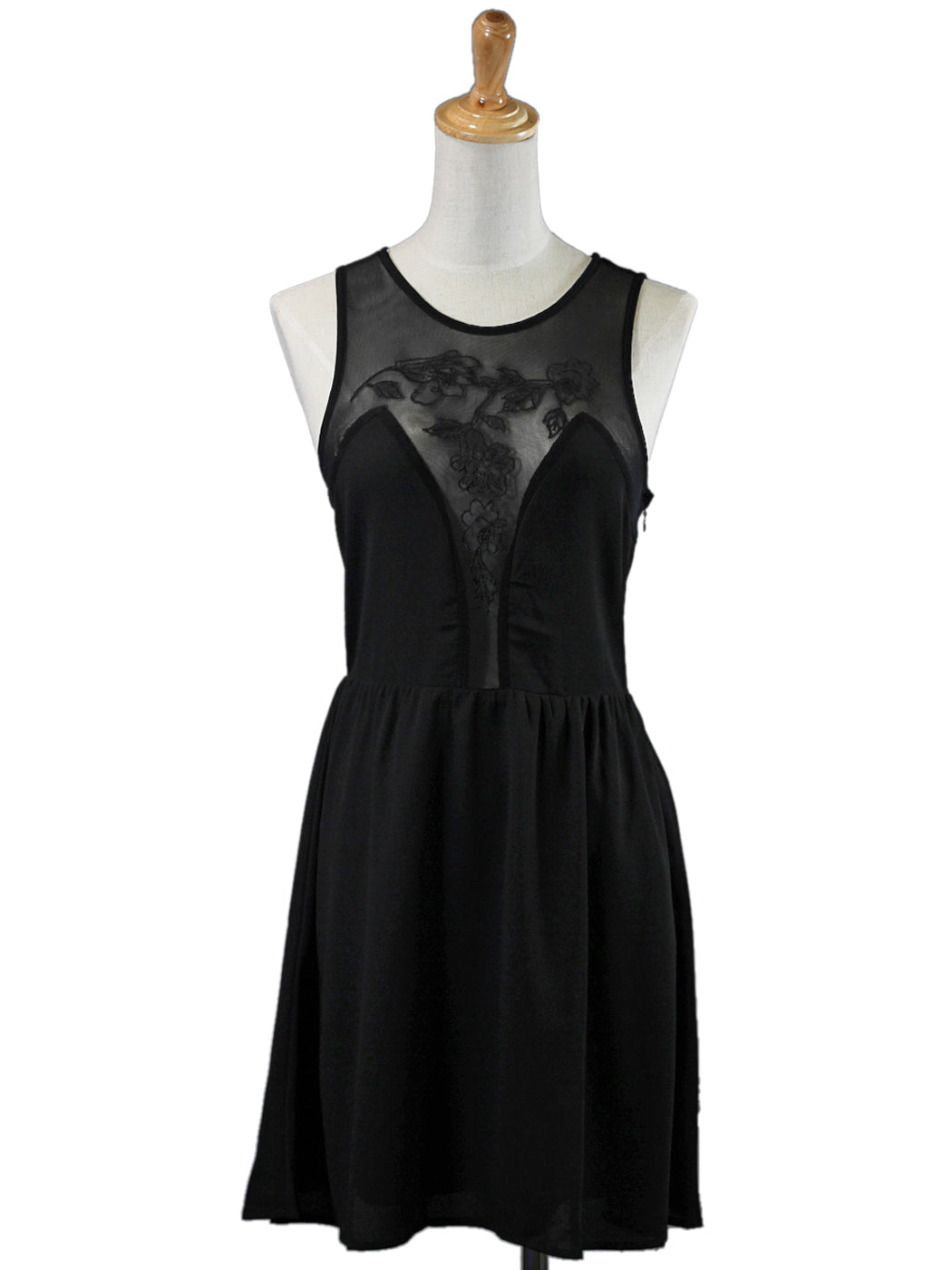 - This mesh inset dress has some delicate floral stitching down the neckline. The see through mesh neckline detail gives it a sexy look, but not too overdone. Throw it on, grab a clutch, and you're ready for a night out.DETAILS (Measured from Small):- SMALL, MEDIUM, LARGE- BUST: 28- WAIST: 27- HIP: 30 - BODY LENGTH: 12- COLOR: BLACK- Material: POLYESTER