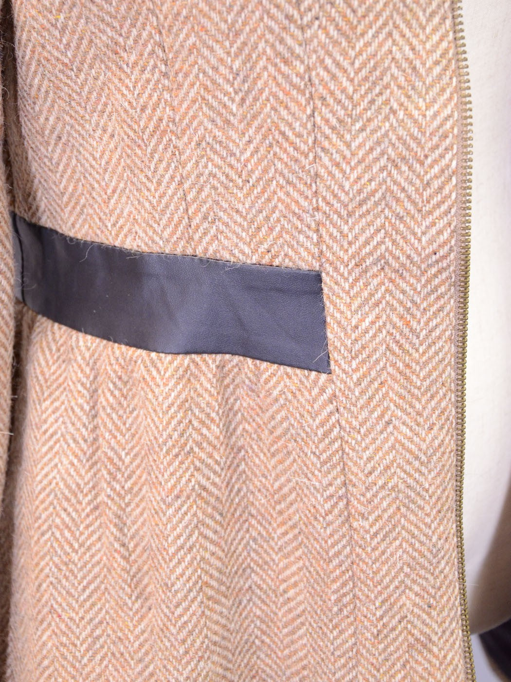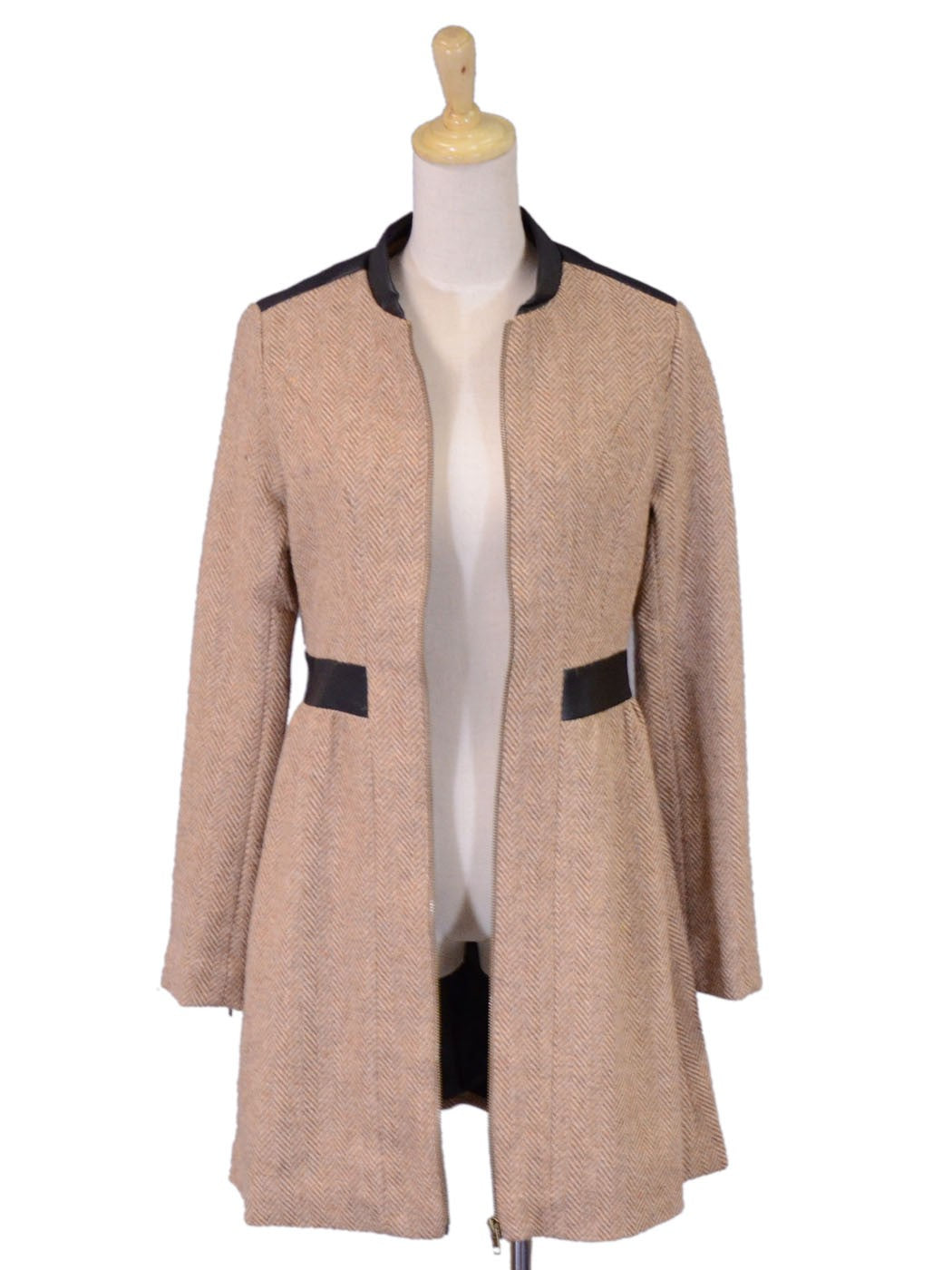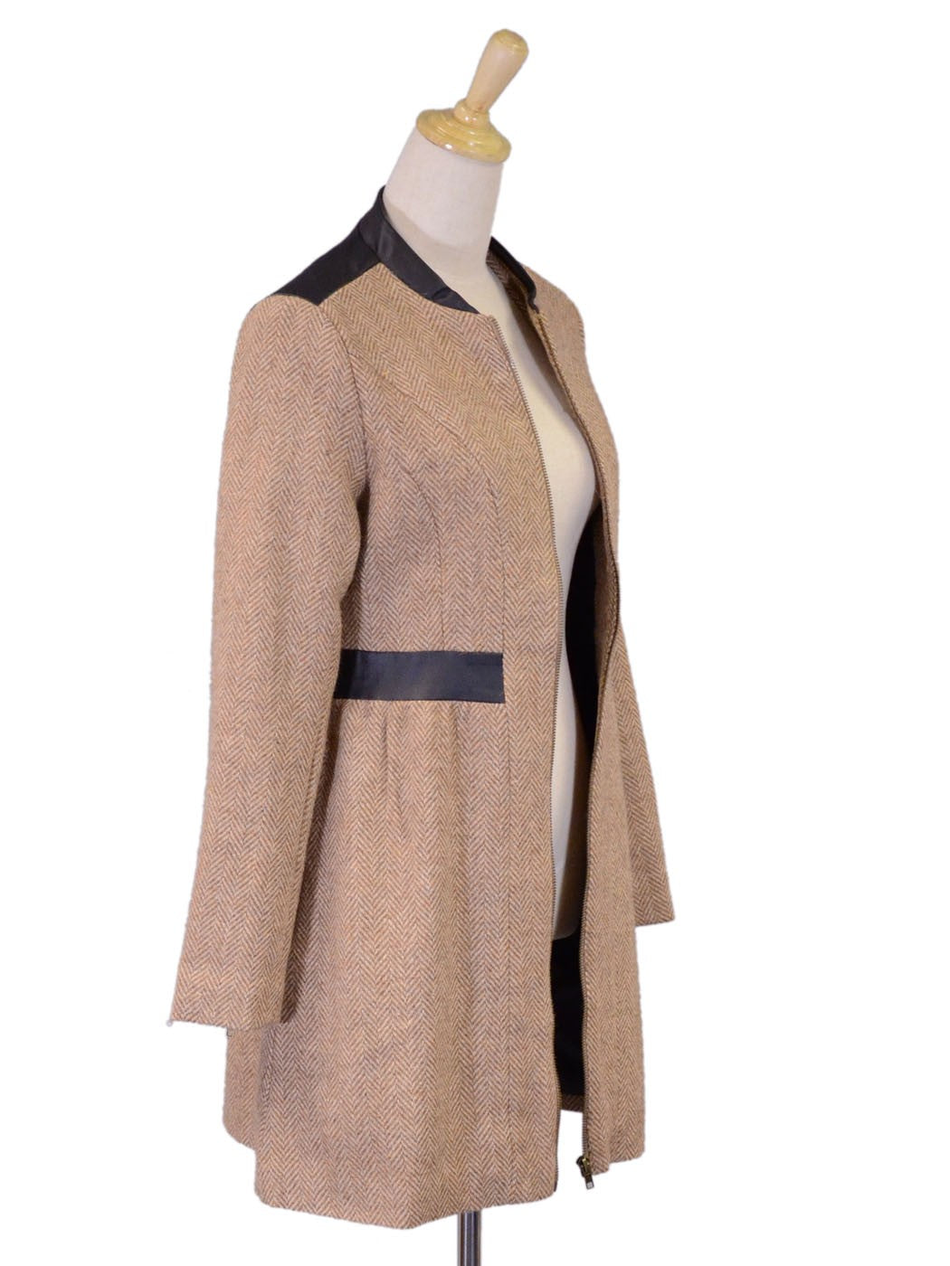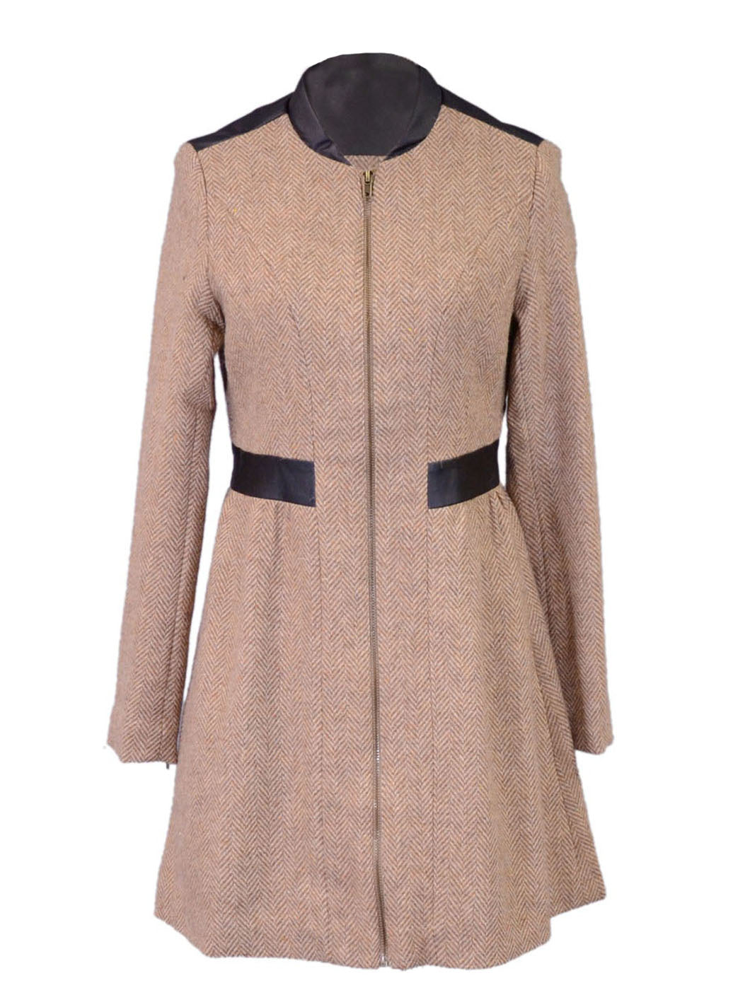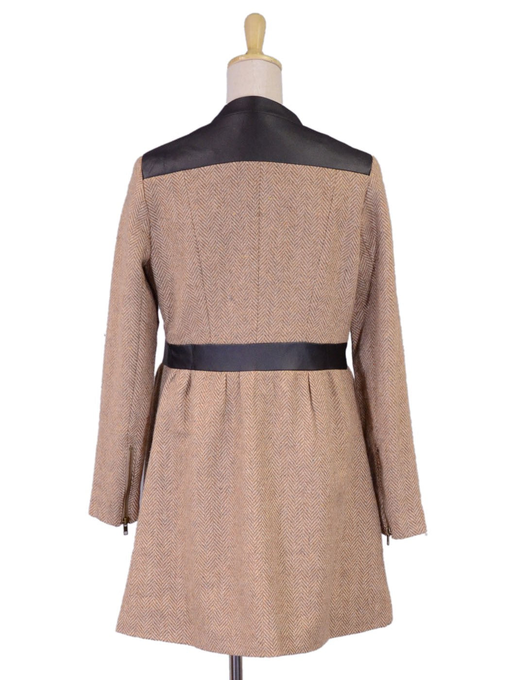 Anna-Kaci Herringbone Zip Up Long Coat With Faux Leather Trim Collar And Waist