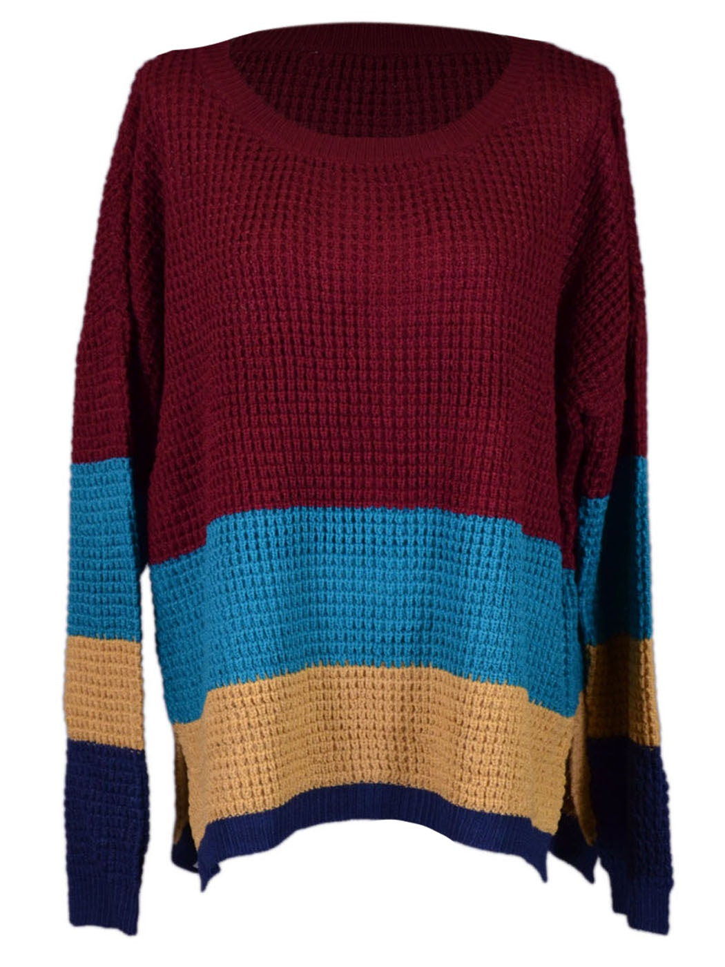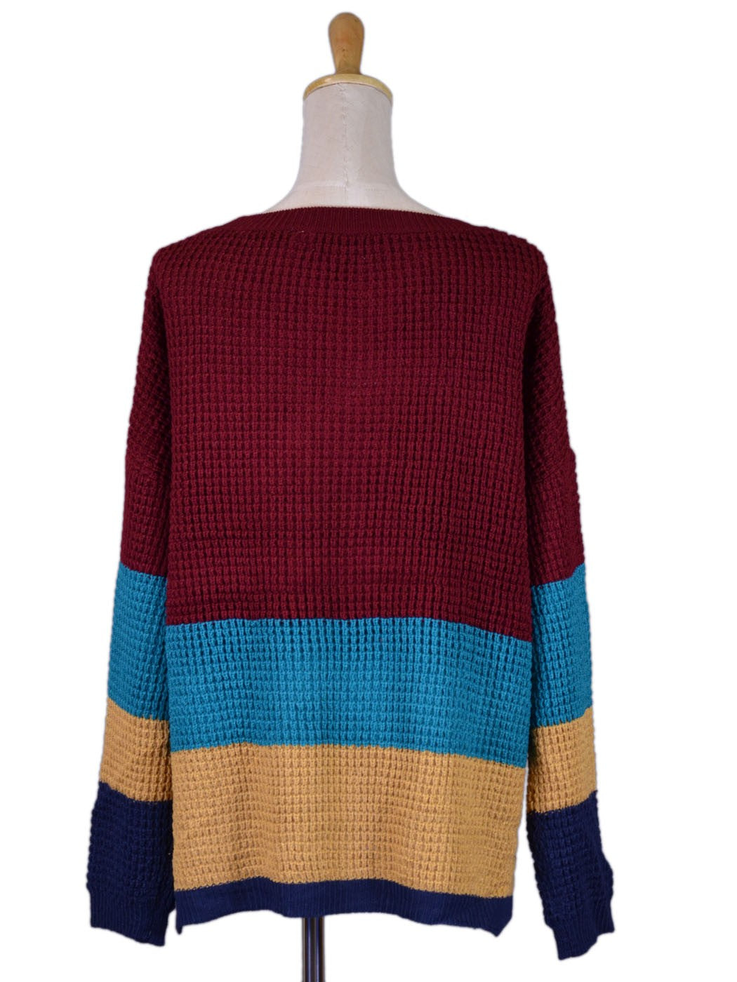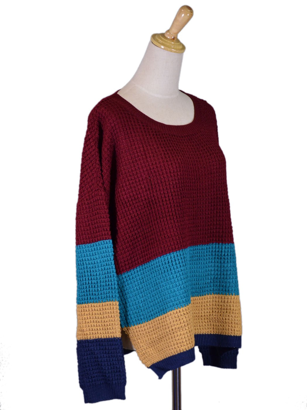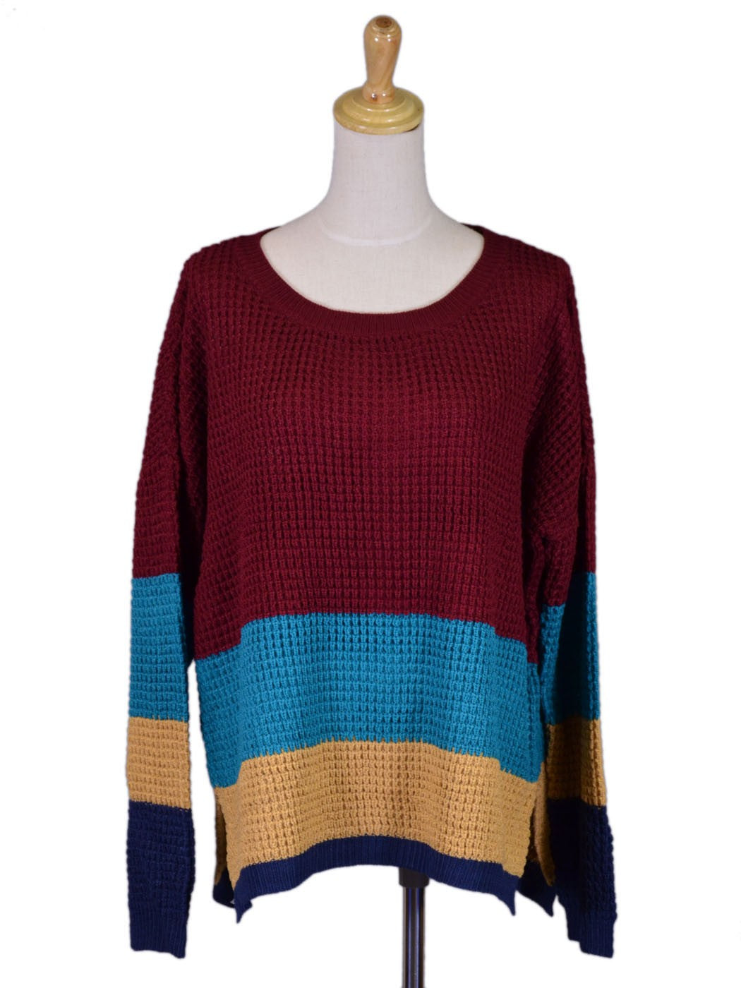 - This red, blue and tan sweater has color block detail. It also features thick cable knit. Pair this sweater with skinny jeans and ankle boots.Details (Measured from SMALL)- SMALL, MEDIUM, LARGE- BUST: 54- SLEEVE LENGTH: 18.5- BODY LENGTH: 24- COLOR: Red/Multicolour- MATERIAL: 100% Acrylic