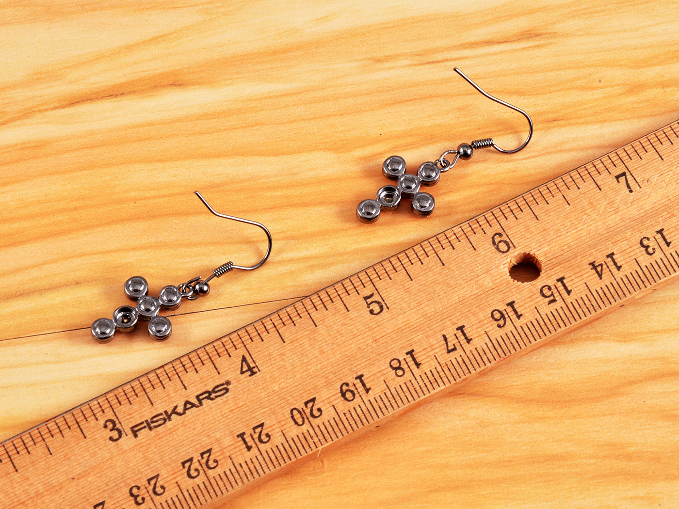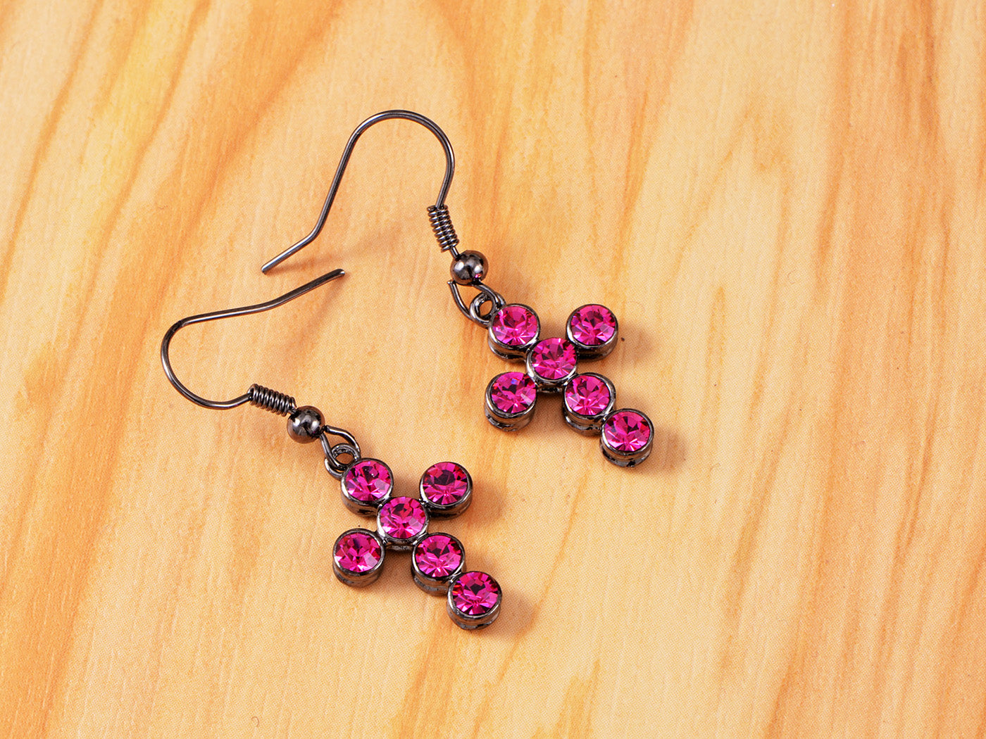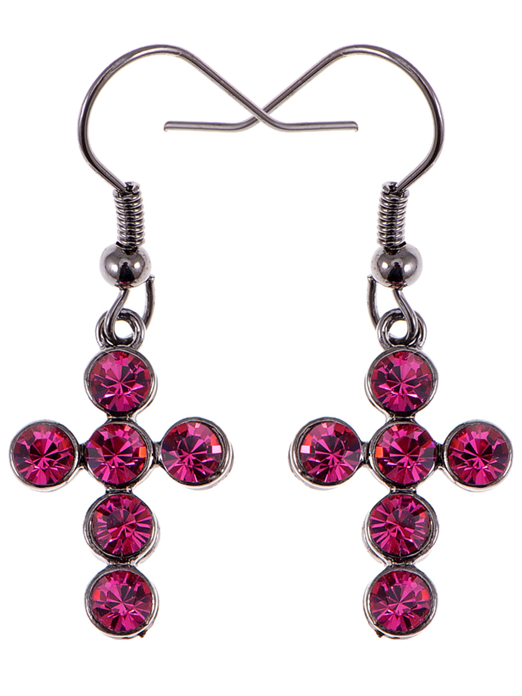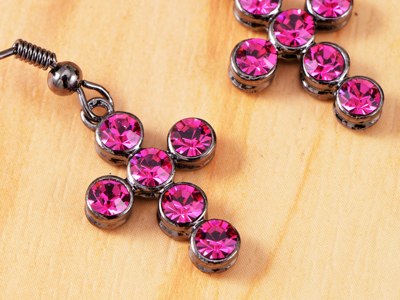 - CHIC STATEMENT CROSS. Feel inspired with these glimmering cross earrings dangling from your lobes! Featuring feminine bright pink Swarovski rhinestone crystals arranged in a religious emblem you are sure to make a statement with this colorful piece of cha