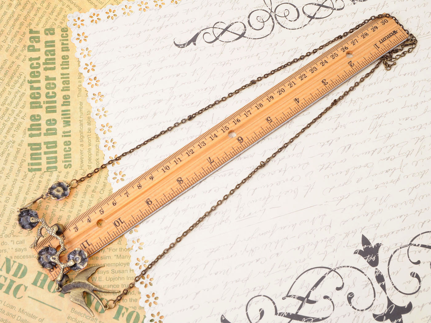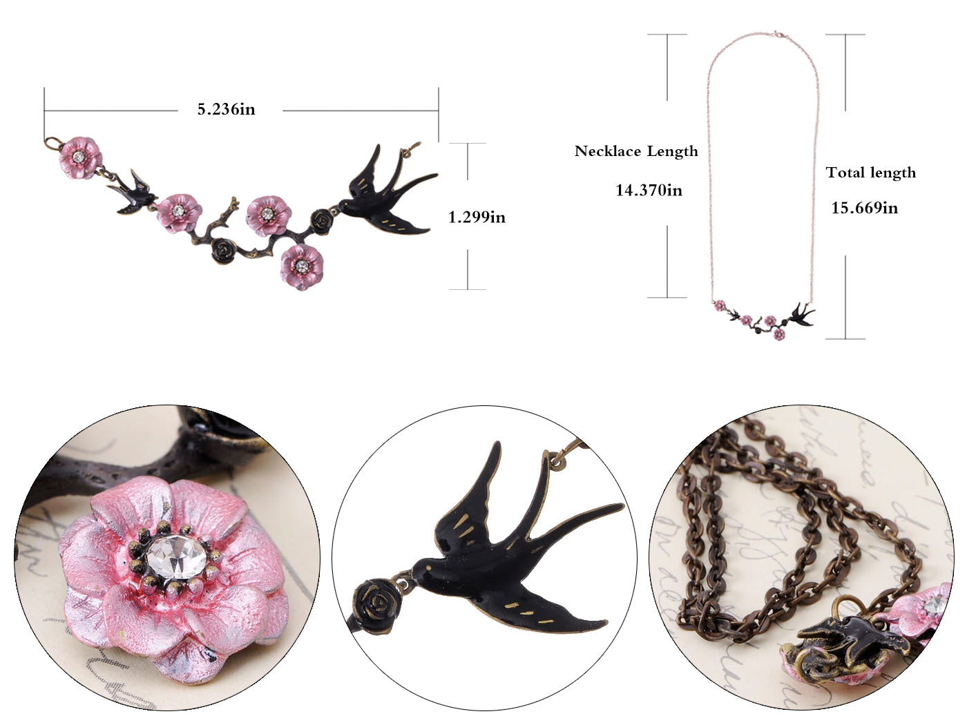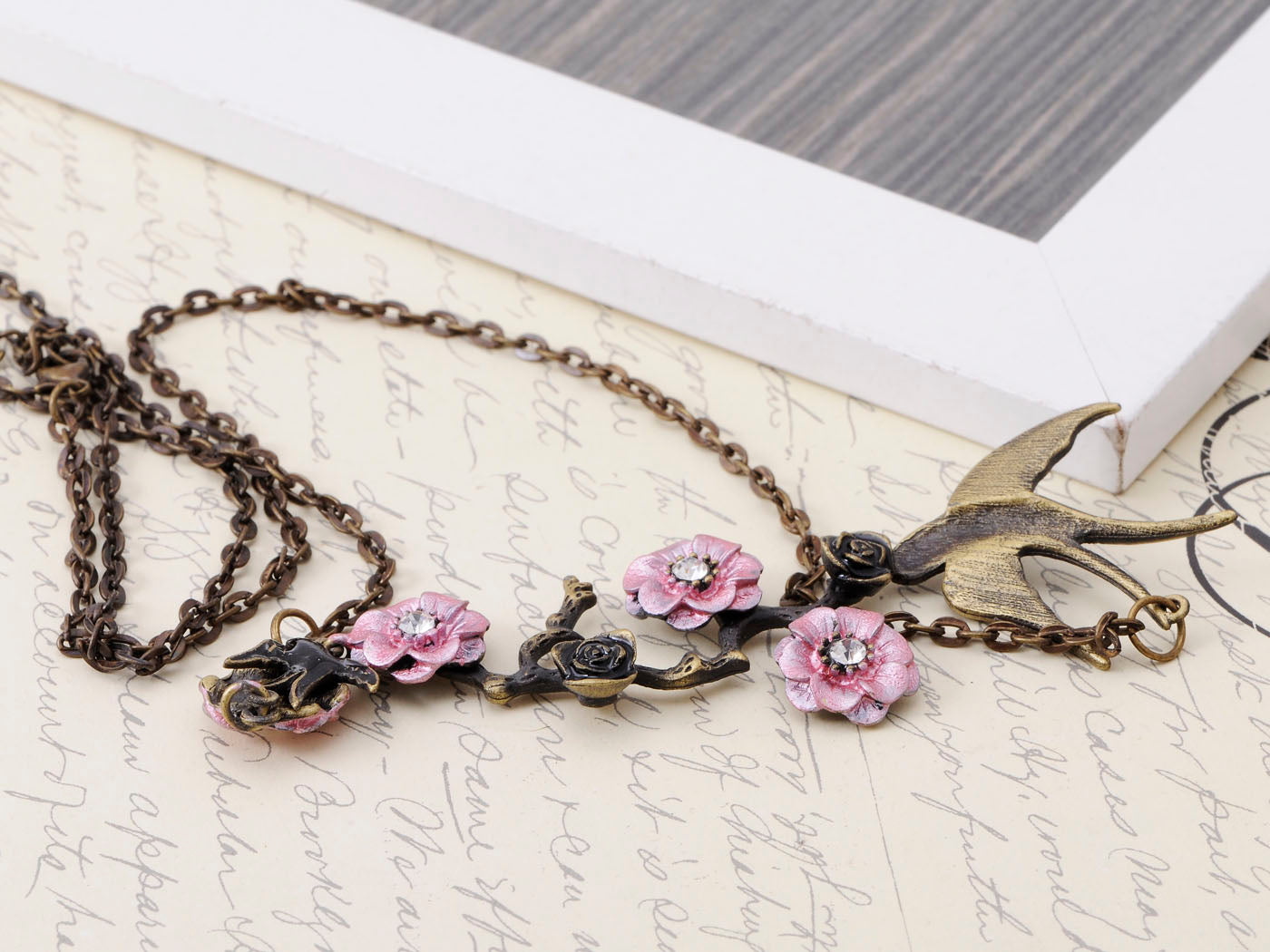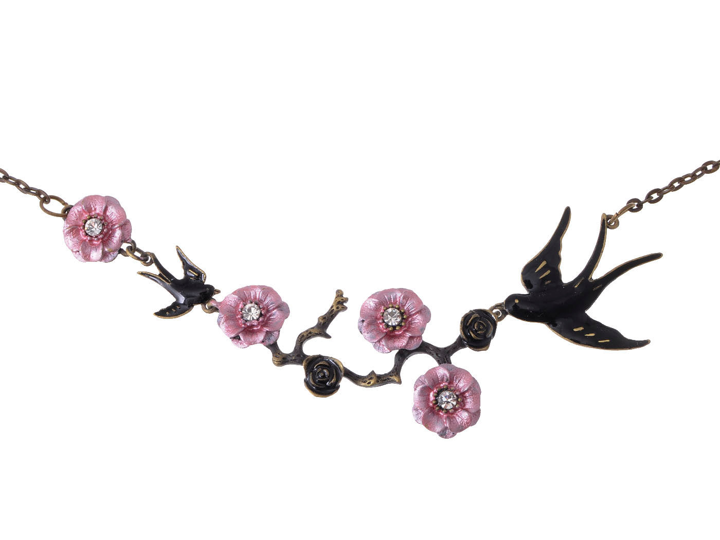 Antique Hand Painted Pink Cherry Blossom Flower Enamel Black Sparrow Birds Necklace