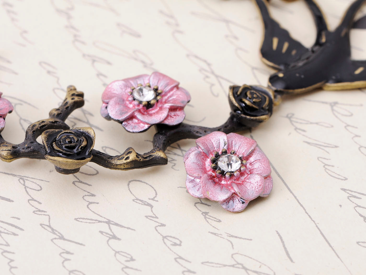 - UNIQUE DESIGN - Cute hand painted Cherry Blossoms with clear crystal rhinestone on a tree branch with black enamel Sparrow birds. Antique tone metal alloy base.