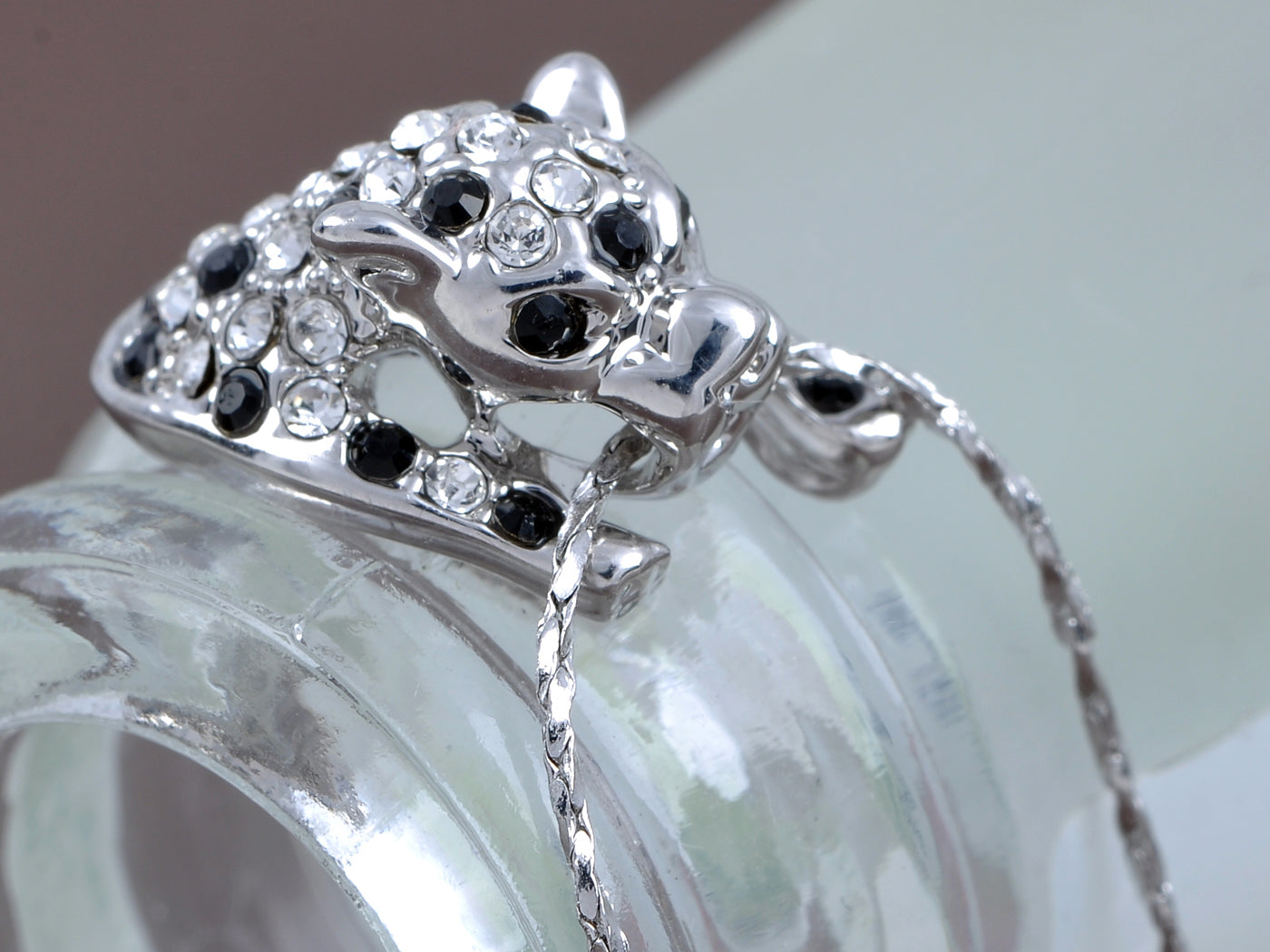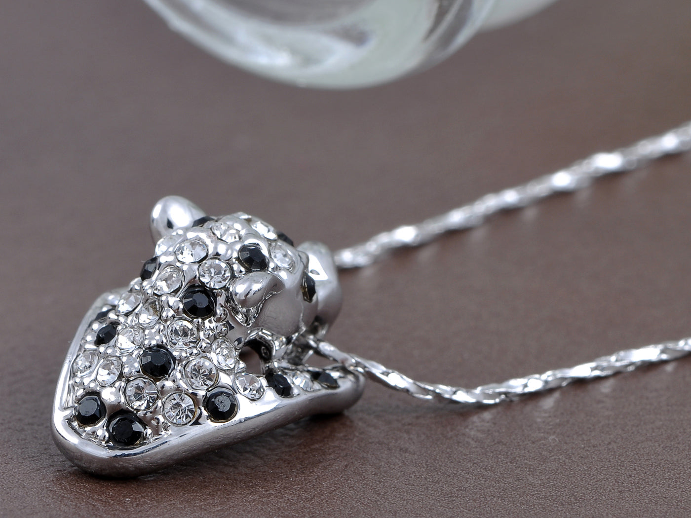 - BEAUTIFUL DESIGN - Stunning silver tone necklace that had a leopard pendant encrusted in black and clear crystal rhinestones. The Leopard is seen holding onto dear life which in this case is the necklace chain.