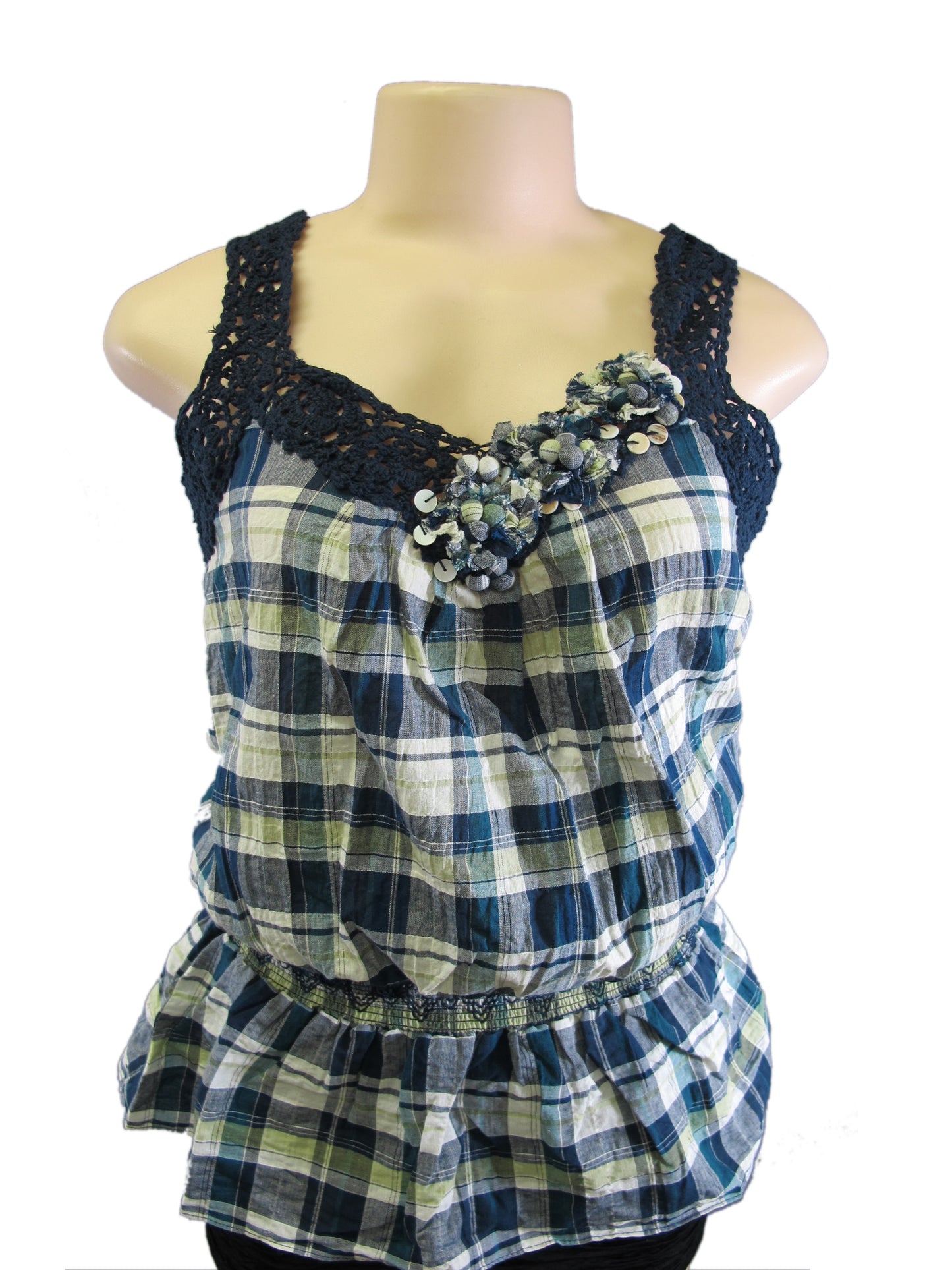 Anna-Kaci Babydoll Blouse Crochet Neckline Plaid Pattern-Large