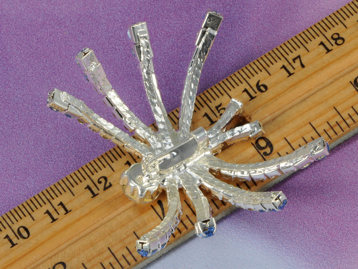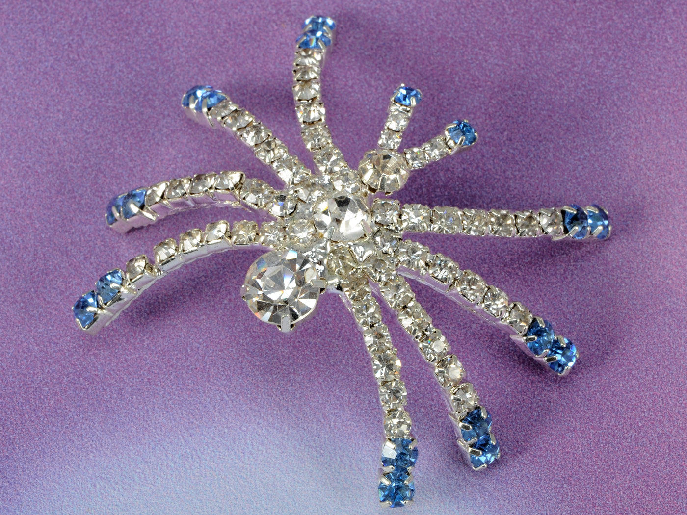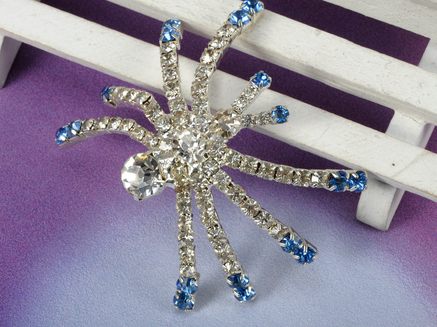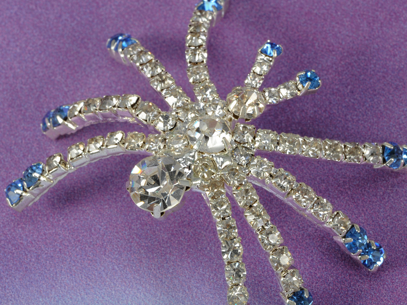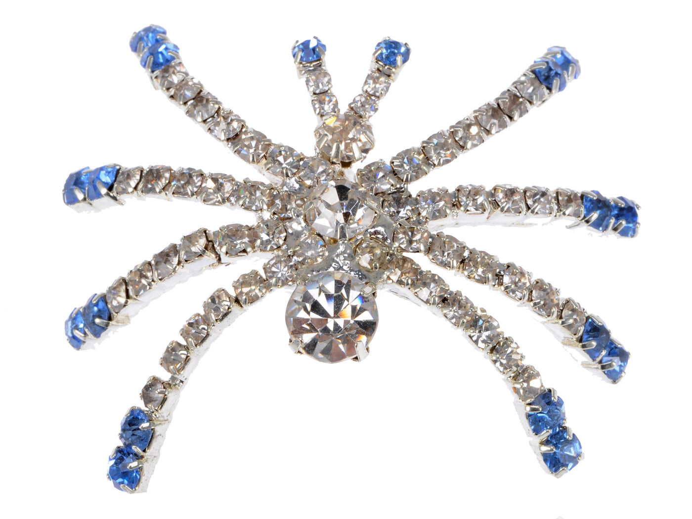 - UNIQUE DESIGN - Brooch featuring halloween creepy spider design with blue and clear austrian crystal rhinestones and silver tone alloy metal.