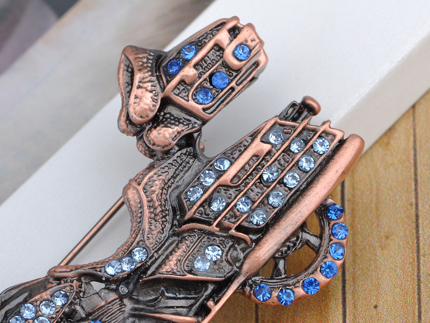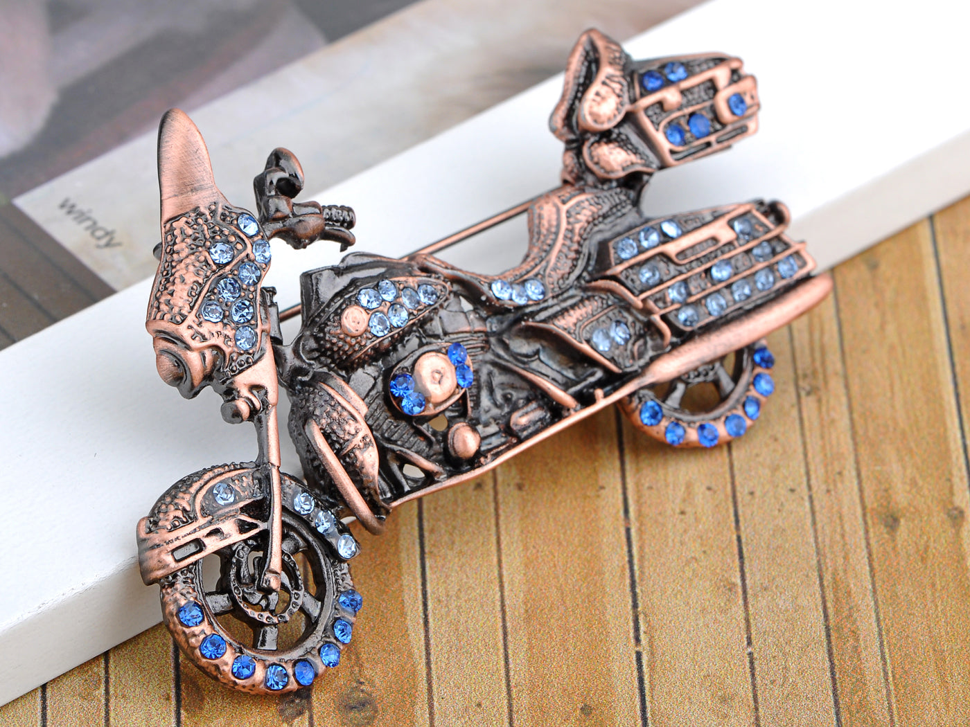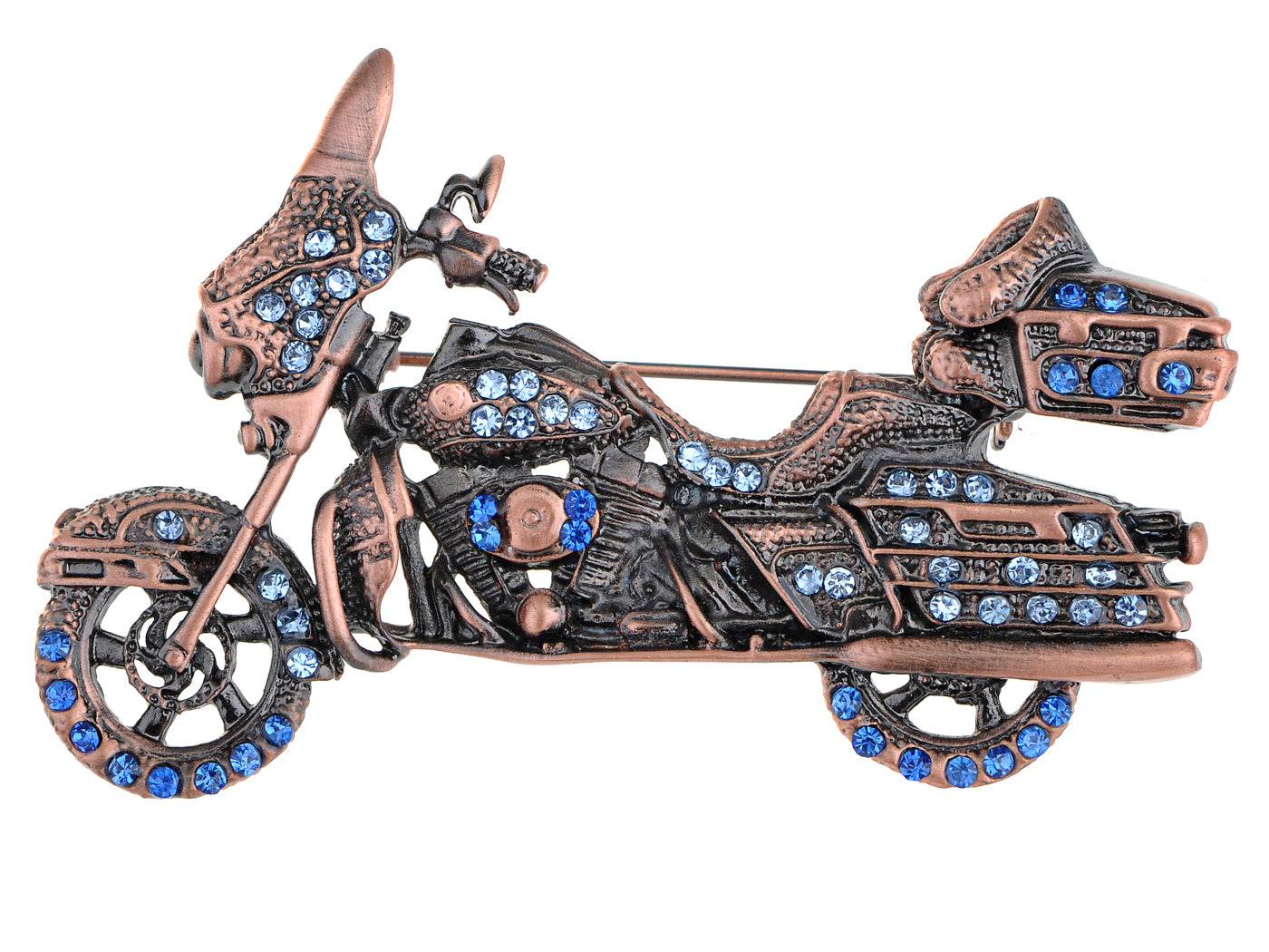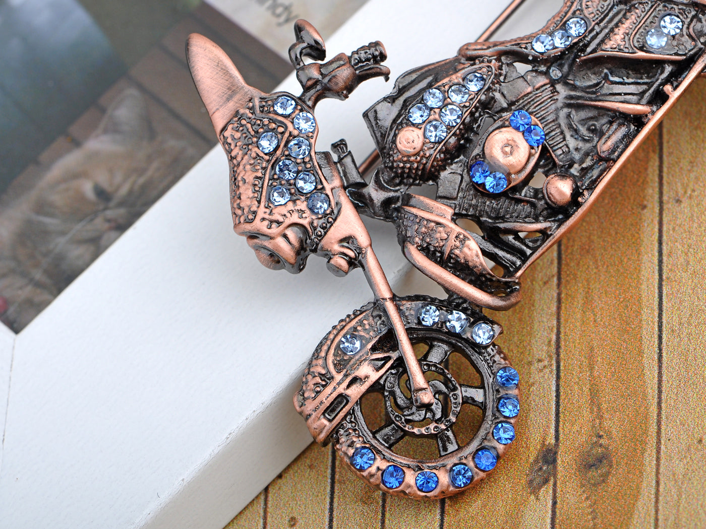 - UNIQUE DESIGN - A lovely antique bronze tone motorcycle brooch. The motorcycle has light and dark blue crystal rhinestones embedded throughout.