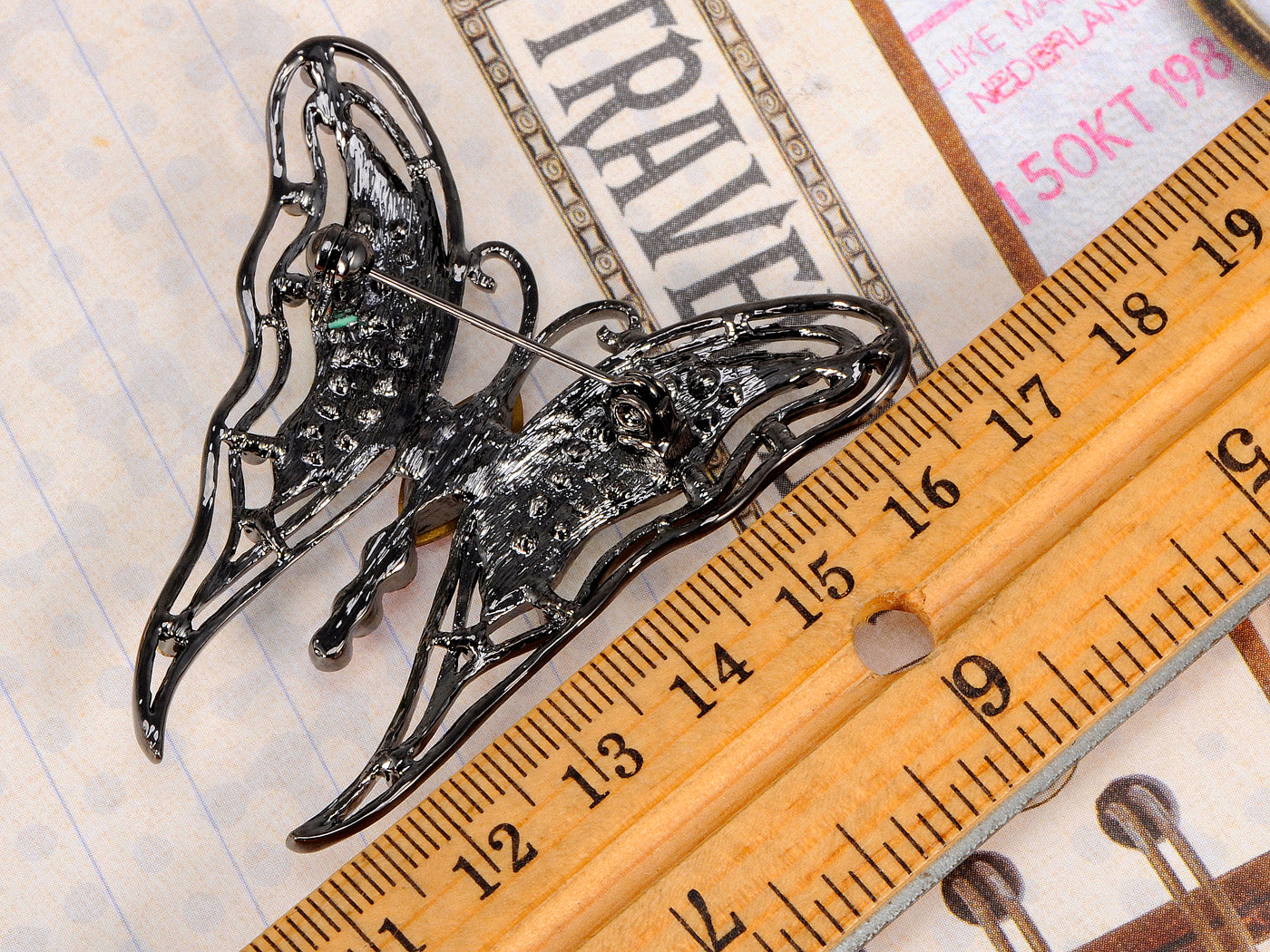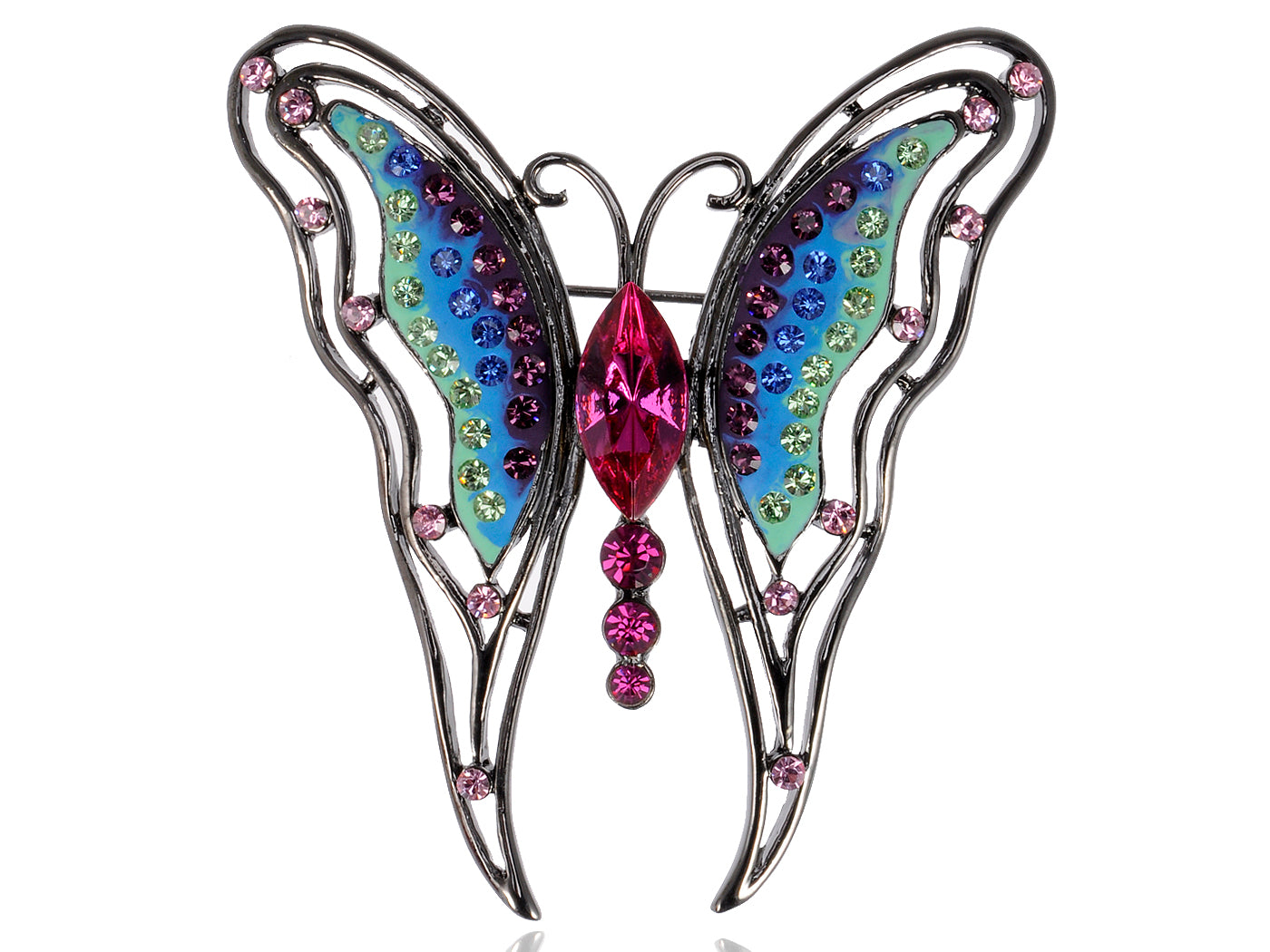 - Wire framed gossamer rose, Synthetic Topaz, Synthetic Sapphire blue, Synthetic Ruby rhinestone studded wings mounted on a segmented whole Synthetic Ruby crystals body, makes this butterfly brooch an instant hit.