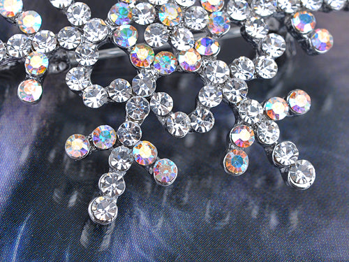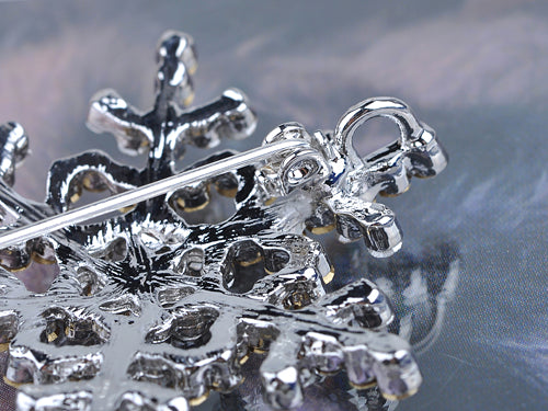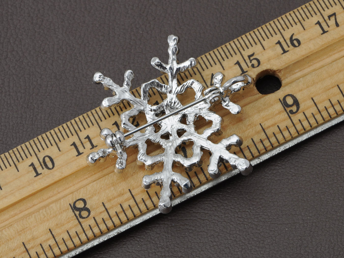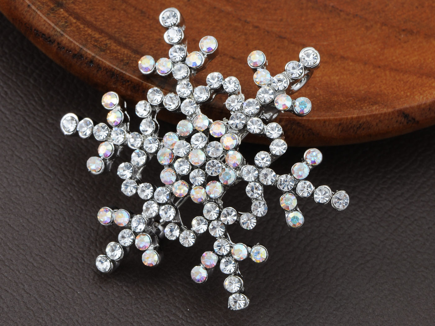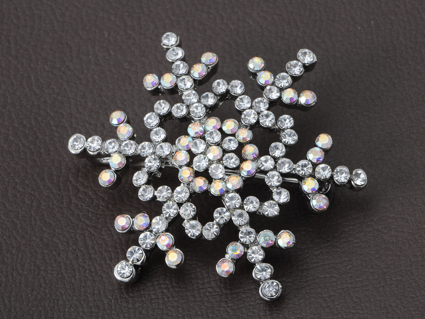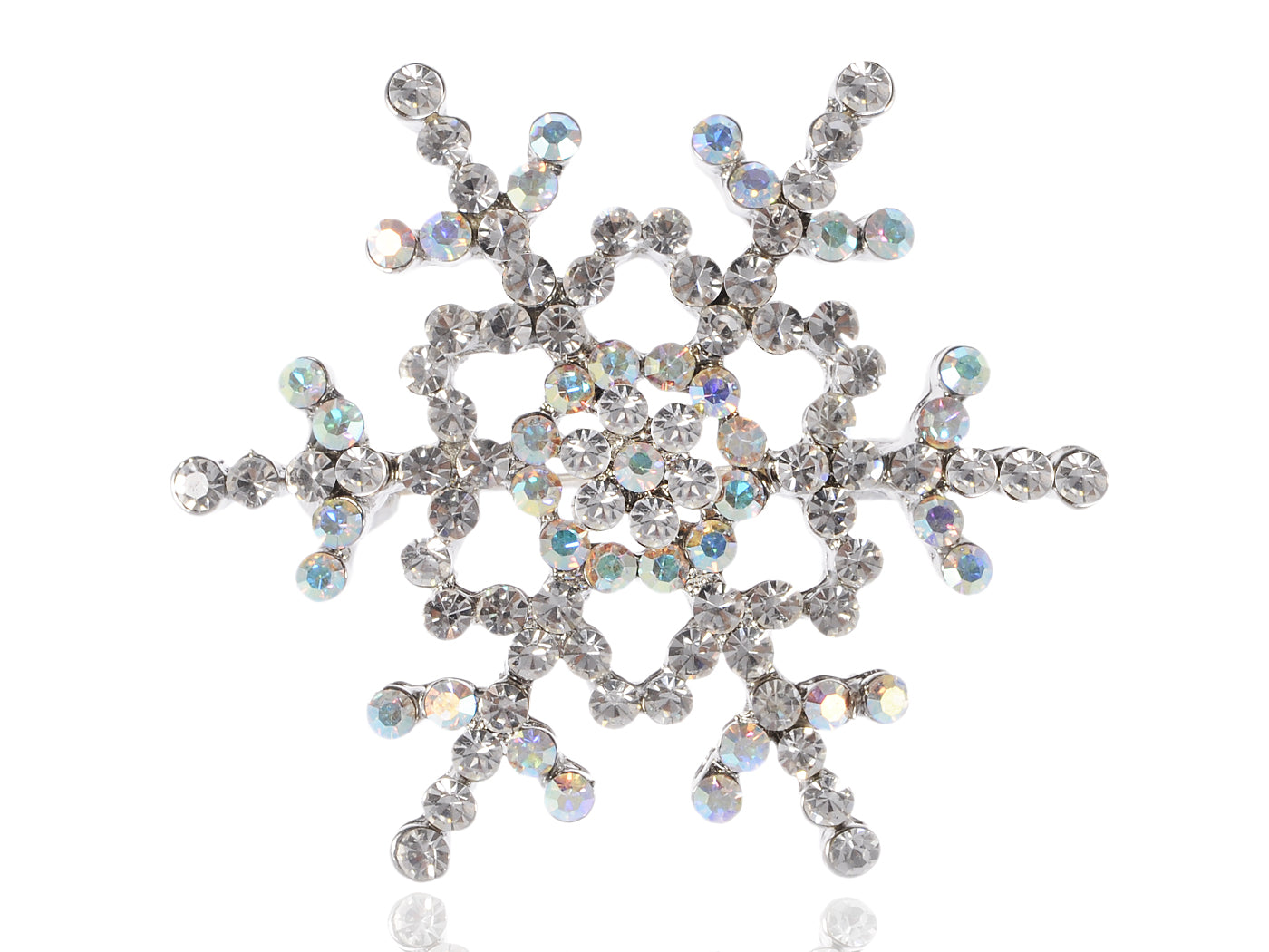 - UNIQUE DESIGN - Brooch featuring snowflake design with clear/aurora borealis colored rhinestones.