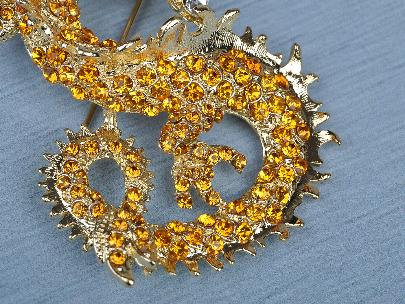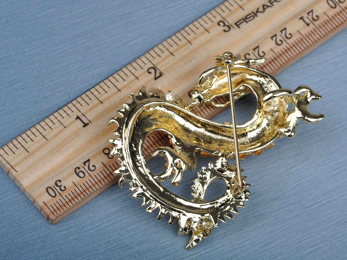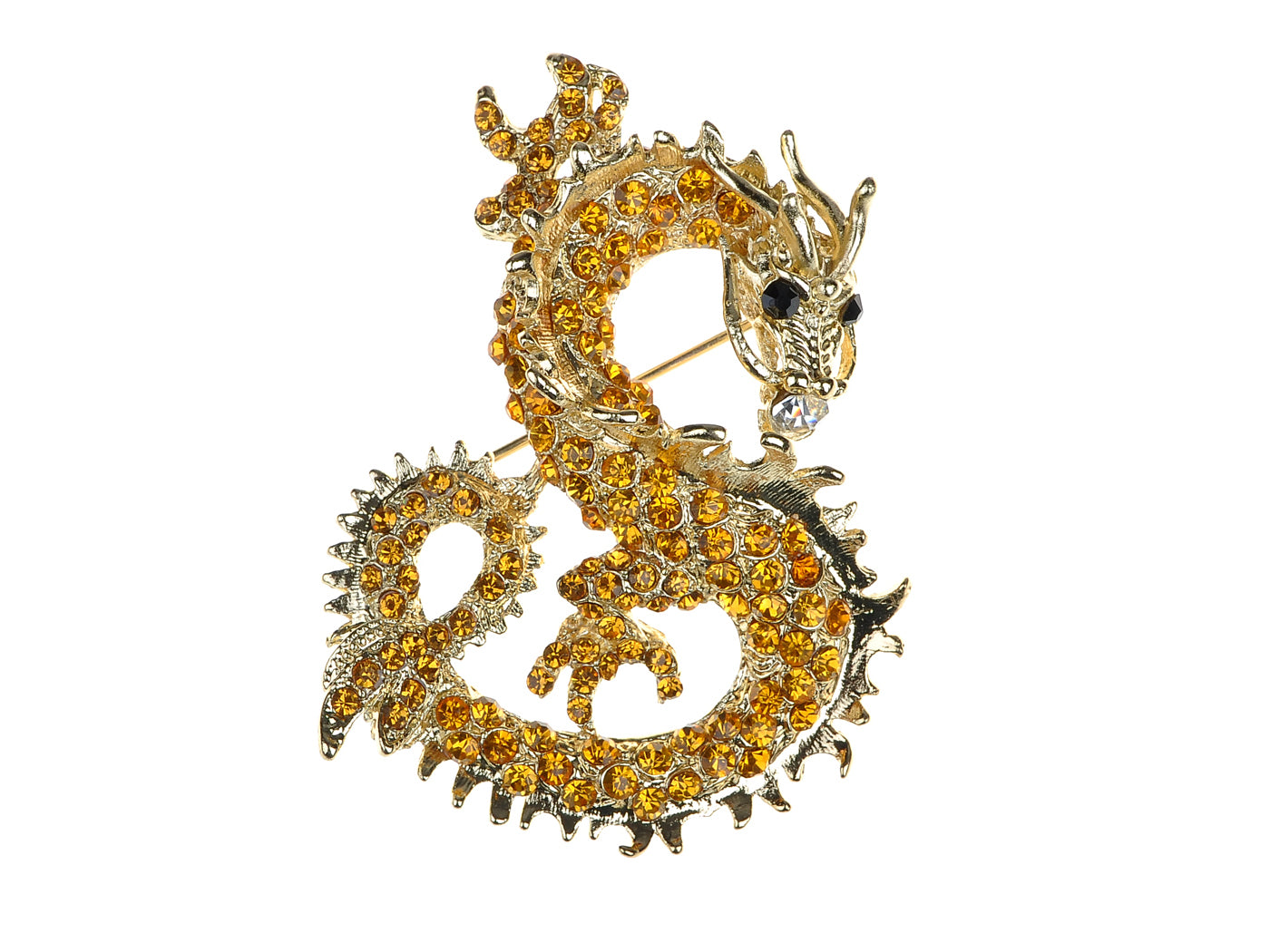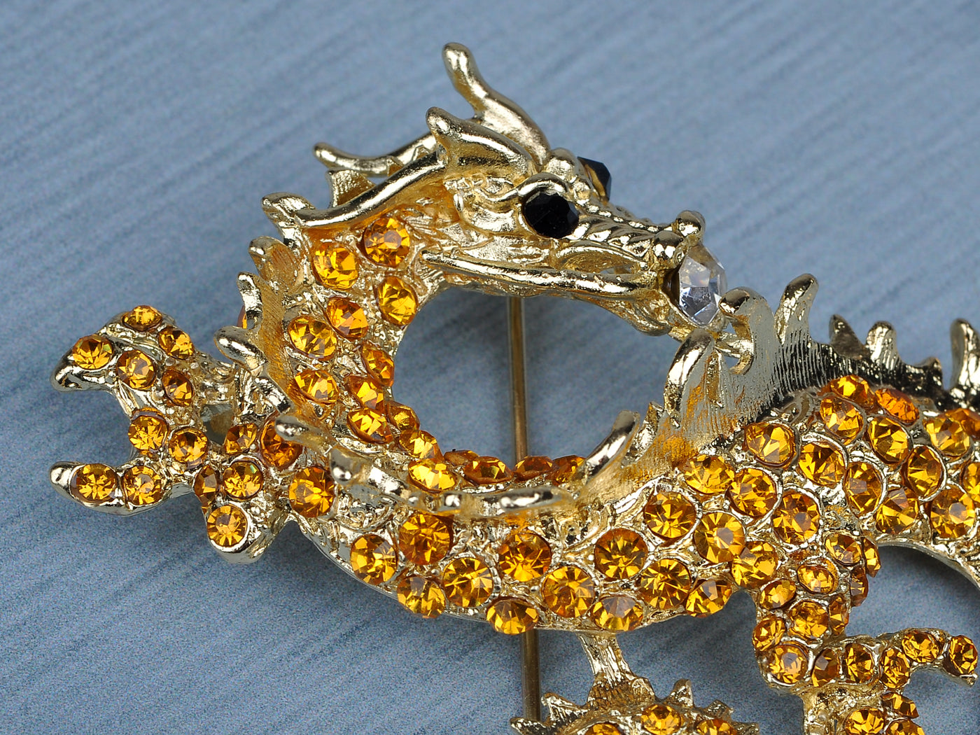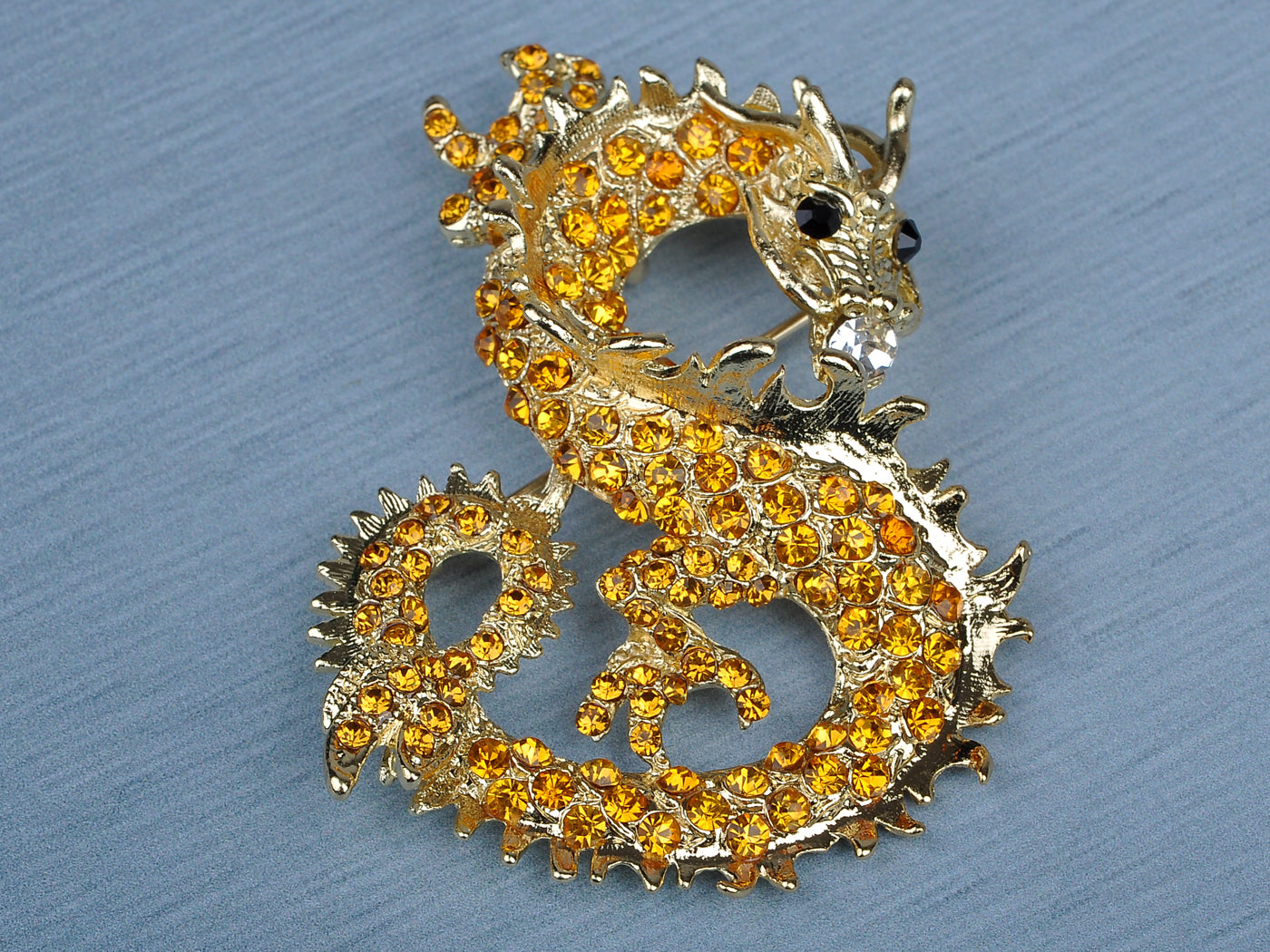 - UNIQUE DESIGN. Brooch featuring chinese dragon design with shinely topaz/black crystal rhinestones and golden tone meatl alloy base.