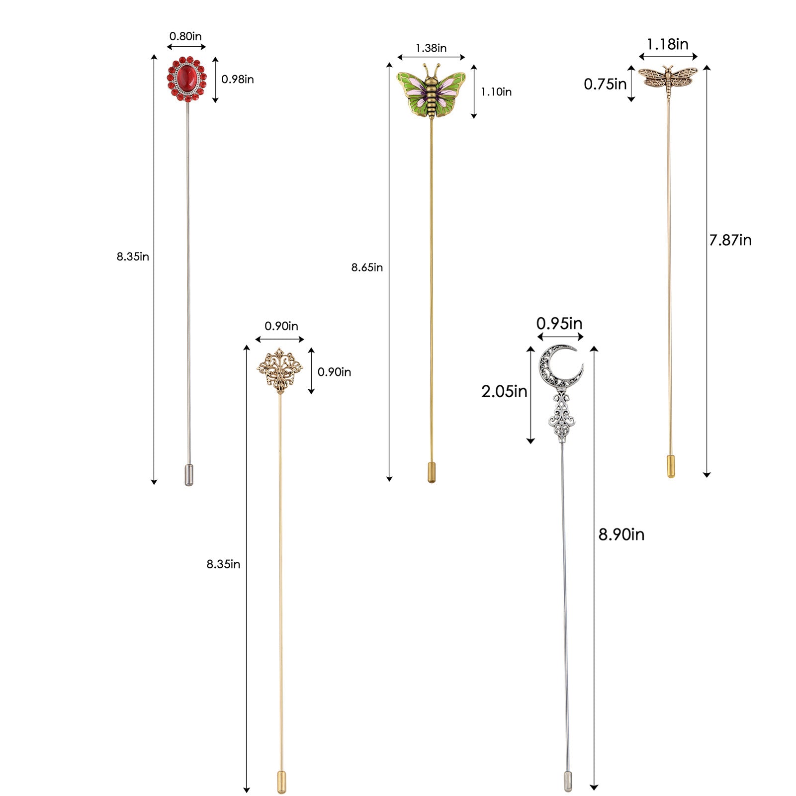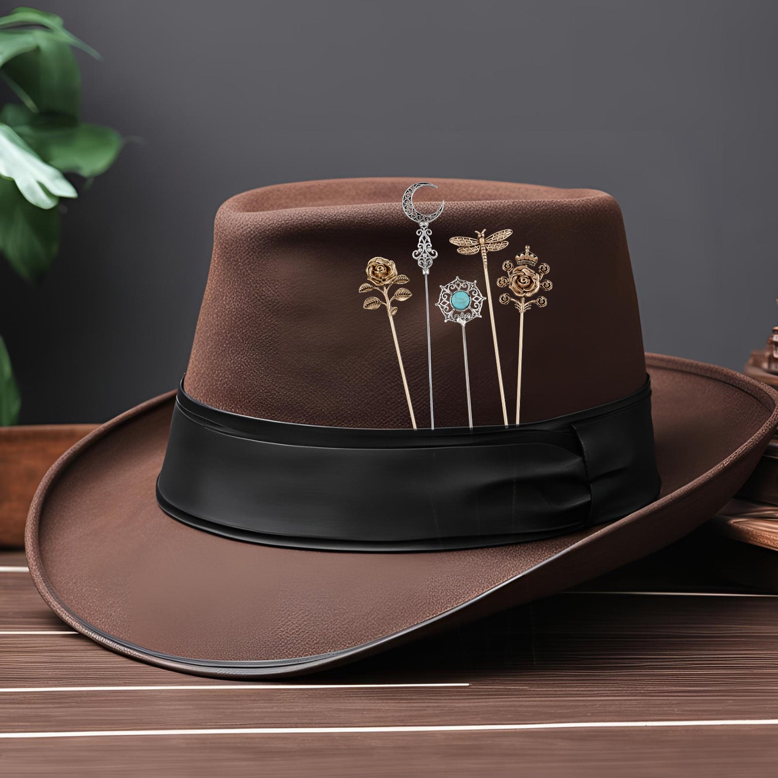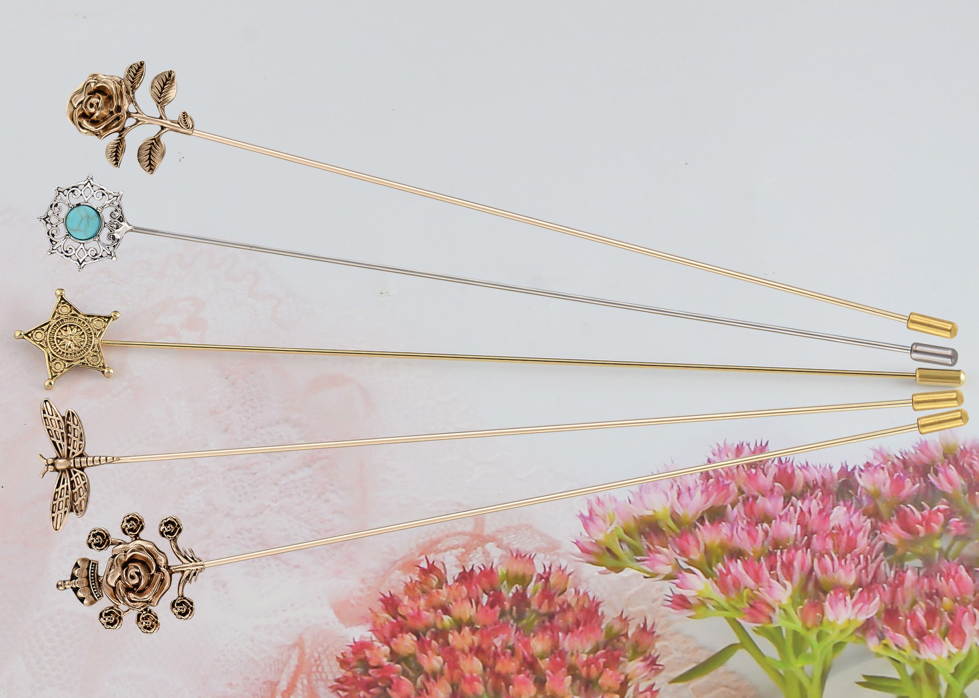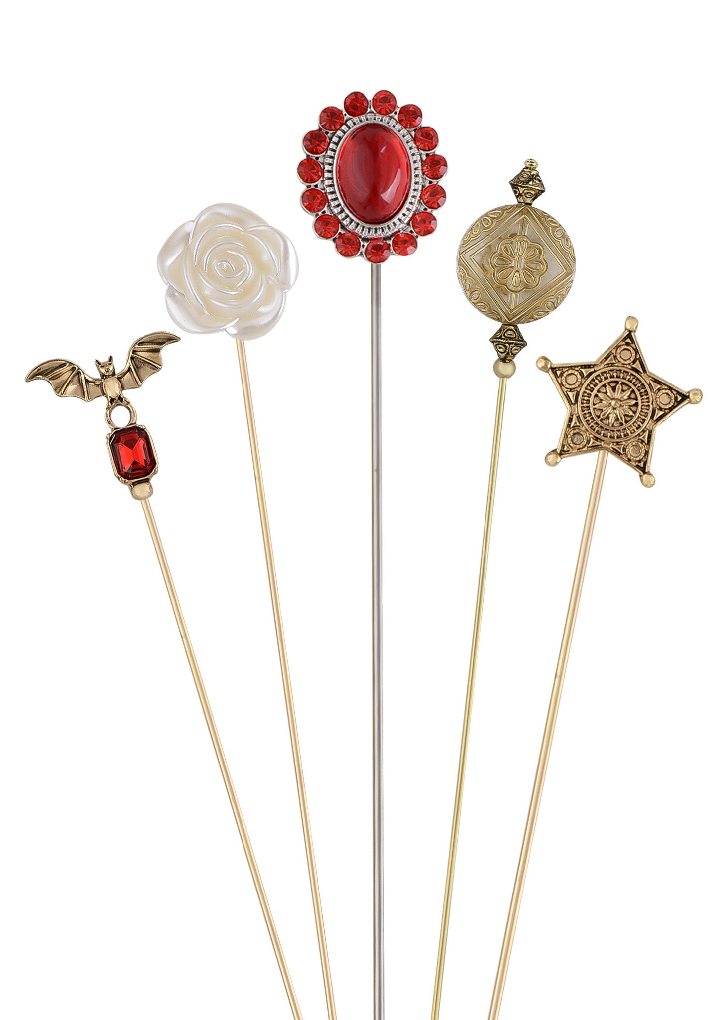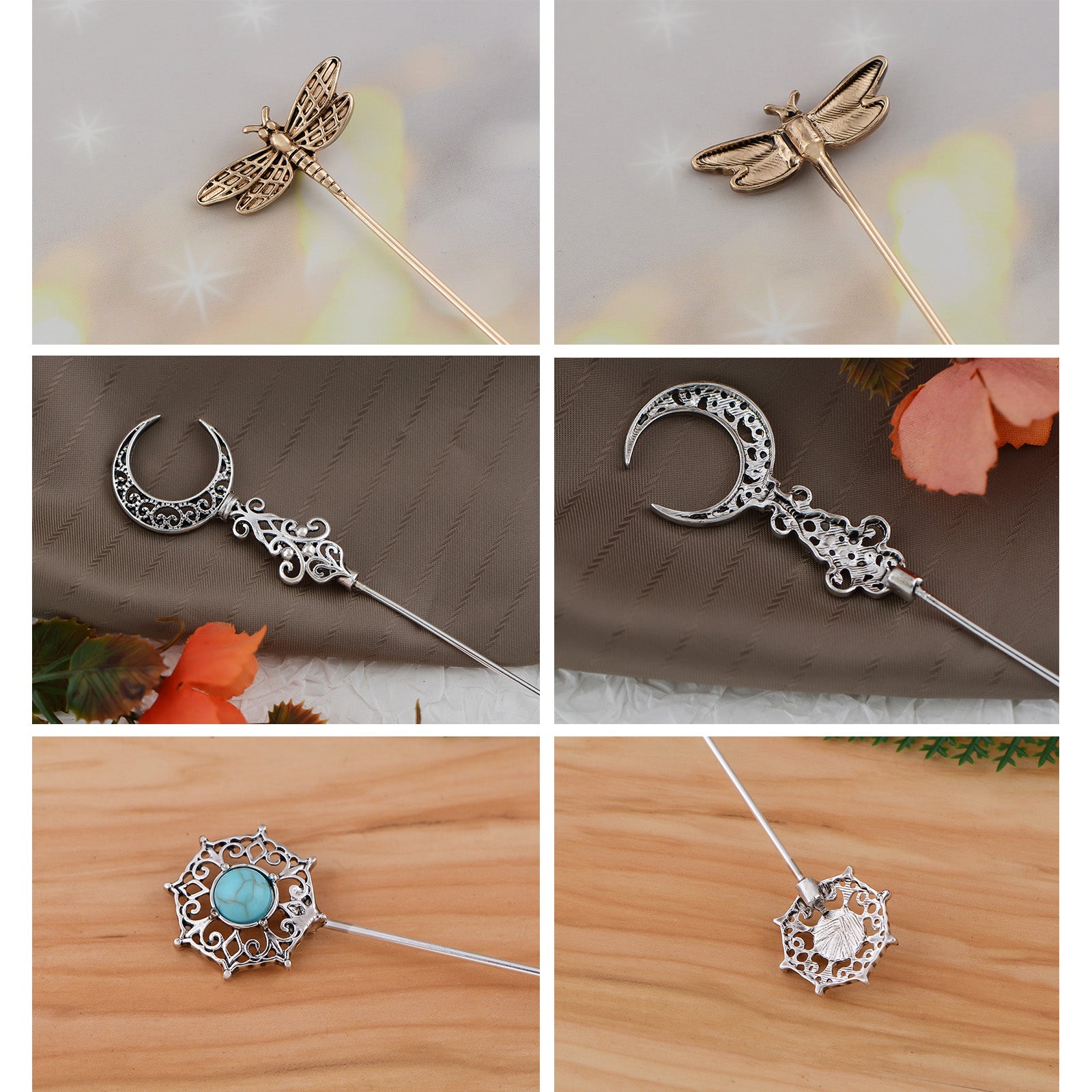 Add a touch of vintage charm to your accessories with this unique set of five decorative hat pins. Each pin features a distinct motif¡ªranging from crescent moon and star to floral and gemstone-inspired designs¡ªcrafted with antique-style metal finishes. The long pin shafts provide secure placement on hats, scarves, or lapels, while the mixed embellishments offer character and artistic flair. This versatile set is ideal for period styling, costume wear, or simply enhancing your everyday wardrobe with a nostalgic twist.