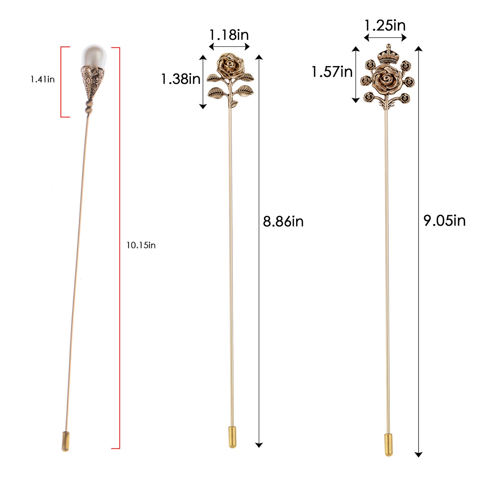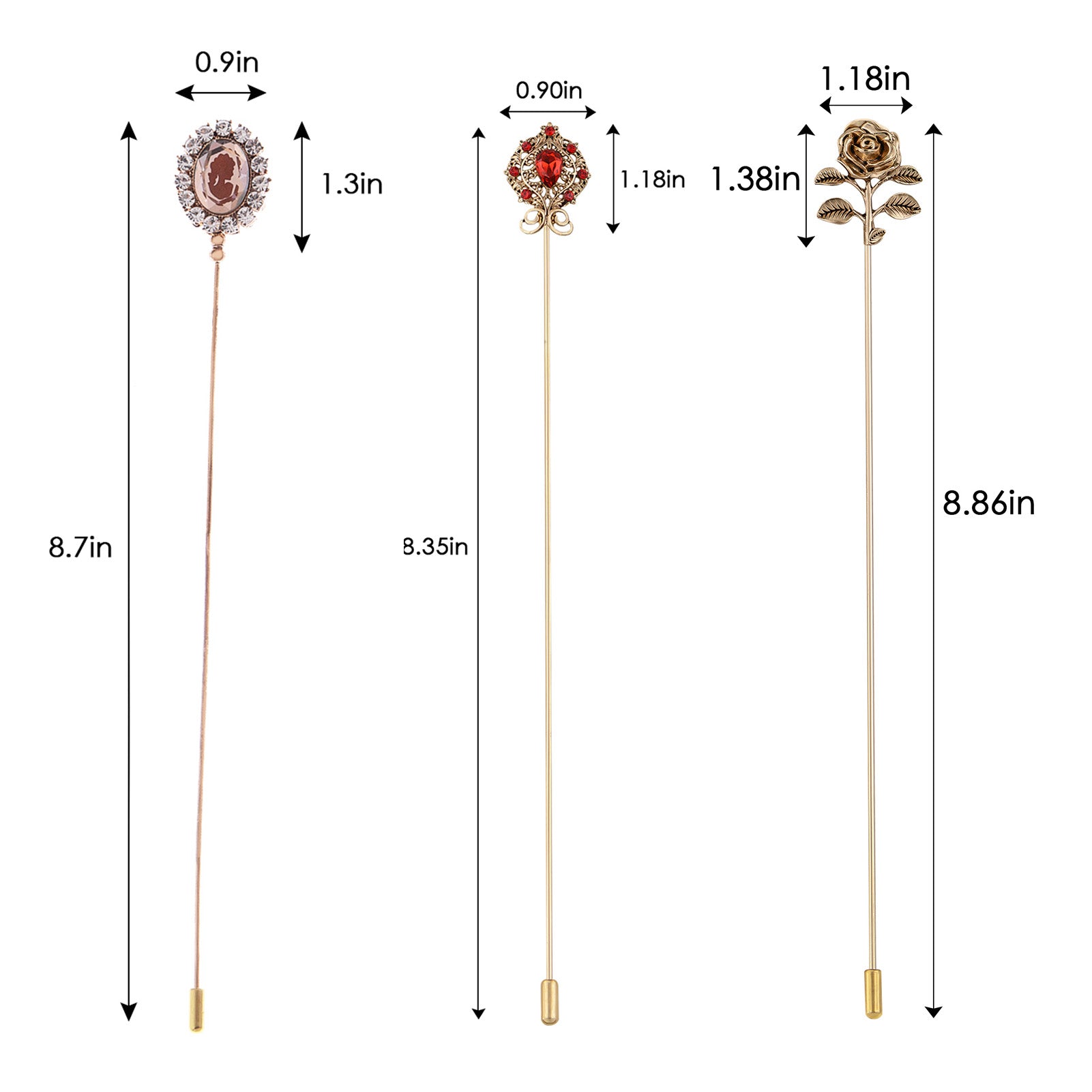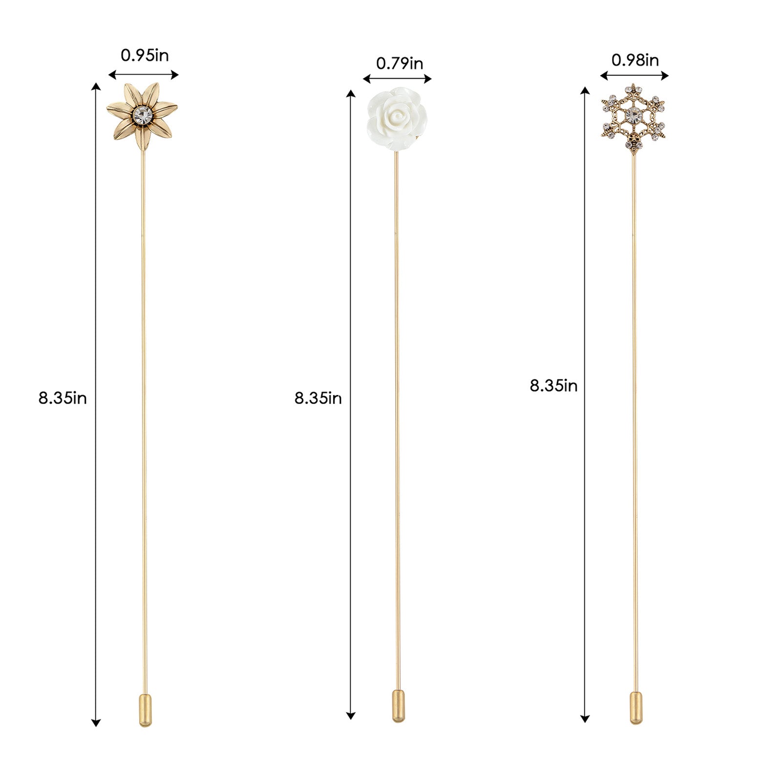 This elegant 3-piece hat pin set includes three uniquely styled pins to elevate any look with vintage charm. Featuring a sculpted white rose, a sparkling starburst with clear crystals, and an embossed petal flower with a central rhinestone, each pin is crafted with a slim, gold tone stick shaft for secure wear. Ideal for accessorizing hats, shawls, scarves, or lapels, these pins combine timeless floral elegance with delicate craftsmanship. Whether you're dressing up for a formal occasion or adding a hint of personality to everyday outfits, this set brings refinement and versatility.