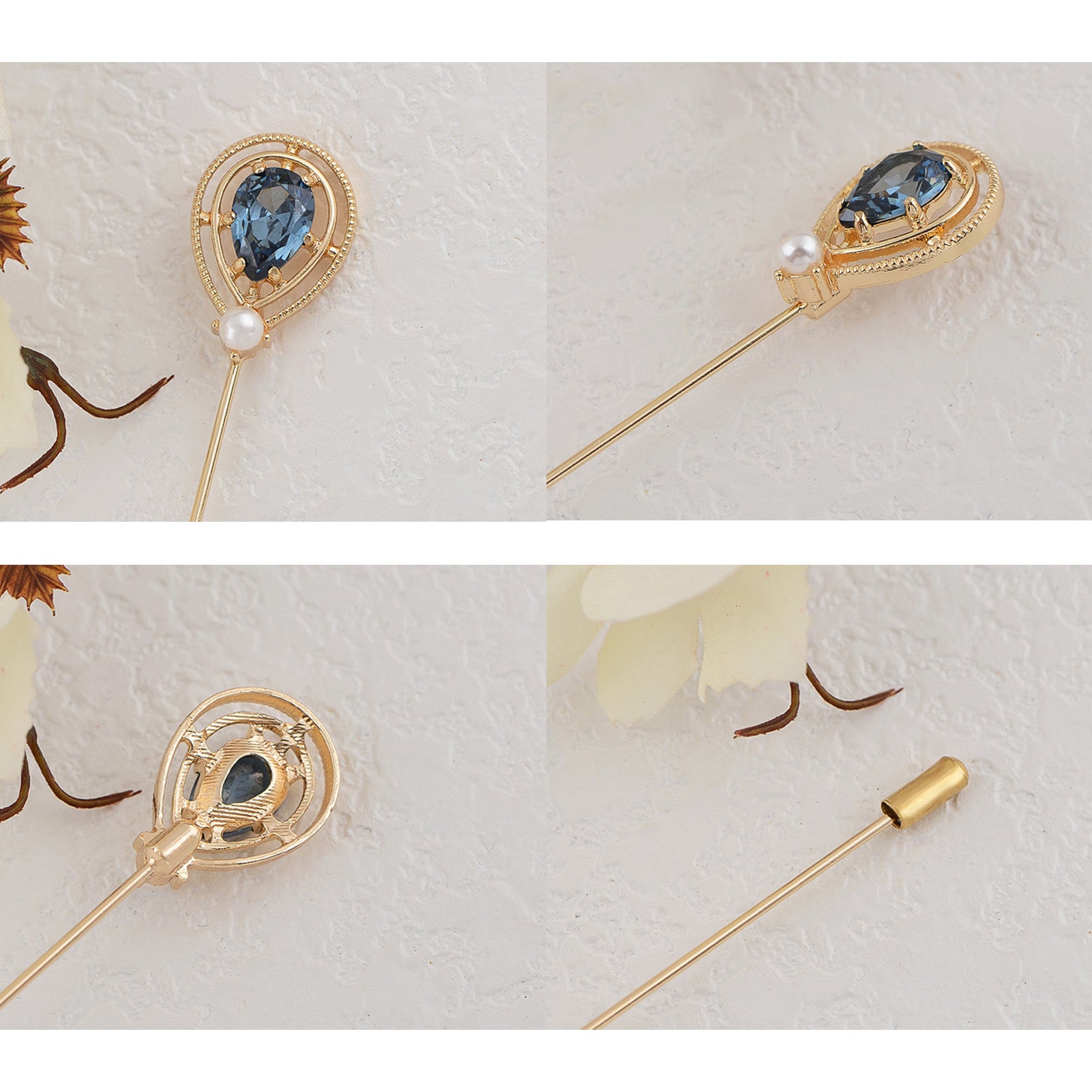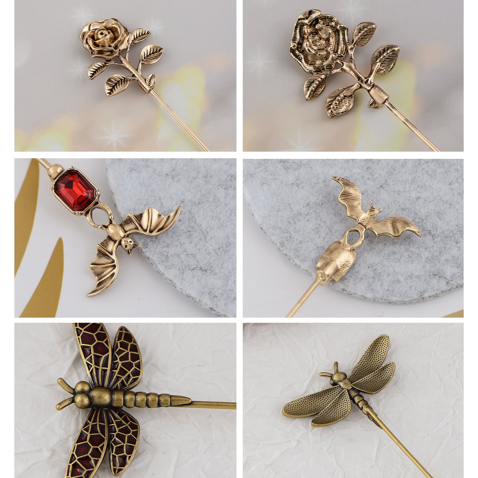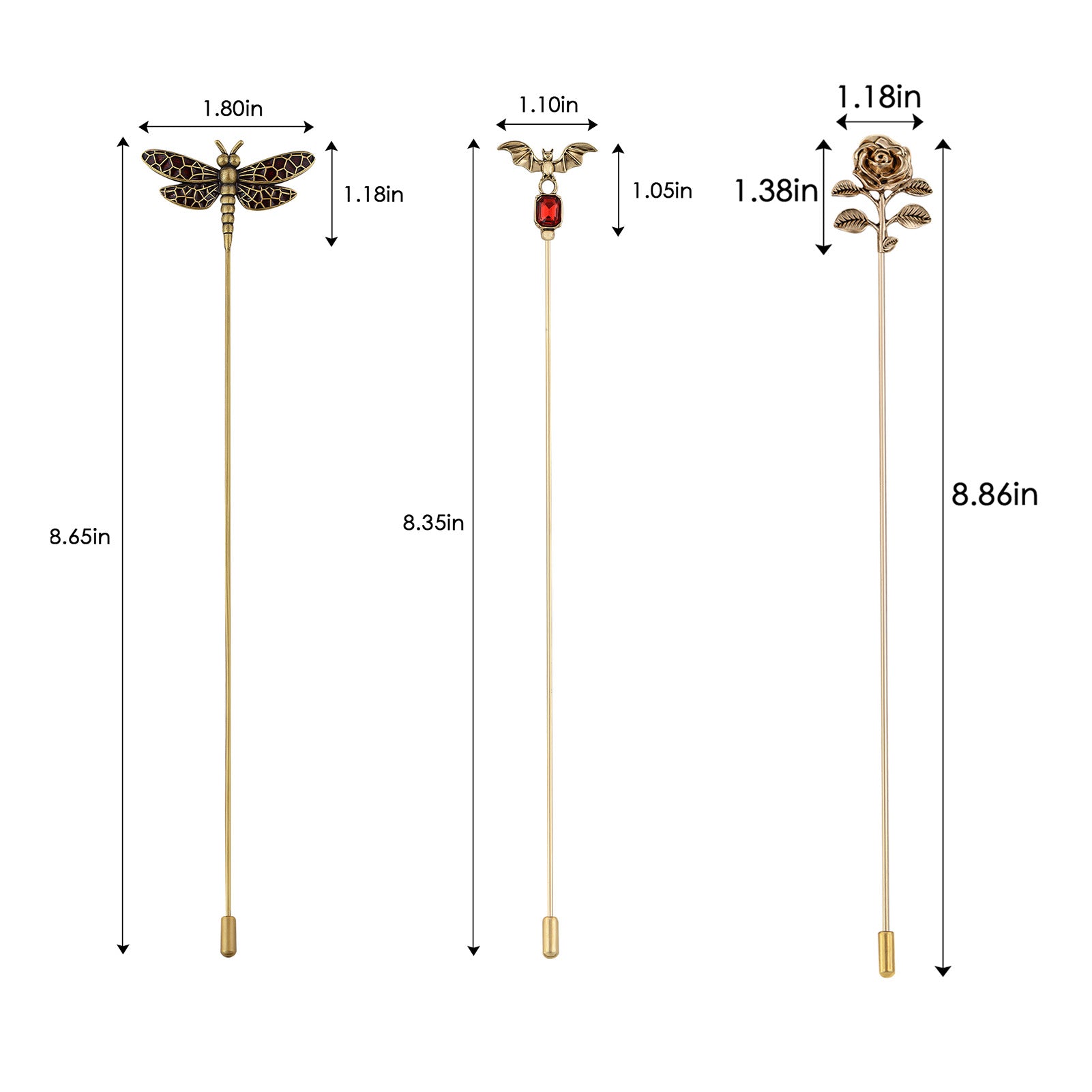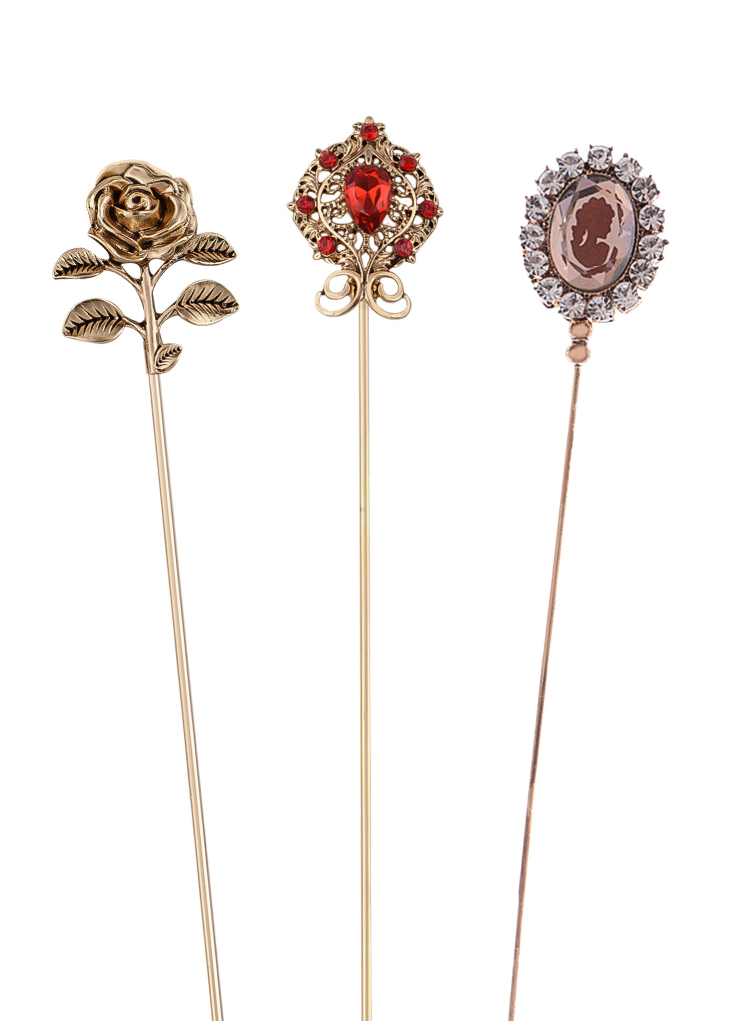 This elegant 3-piece hat pin set includes three uniquely styled pins to elevate any look with vintage charm. Featuring a sculpted white rose, a sparkling starburst with clear crystals, and an embossed petal flower with a central rhinestone, each pin is crafted with a slim, gold tone stick shaft for secure wear. Ideal for accessorizing hats, shawls, scarves, or lapels, these pins combine timeless floral elegance with delicate craftsmanship. Whether you're dressing up for a formal occasion or adding a hint of personality to everyday outfits, this set brings refinement and versatility.