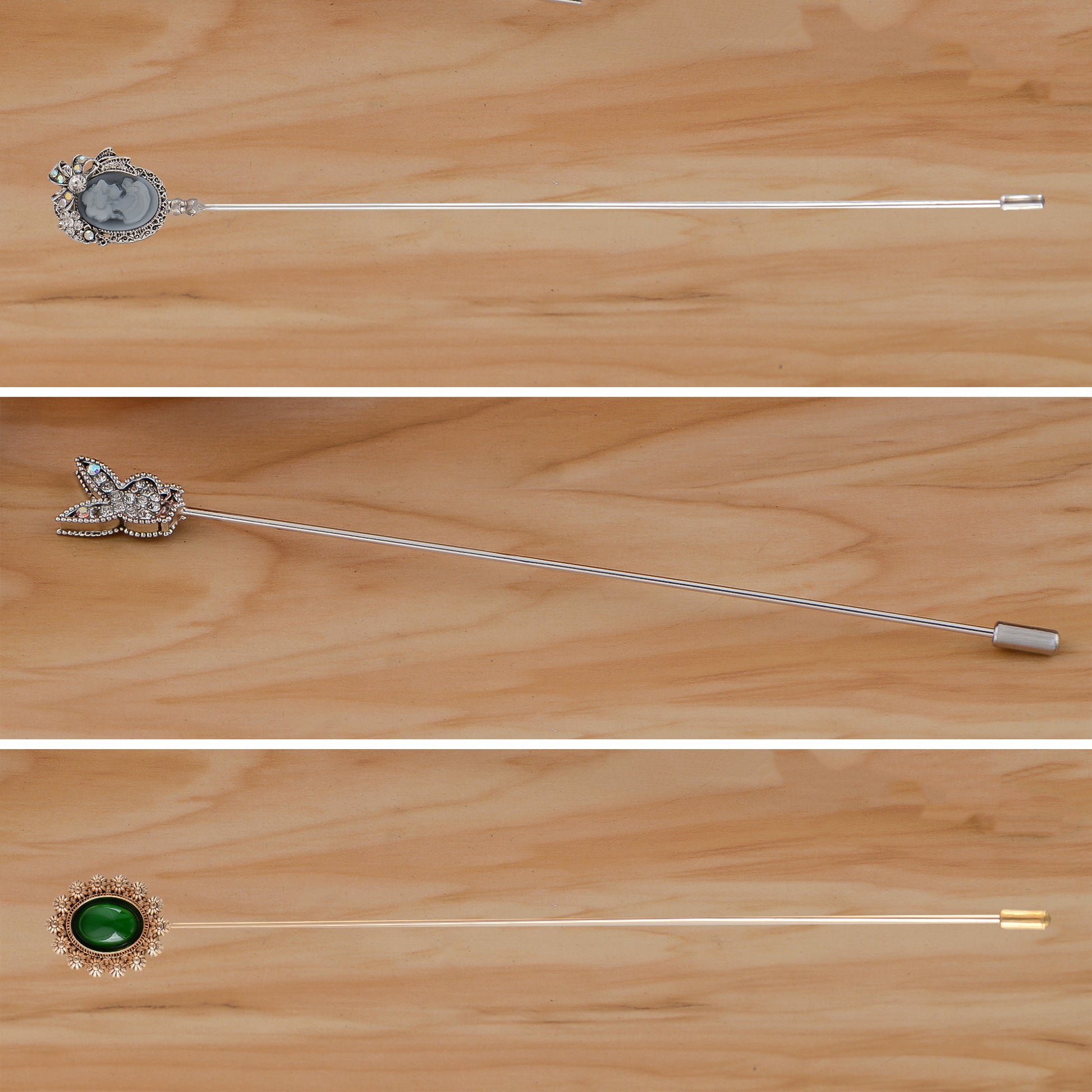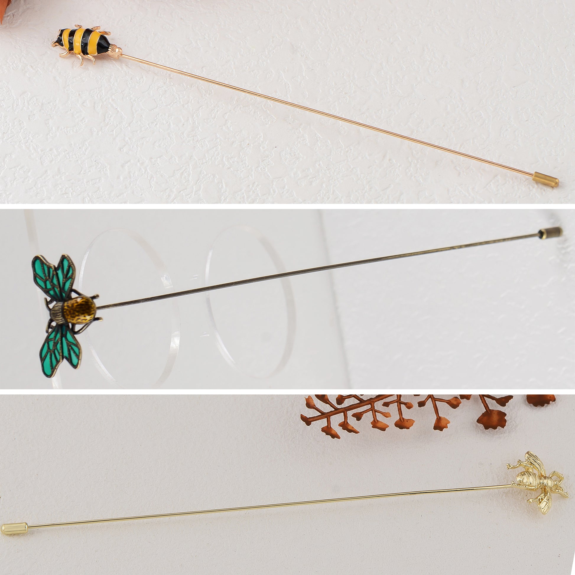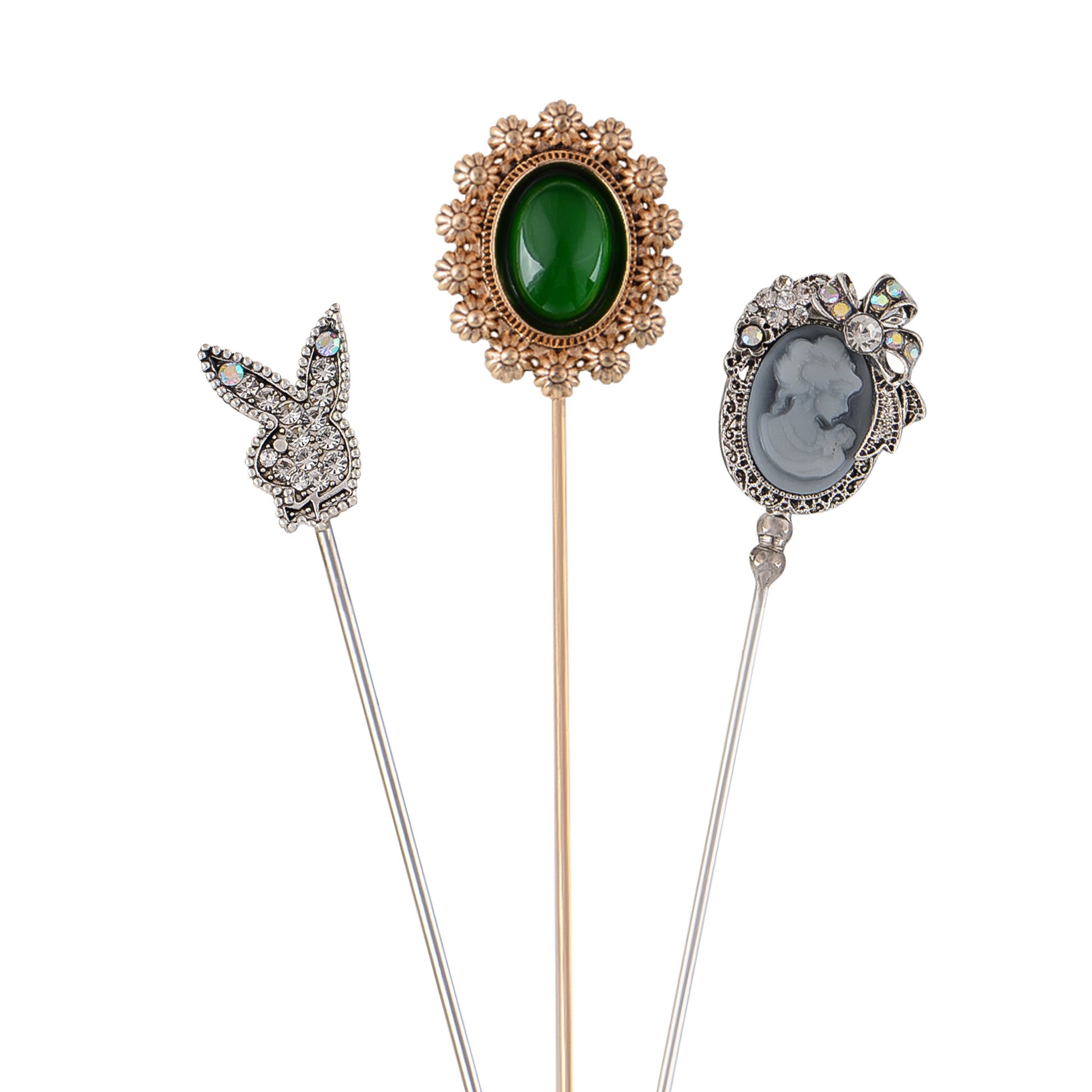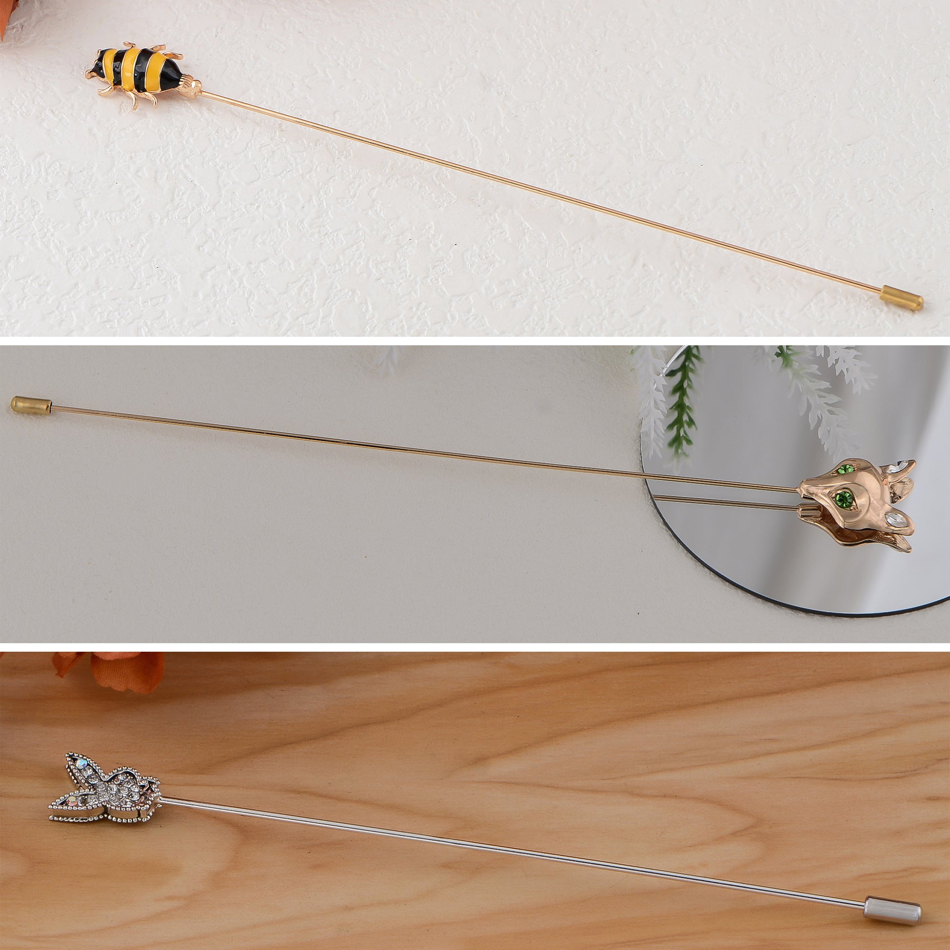 This set of three hat pin brooches features a variety of whimsical and elegant designs including animals, florals, and vintage motifs. Each pin is flexible for bending and comes with a secure safety cap for easy wear on hats, jackets, bags, or lapels. A creative way to elevate any outfit with personalized flair.