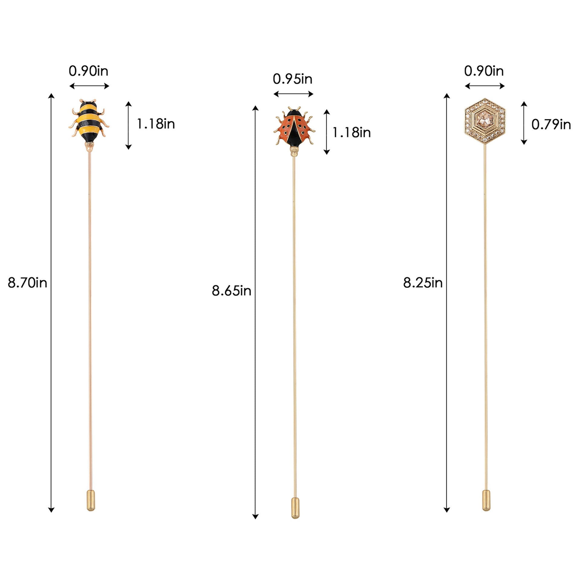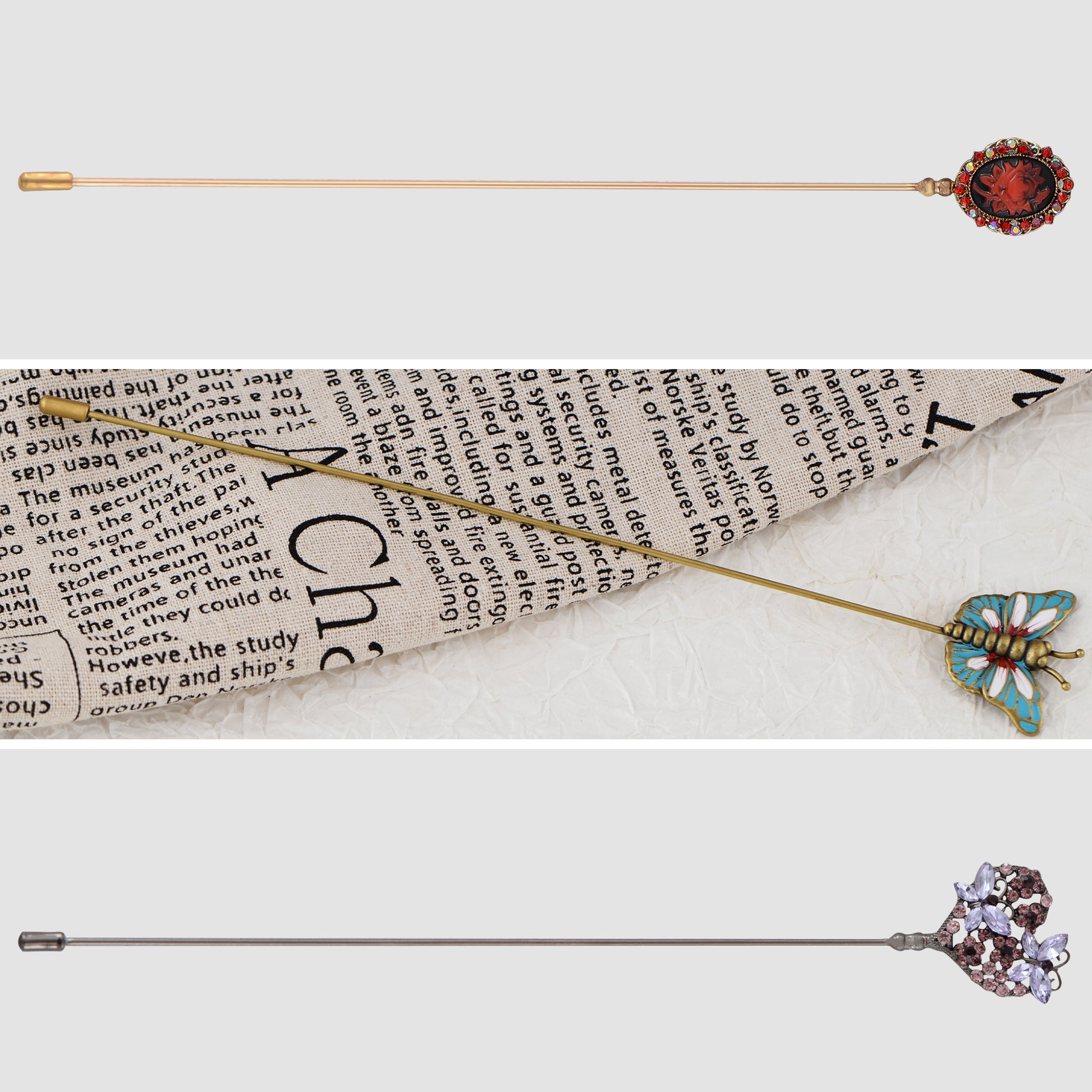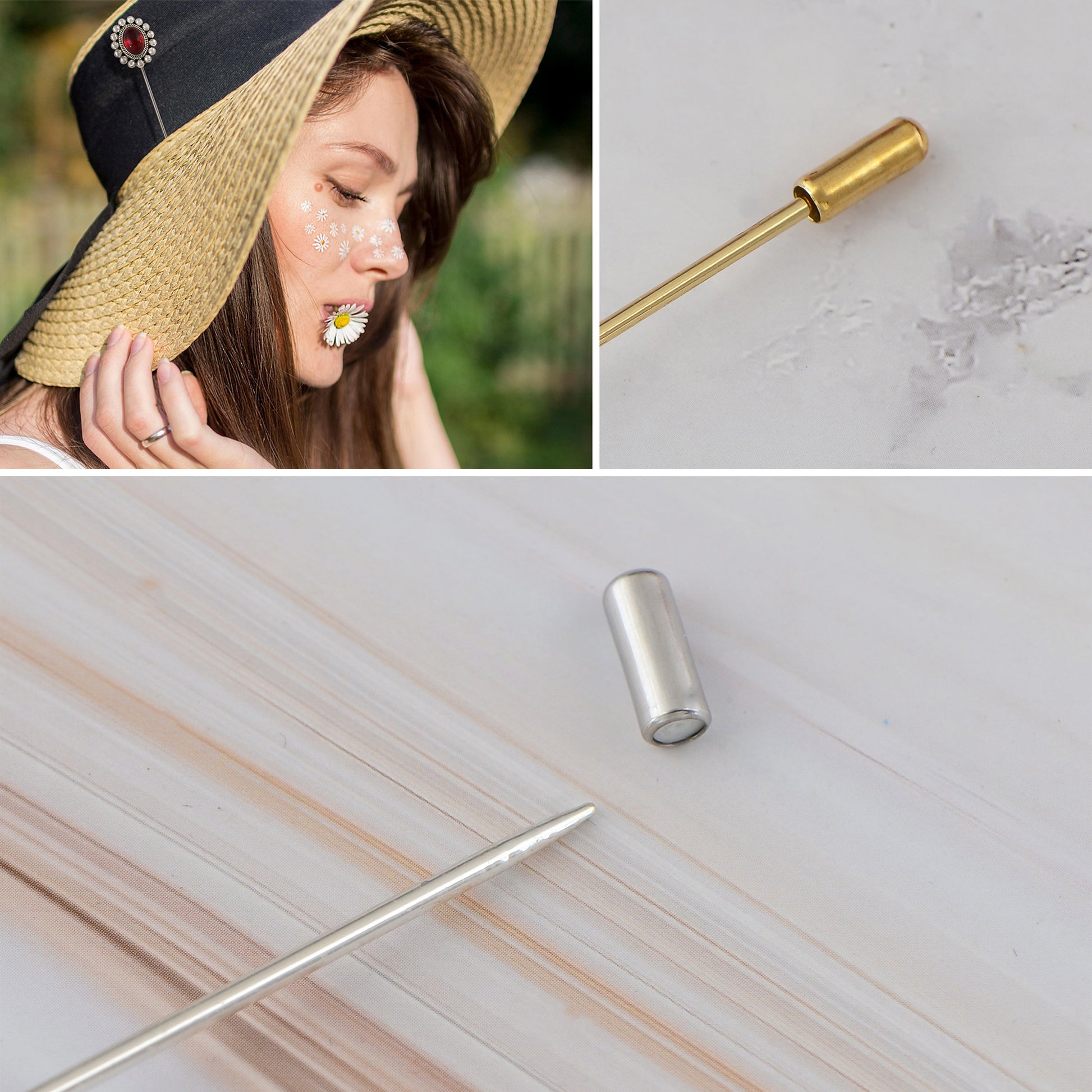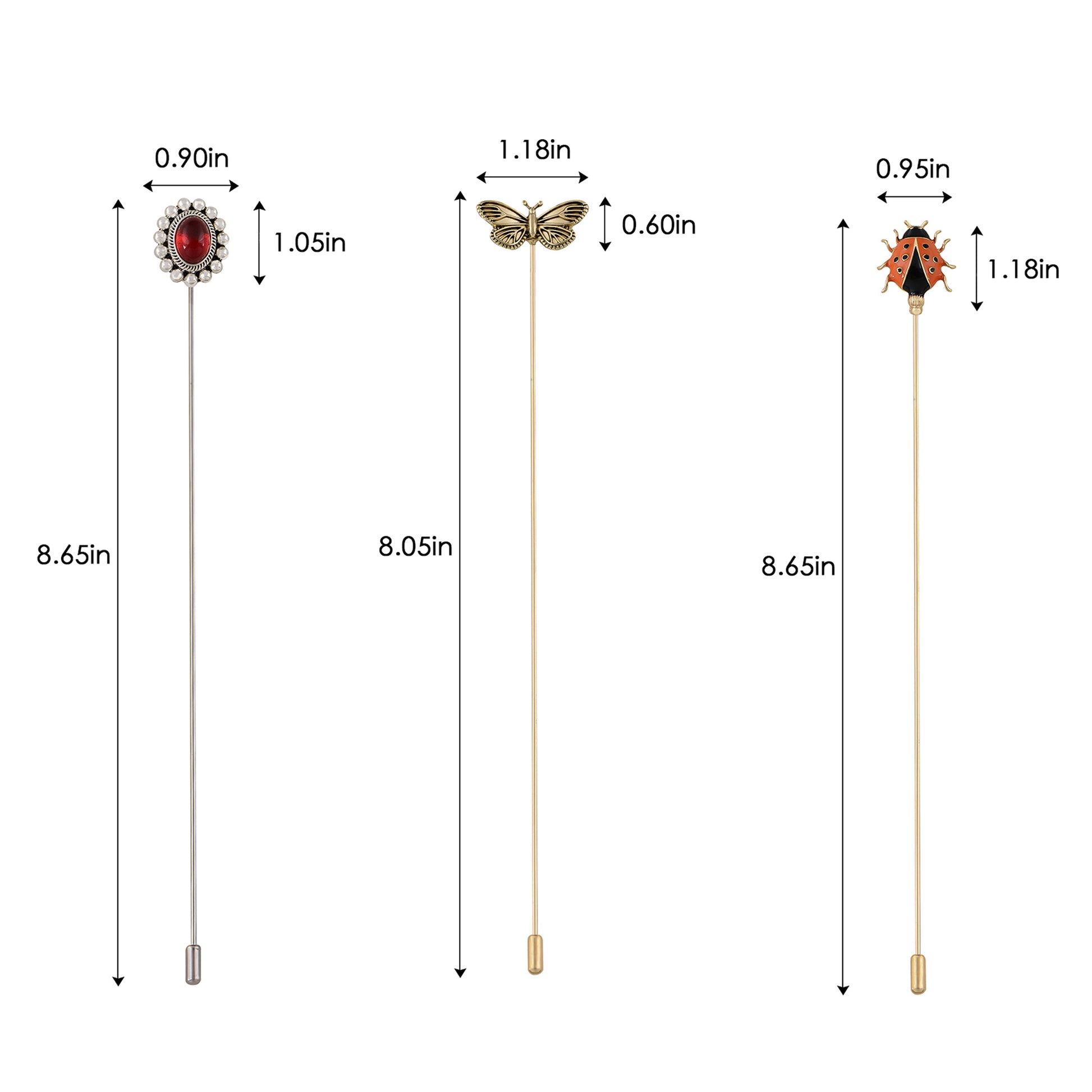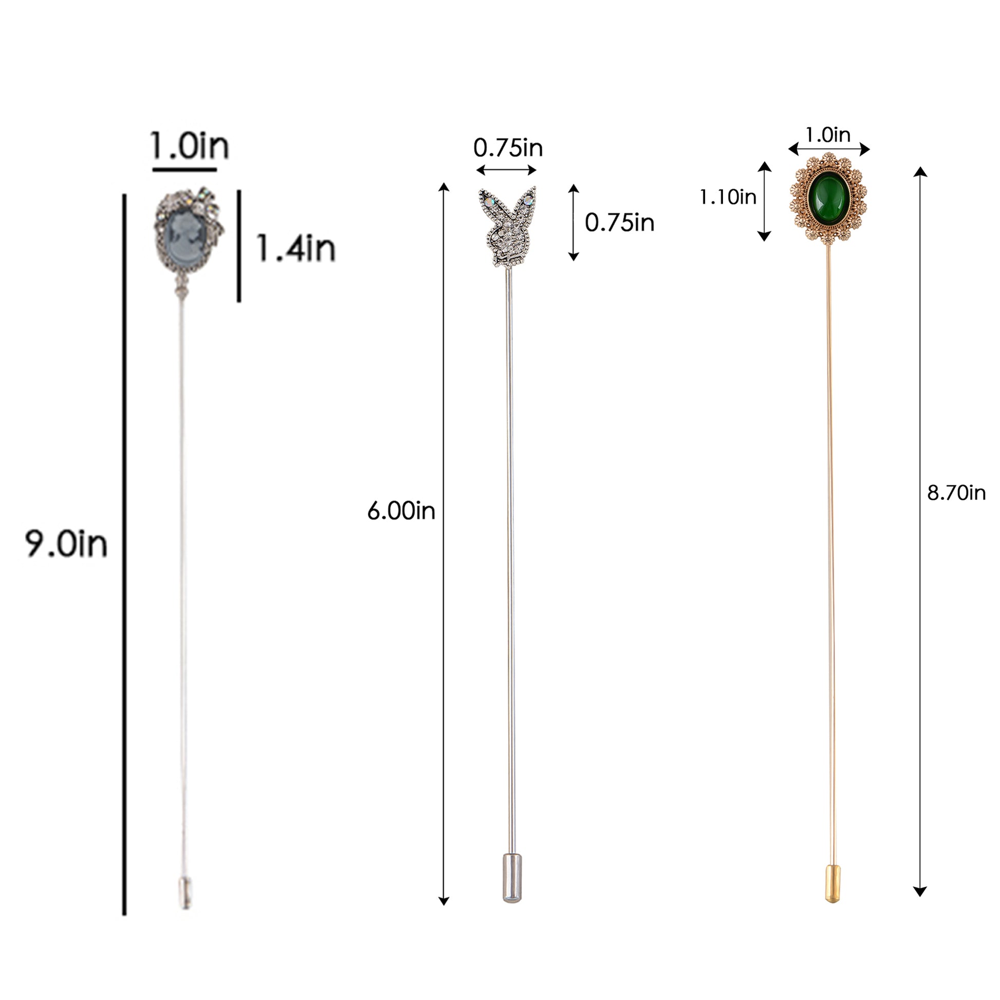This set of three hat pin brooches features a variety of whimsical and elegant designs including animals, florals, and vintage motifs. Each pin is flexible for bending and comes with a secure safety cap for easy wear on hats, jackets, bags, or lapels. A creative way to elevate any outfit with personalized flair.
