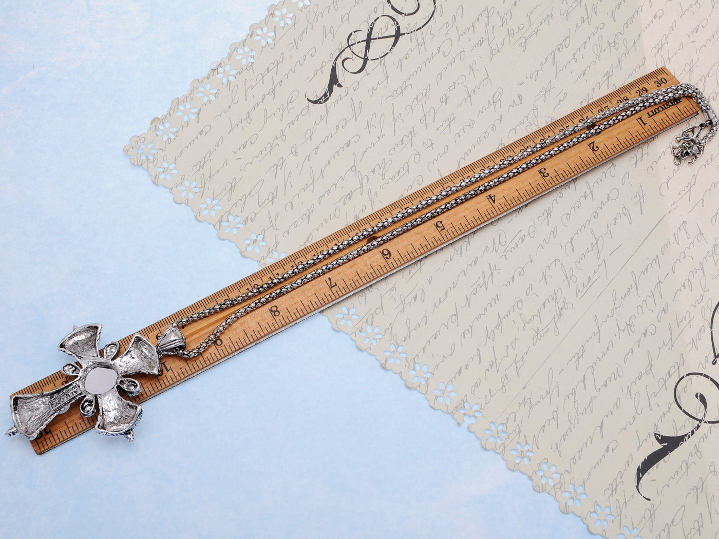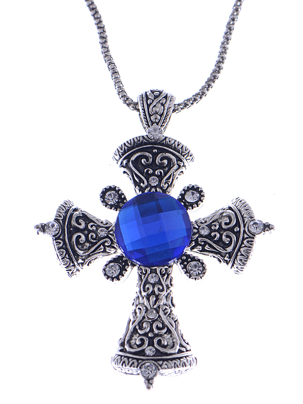 - UNIQUE DESIGN - Chain necklace featuring cross charm with clear colored rhinestones and one sapphire colored gemstone.