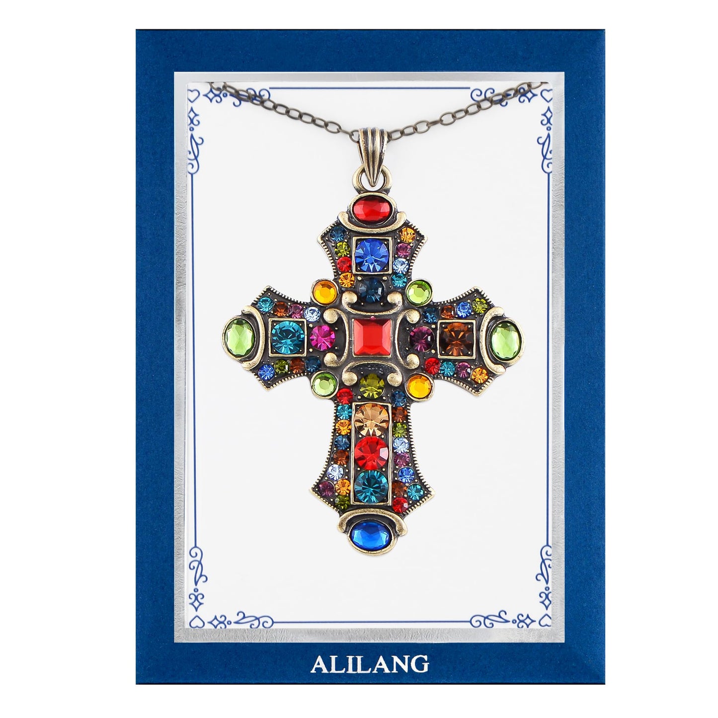 Beautiful Necklace: The timeless cross necklace is adorned with church stained-glass multicolored rhinestone gems over an antique gold tone, metal alloy base. These safe materials are hypoallergenic with oxidation resistance. Features an adjustable chain necklace that 's 14.37 inches long when straightened. Pendant size: 2.36 inch width x 3.74 inch height.