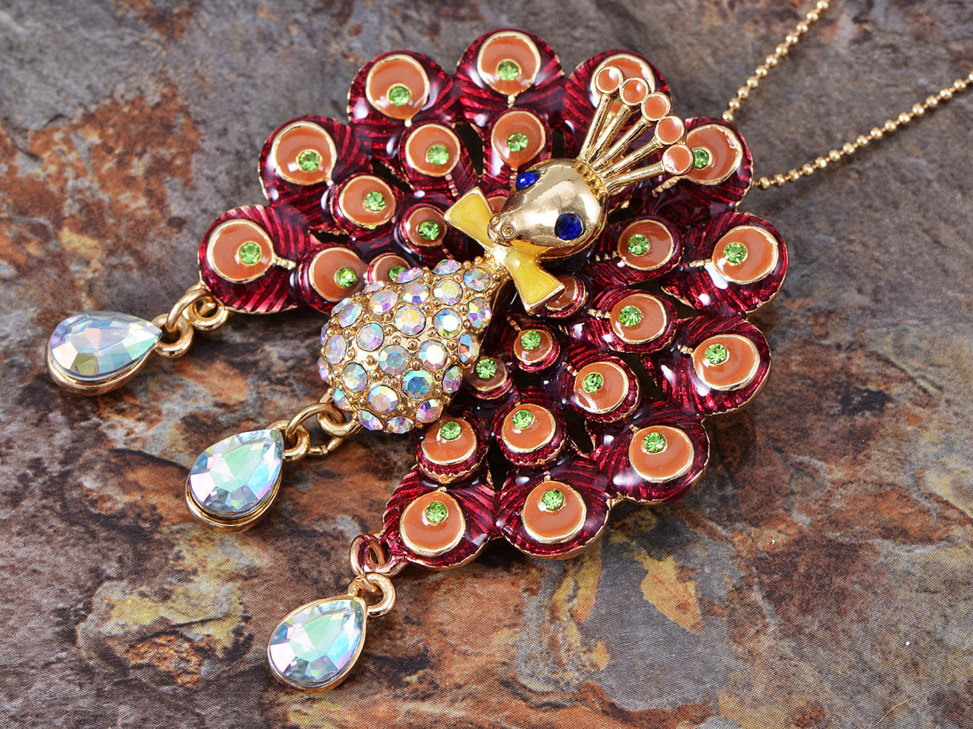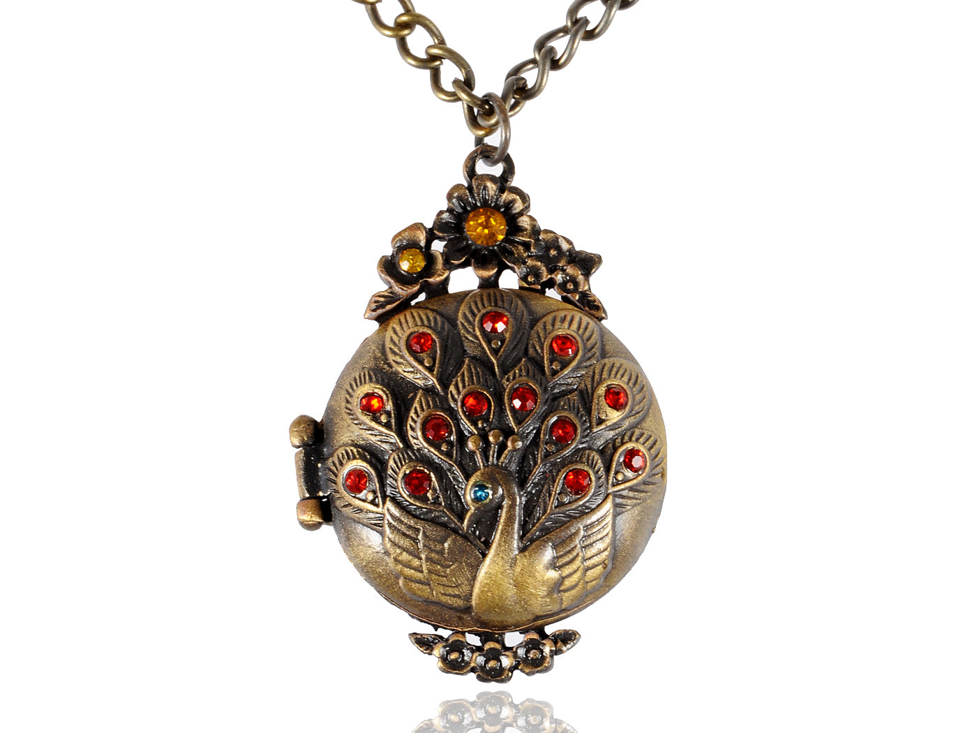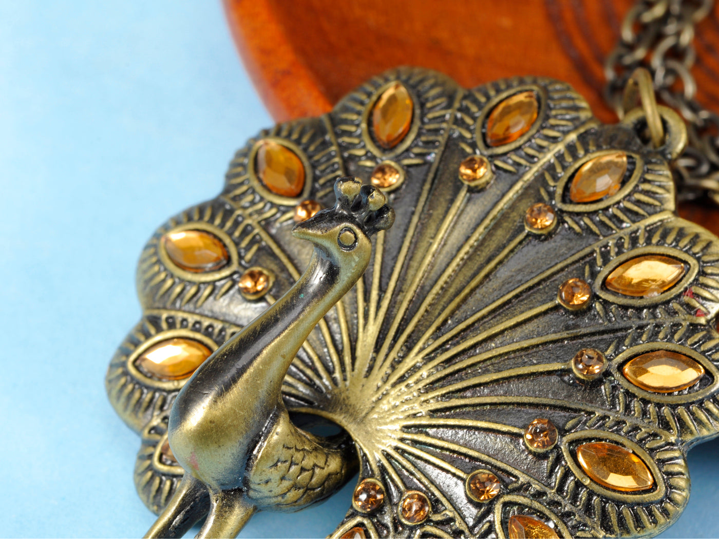 - GLITTERING CRYSTALS. The beautiful, fanned out peacock feather tail features sparkly topaz colored crystals throughout. The metal of the pendant and cable chain has an antiqued finish, to make the necklace feel like an authentic vintage piece.
