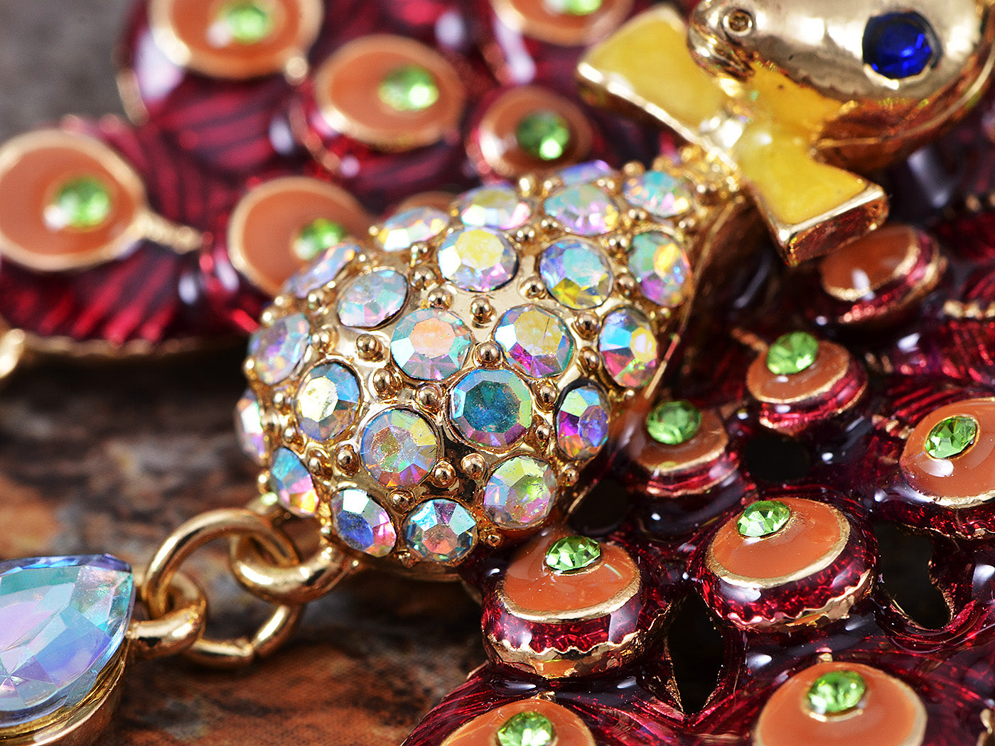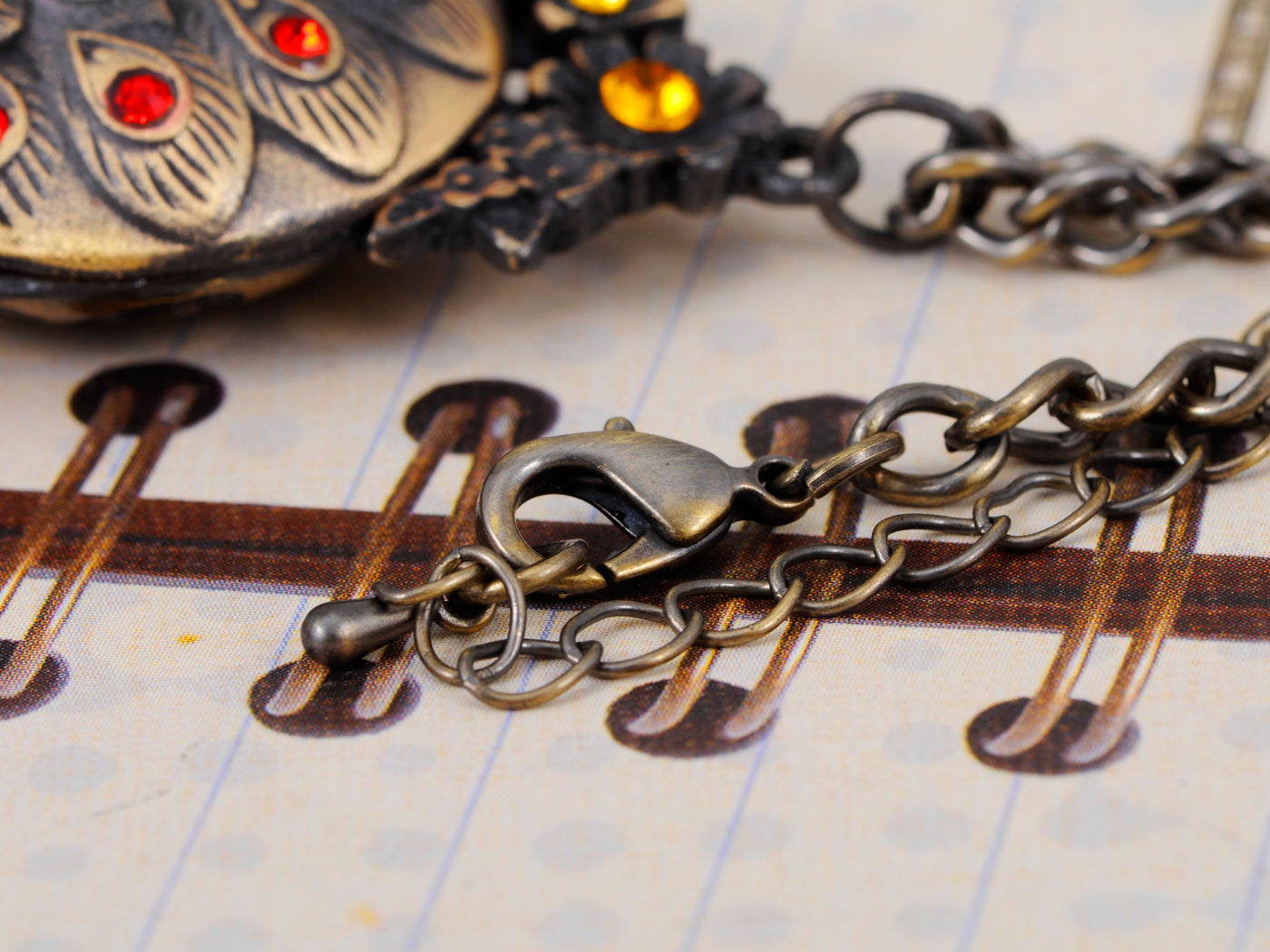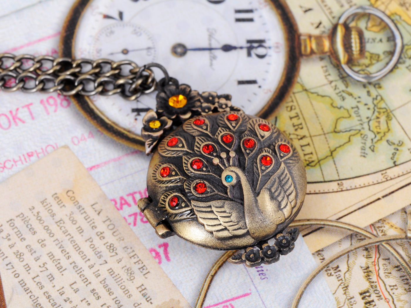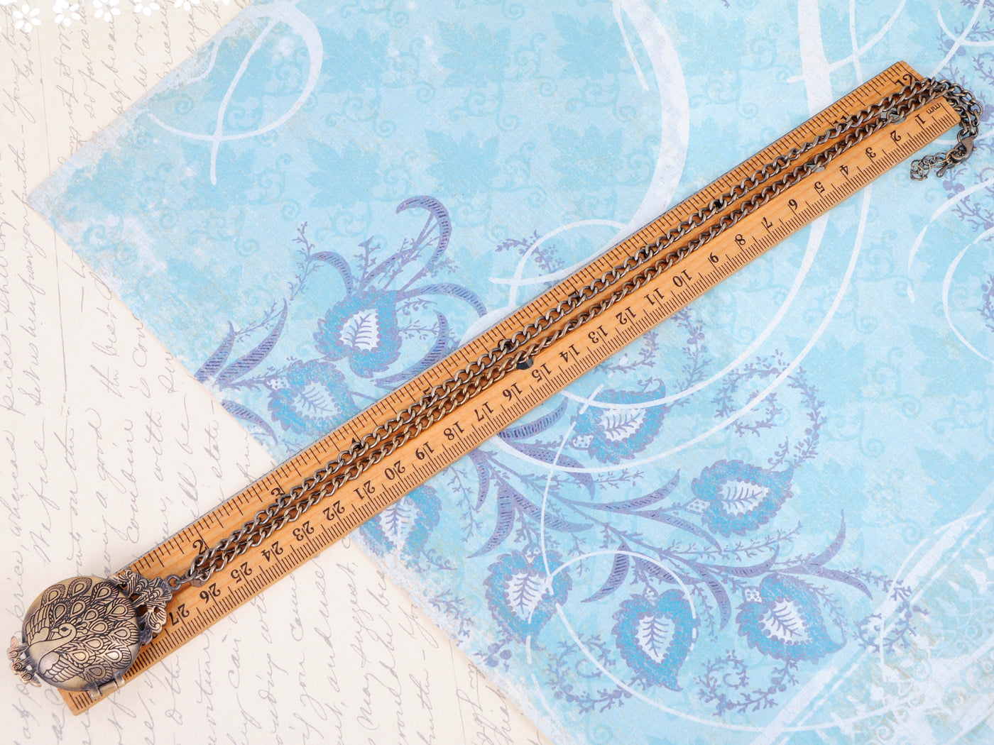 - GLITTERING CRYSTALS. The beautiful, fanned out peacock feather tail features sparkly topaz colored crystals throughout. The metal of the pendant and cable chain has an antiqued finish, to make the necklace feel like an authentic vintage piece.