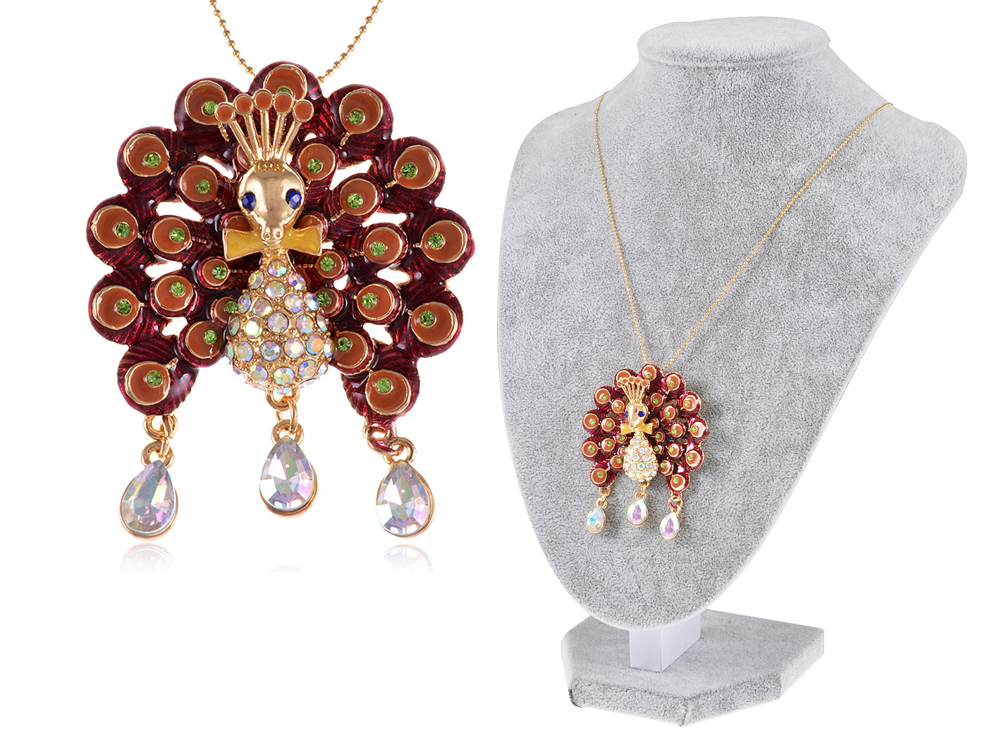 - ELEGANT AND UNIQUE. This peacock pendant has a unique, 3-D design. Delicate carvings in the golden toned metal highlight the details of the bird's feathers and plumes. The standing peacock juts out slightly from the tail, proving that this necklace will stand out from the crowd.