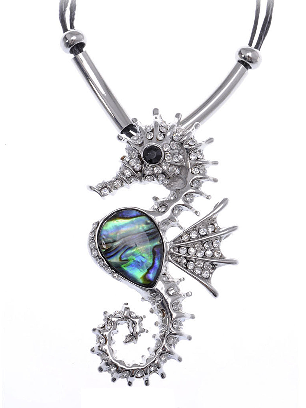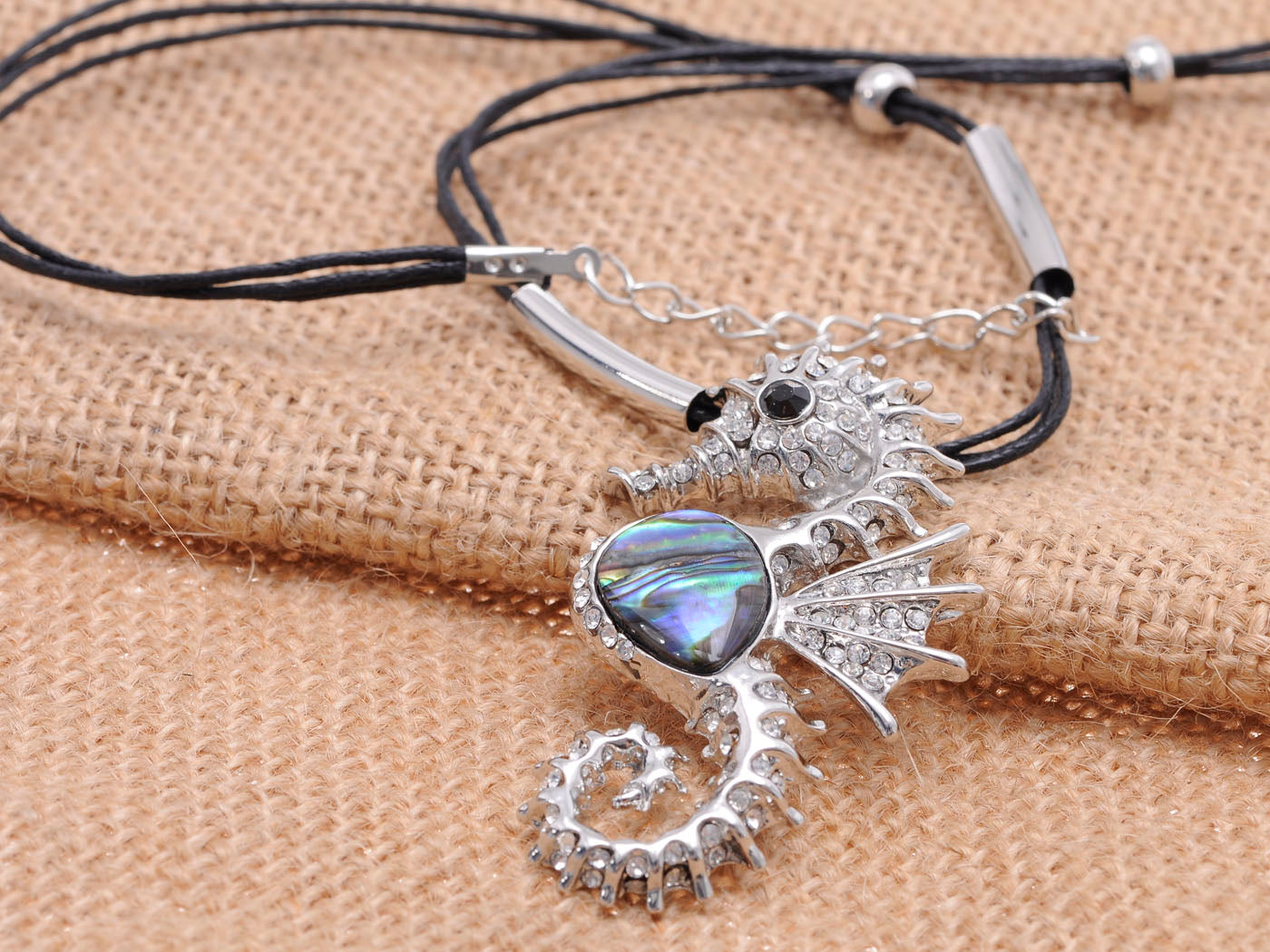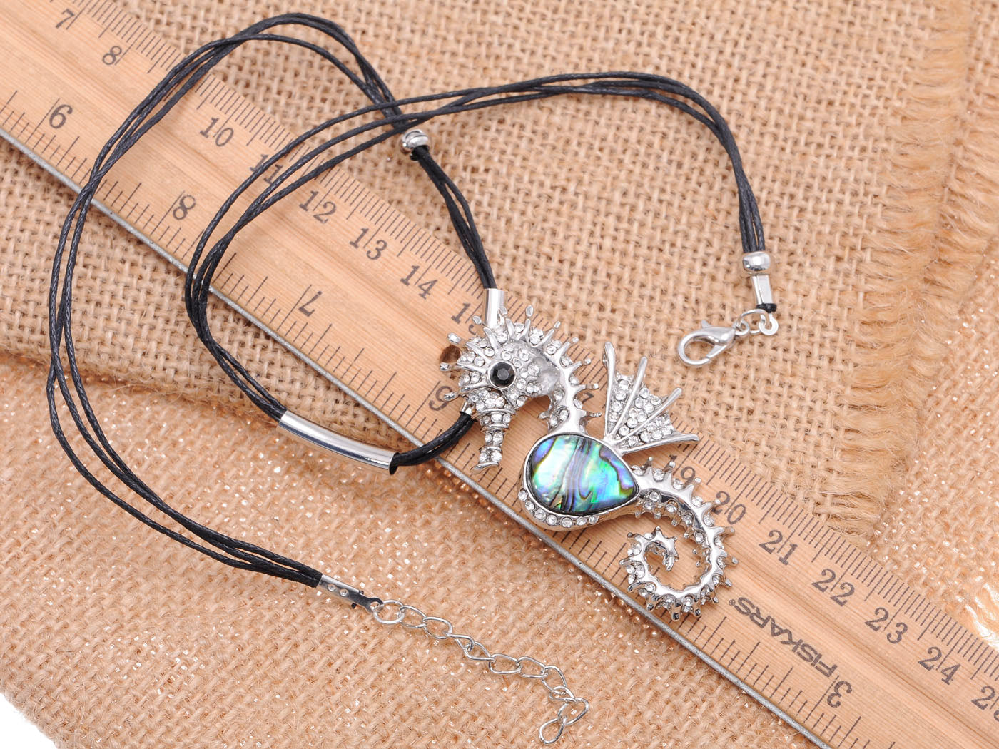 - UNIQUE DESIGN - Cord chain necklace featuring seahorse charm with abalone colored stone and clear colored rhinestones.
