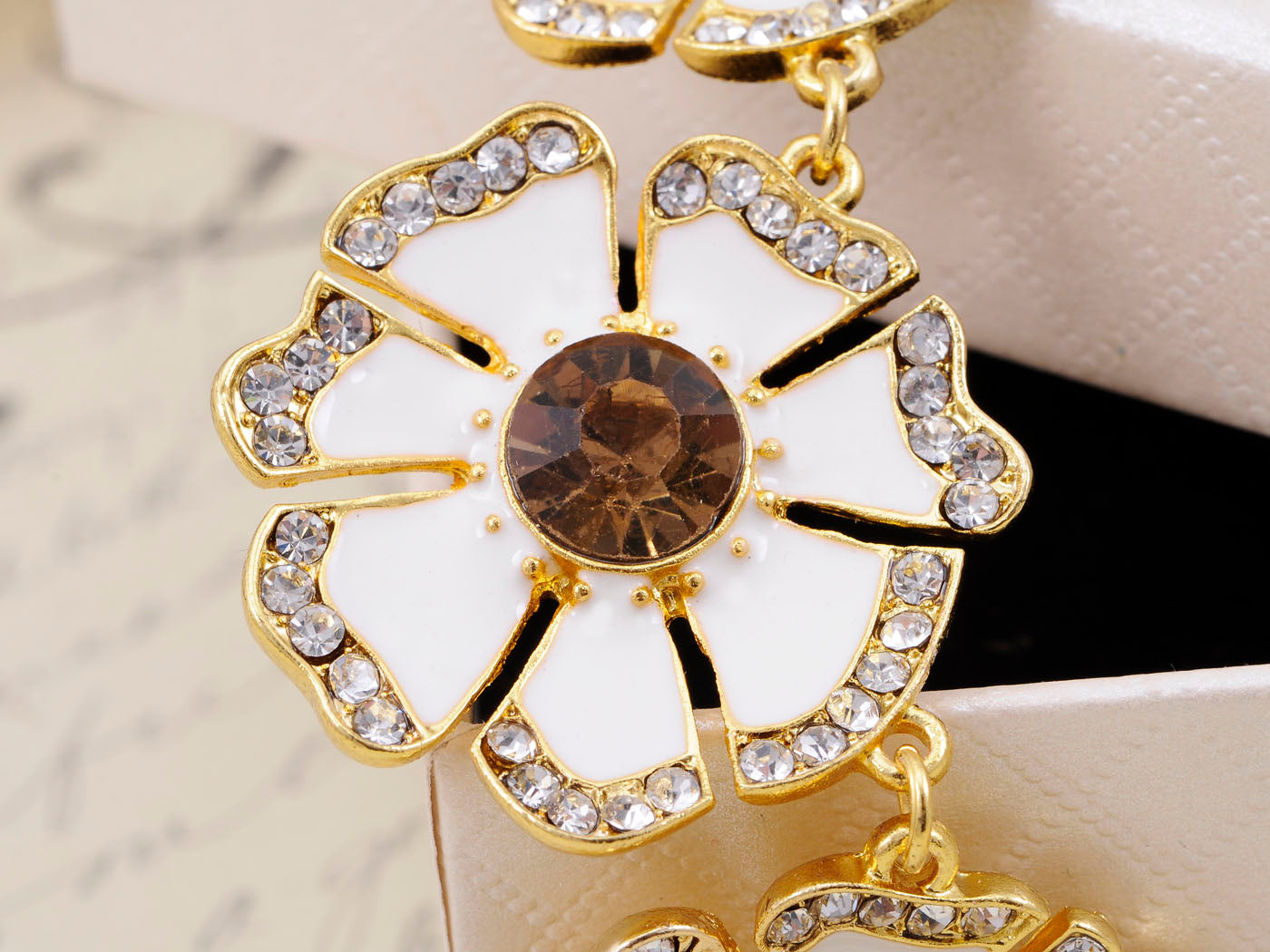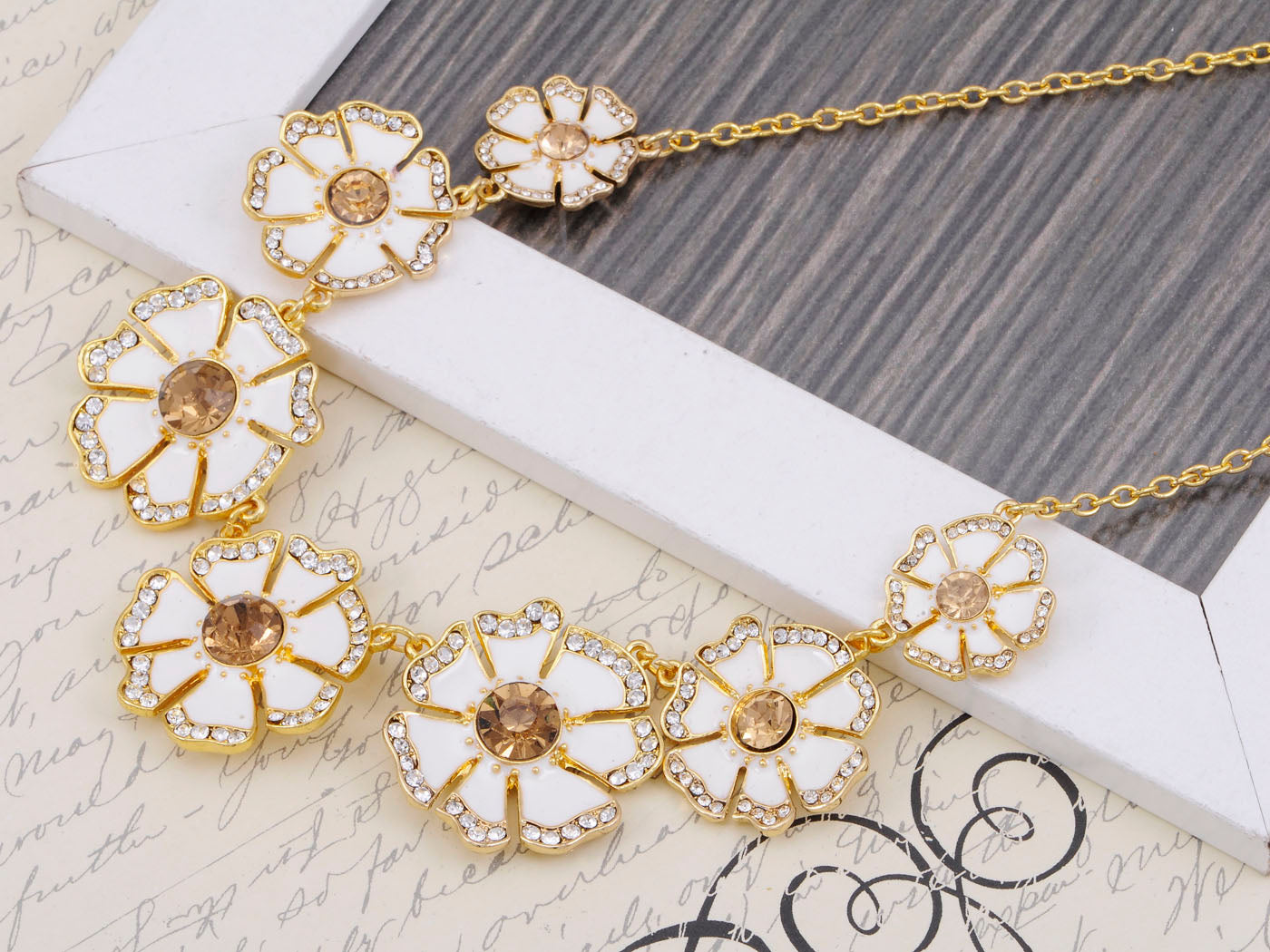 - HIGH QUALITY HANDICRAFT. This pendant was hand crafted to assure the highest quality possible. The shape is made with golden alloy metal, seven flowers are closely connected. Some white rhinestone are dotted in petals. The gold tone and white tone complement each other.