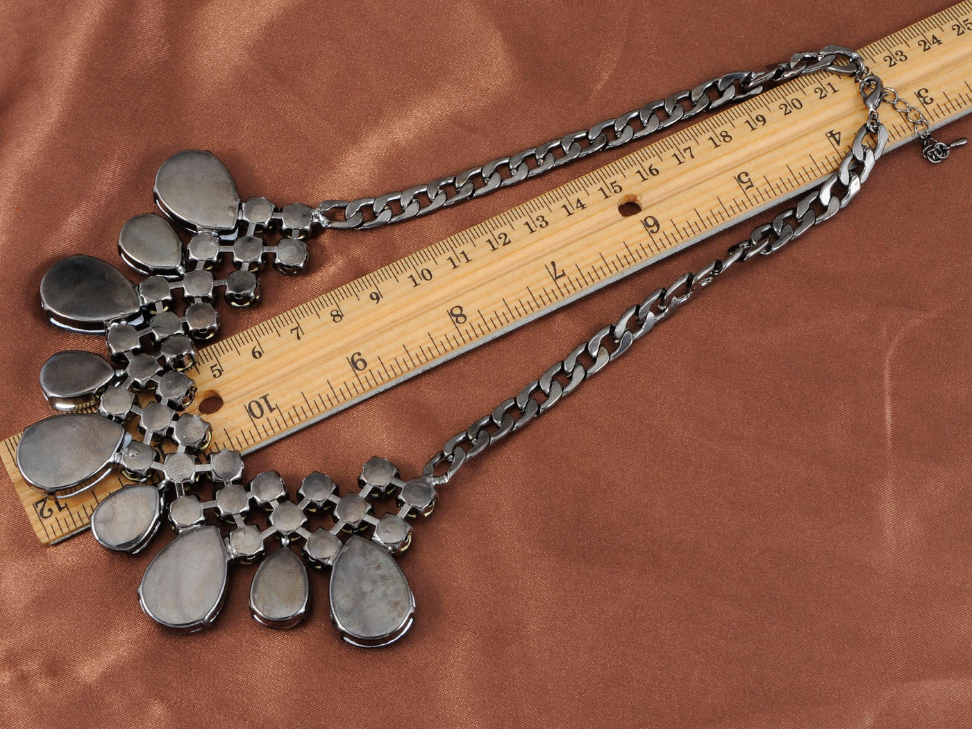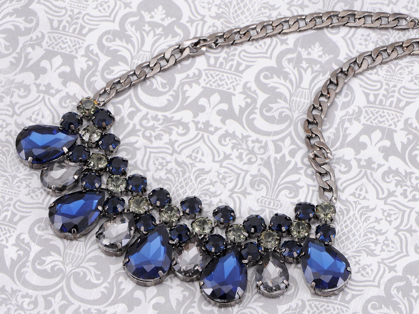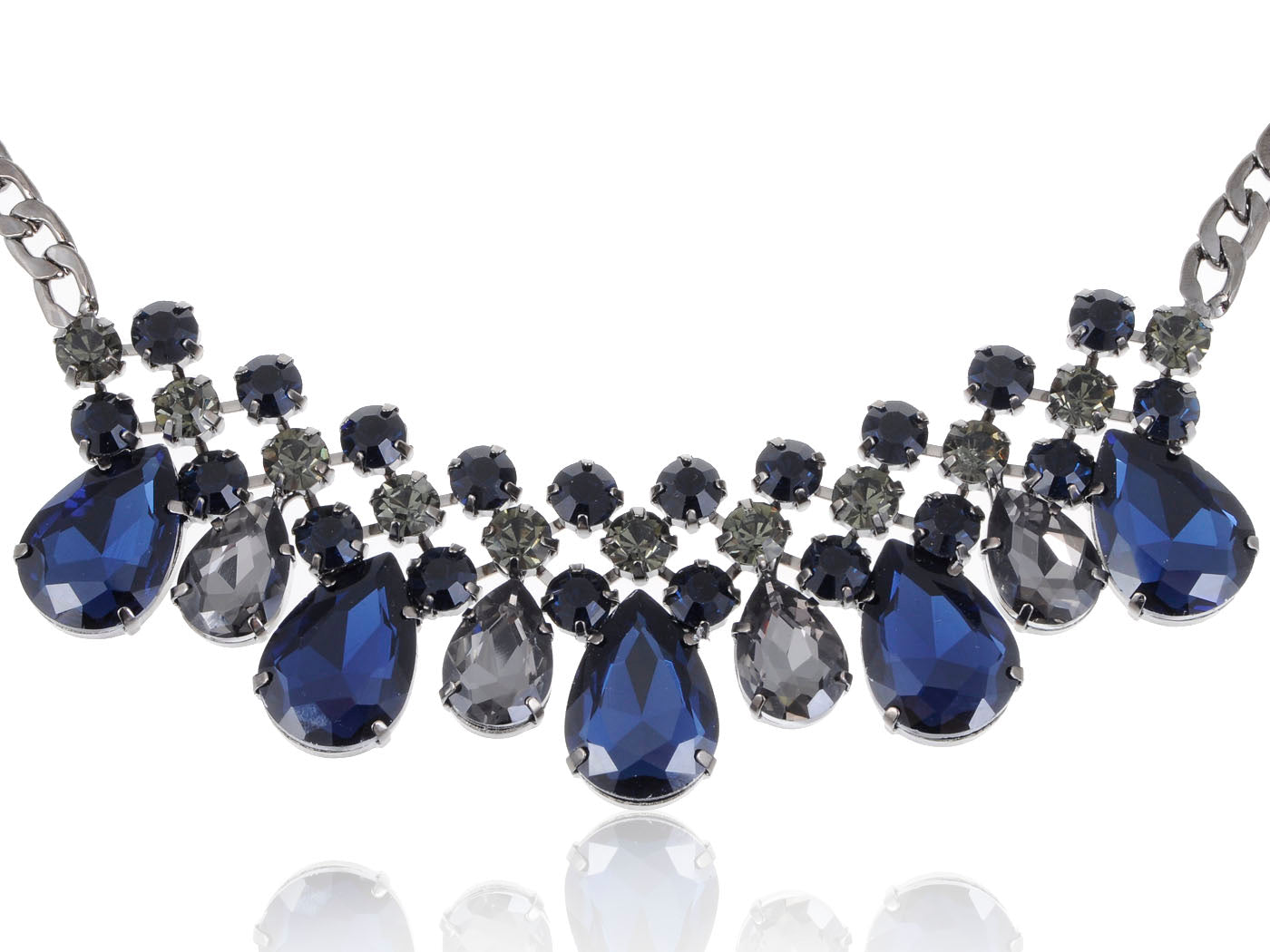 - UNIQUE DESIGN - Curb chain necklace featuring teardrop and circle shape design with dark blue/grey colored rhinestones.