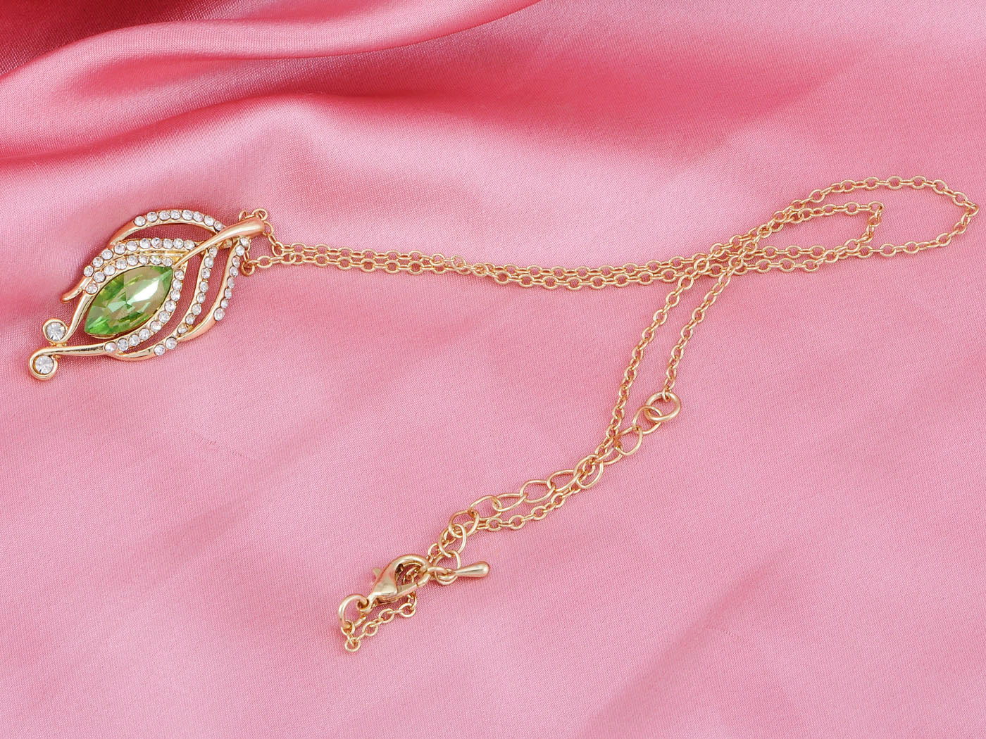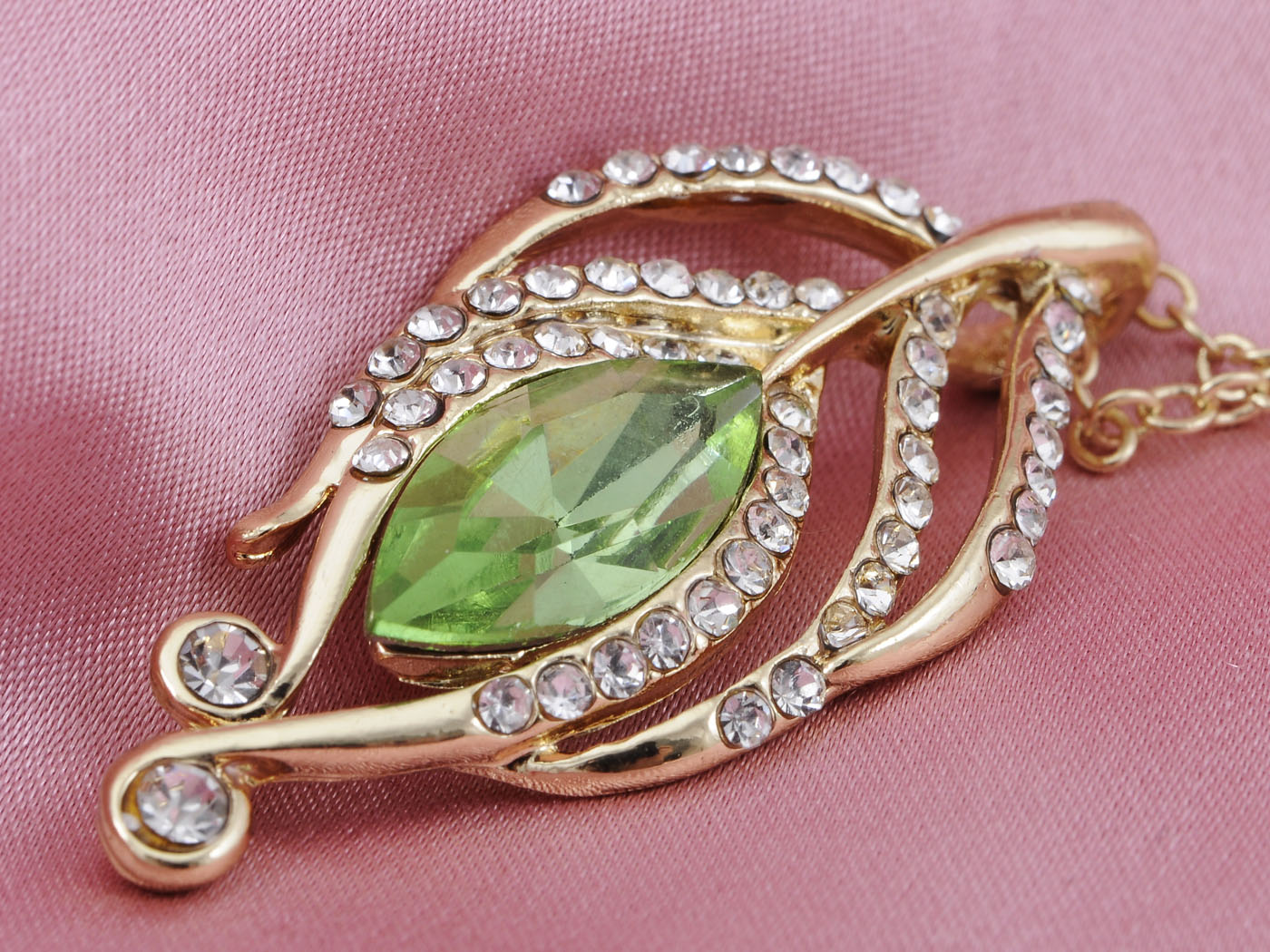 - HIGH QUALITY HANDICRAFT. This pendant was hand crafted to assure the highest quality possible. The shape is made with golden alloy metal, a big green rhinestone is dotted to shine and some small crystal rhinestone is surrounded with it.