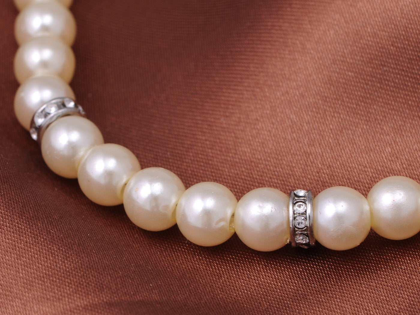 - LUMINESCENT STRING OF PEARLS. A classy set of Art Deco jewelry featuring elegant strand of faux pearls and a matching set of drop earrings. Embellishing these lovely mother of pearl gems are tiny sparkling rhinestone crystals and dainty dangling pearls.