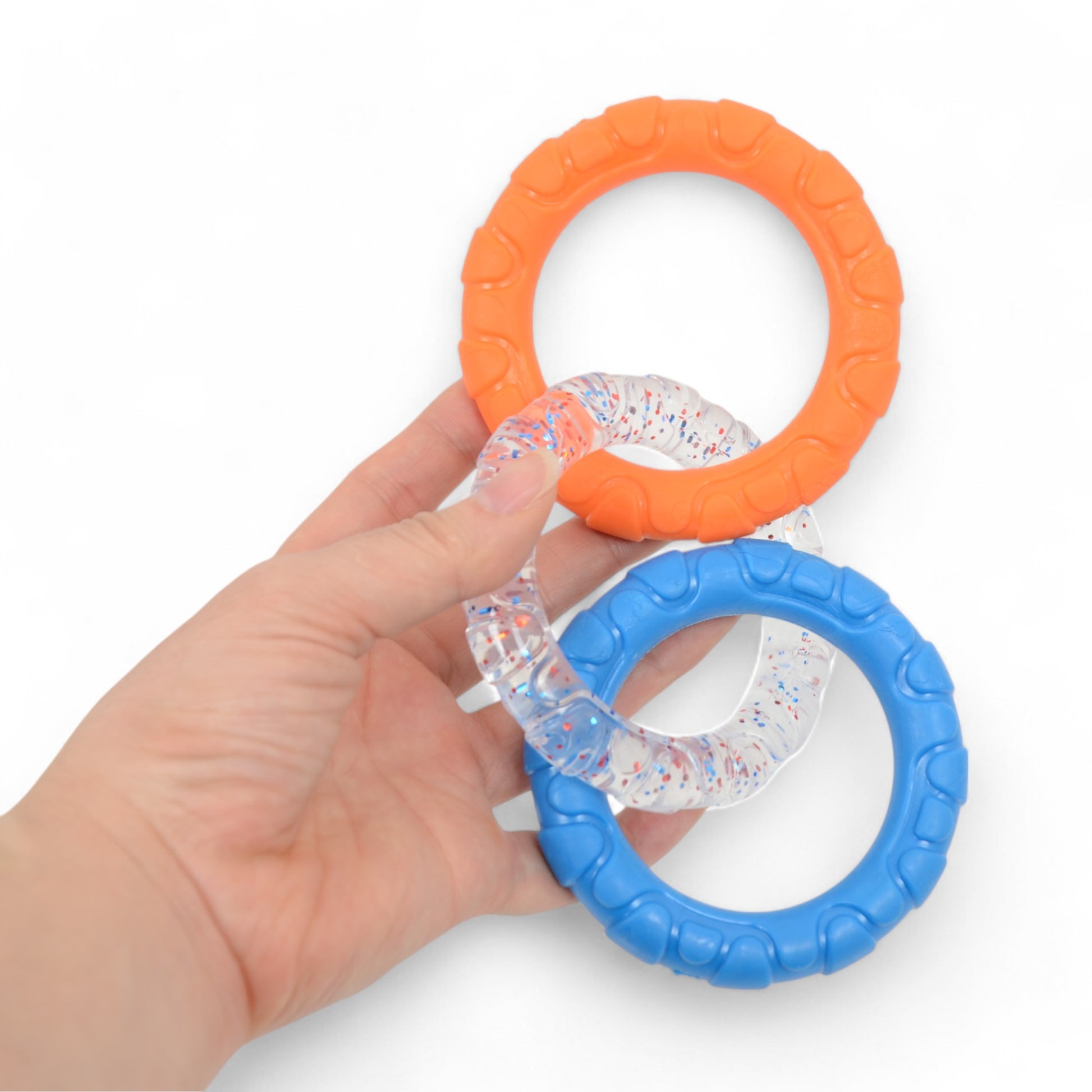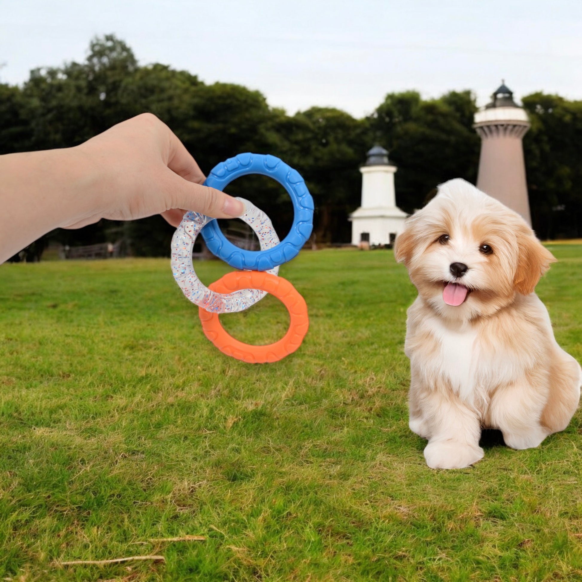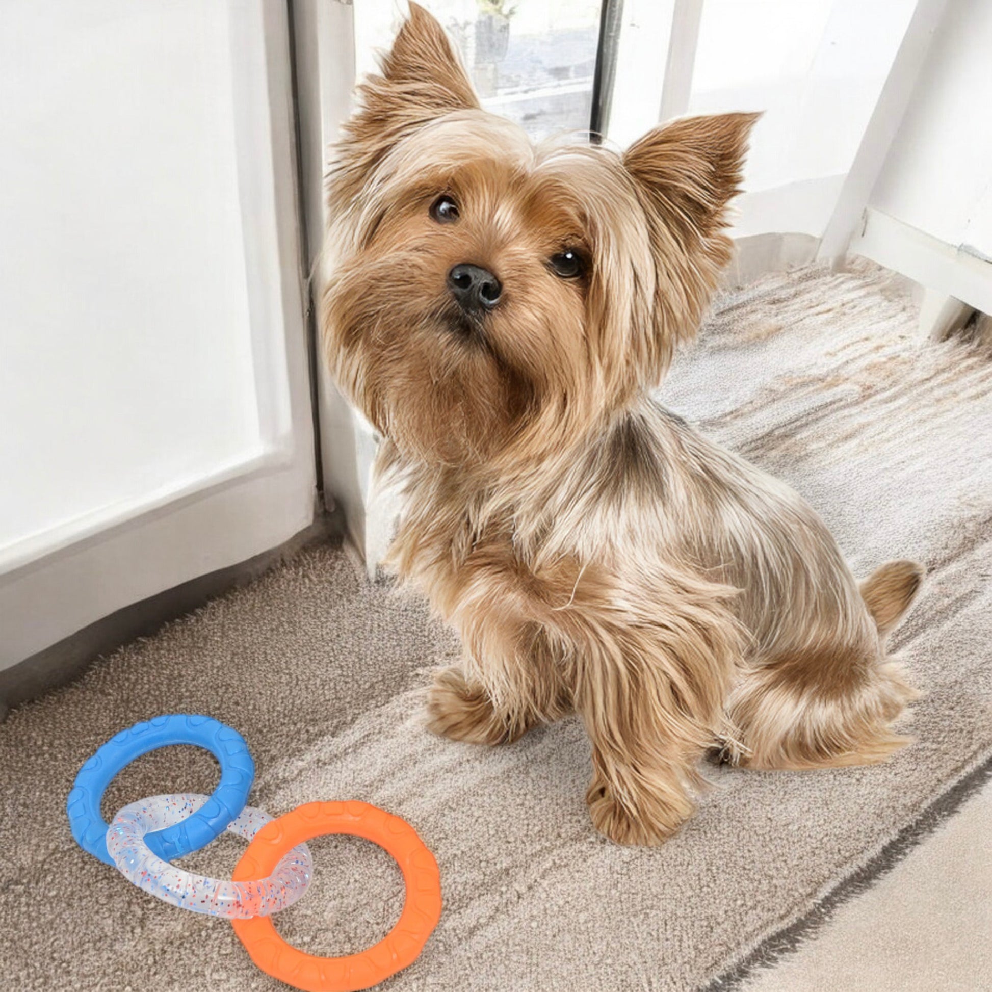 The Dog Chew Toy Rings Set features three vibrant and durable rings in orange, blue, and transparent designs, ideal for small to medium-sized dogs. Crafted from high-quality, pet-safe materials, these rings promote dental health while keeping your dog active and entertained. Their textured surface ensures a secure grip, making them perfect for interactive play like tug-of-war or fetch. Durable and lightweight, these chew rings are built to withstand hours of fun and tail-wagging excitement.