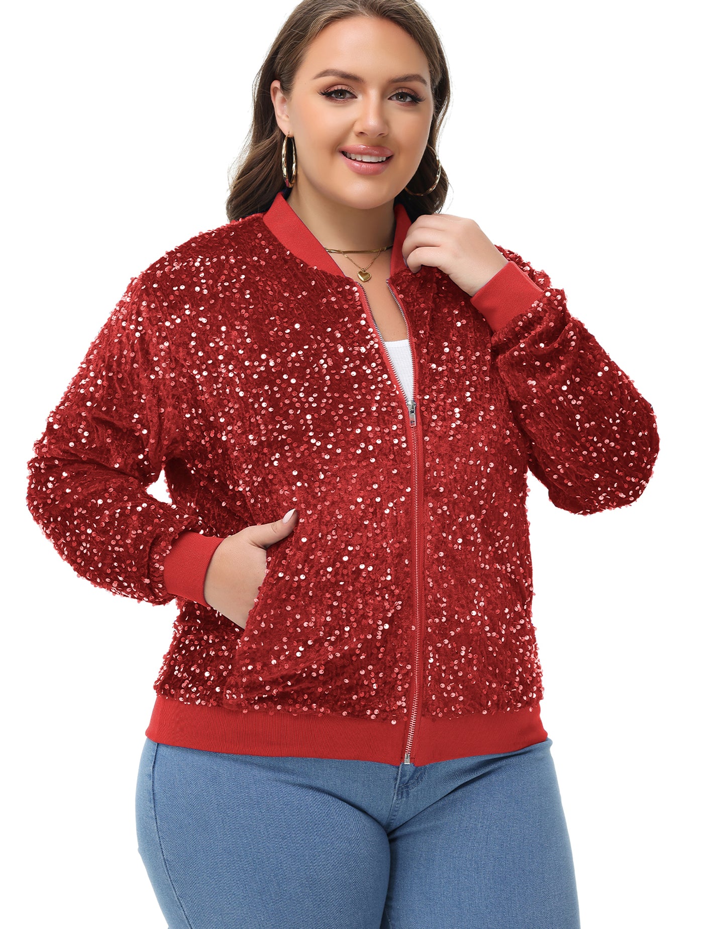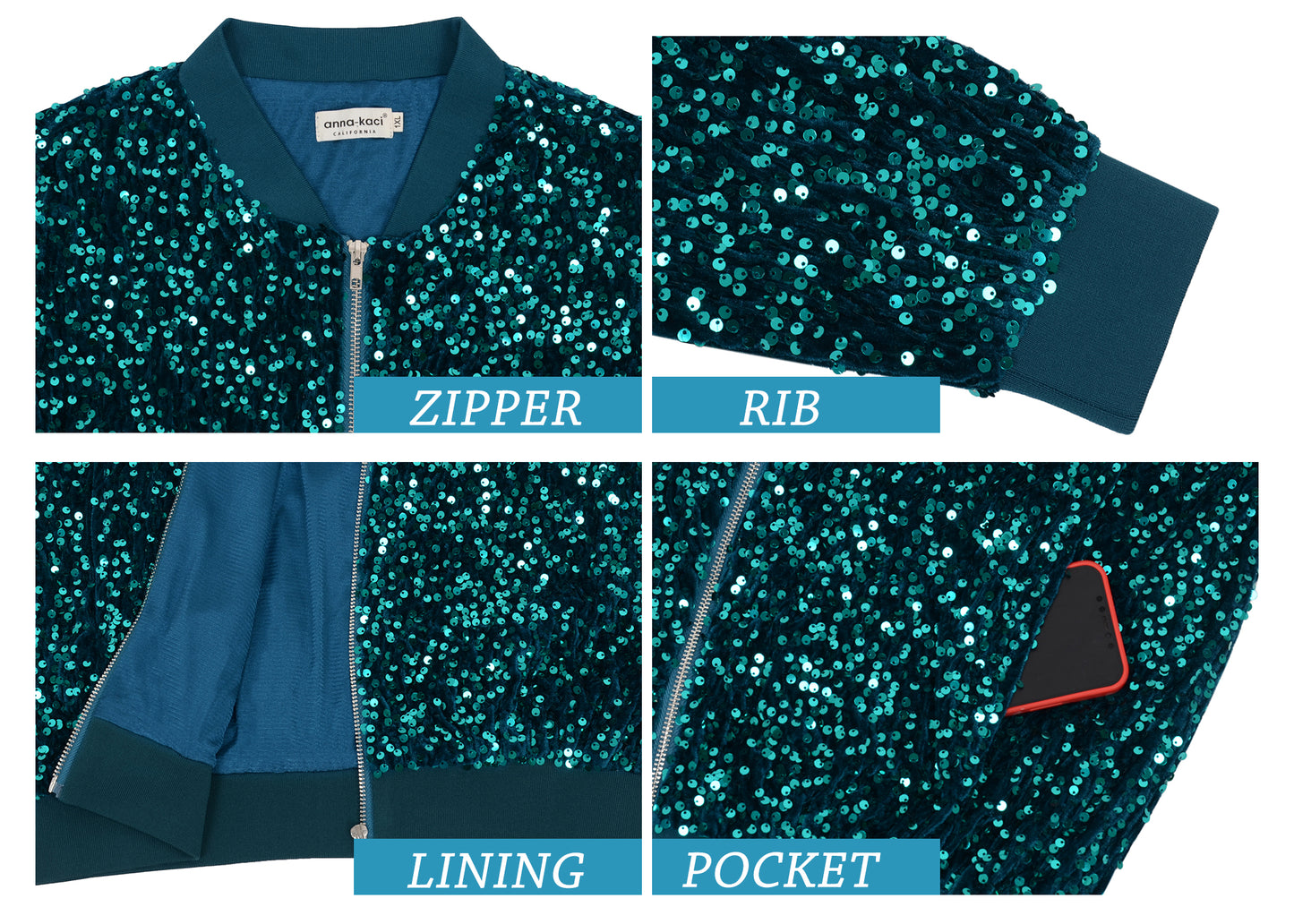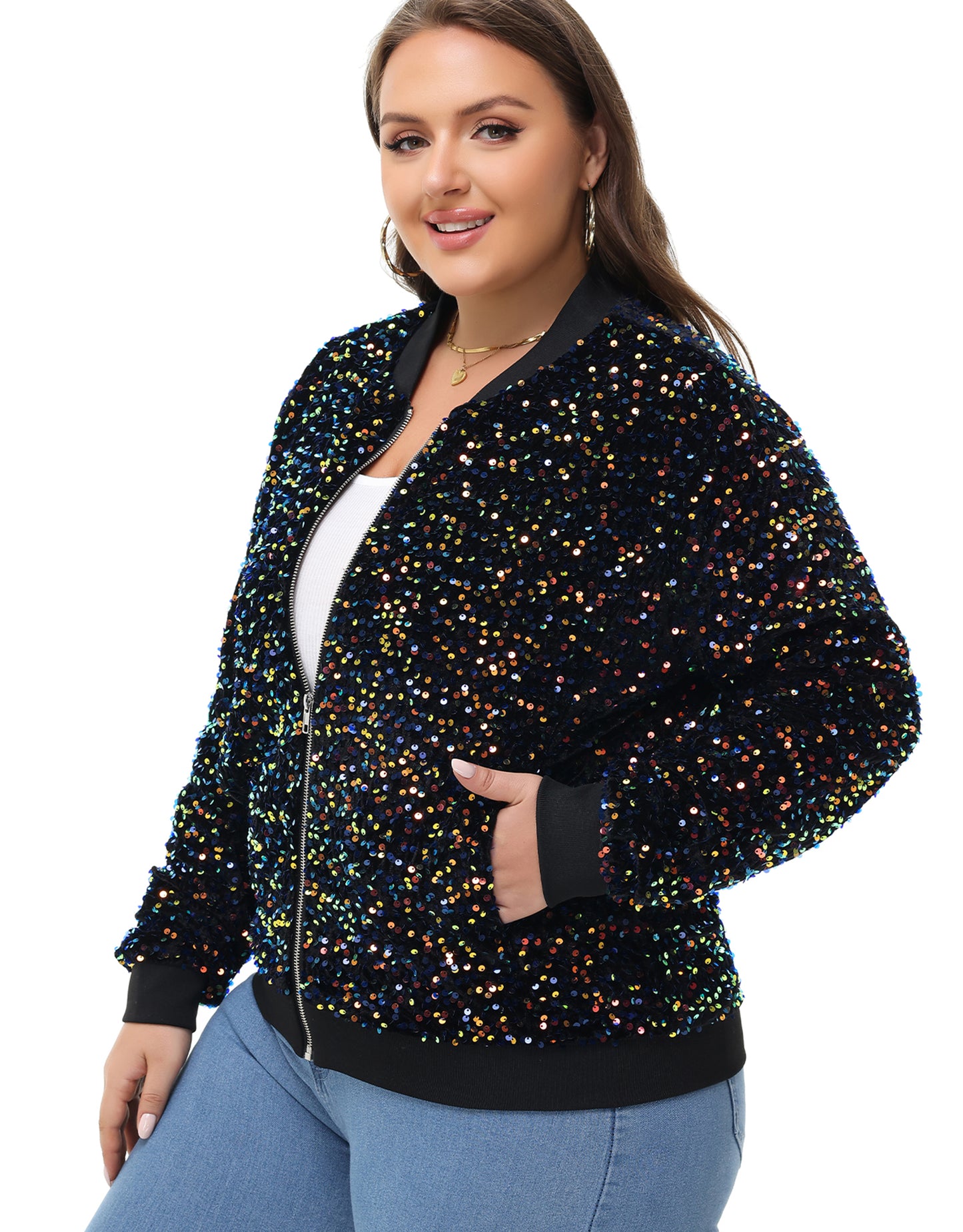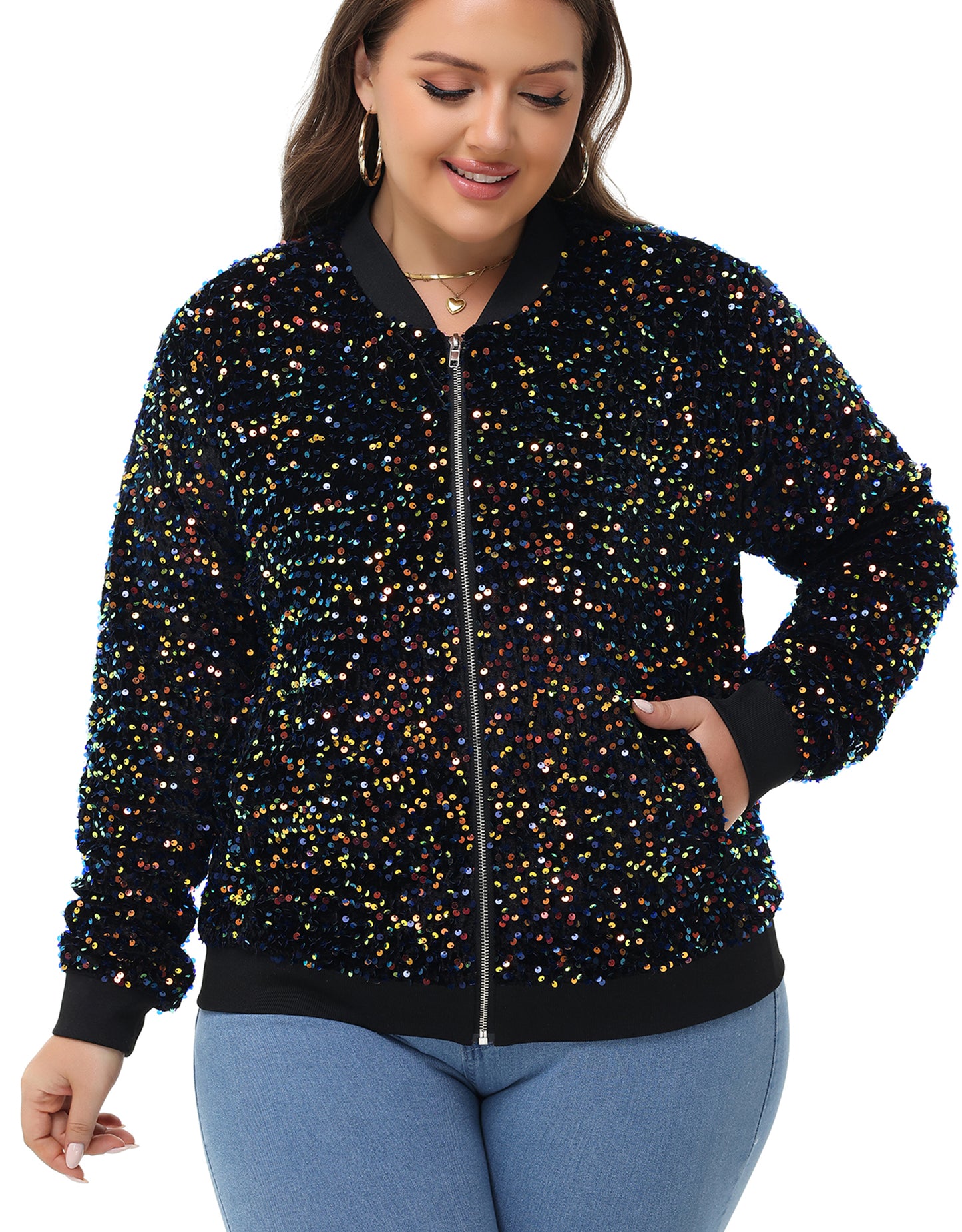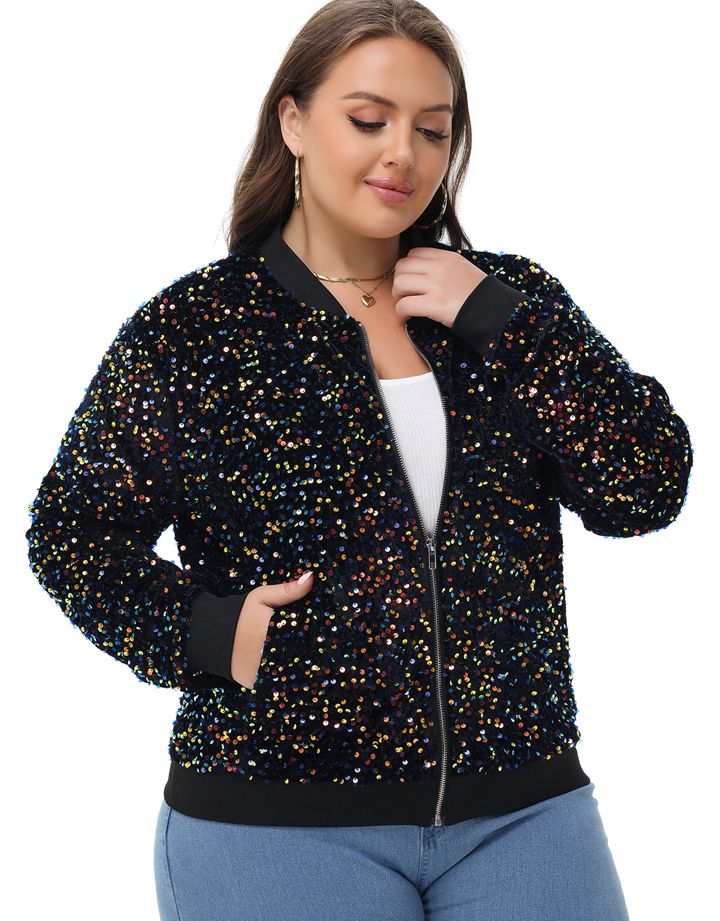 Anna-Kaci Women's Sequin Jacket Plus Size Sparkly Zip Bomber Coat With Pockets For Concert Party