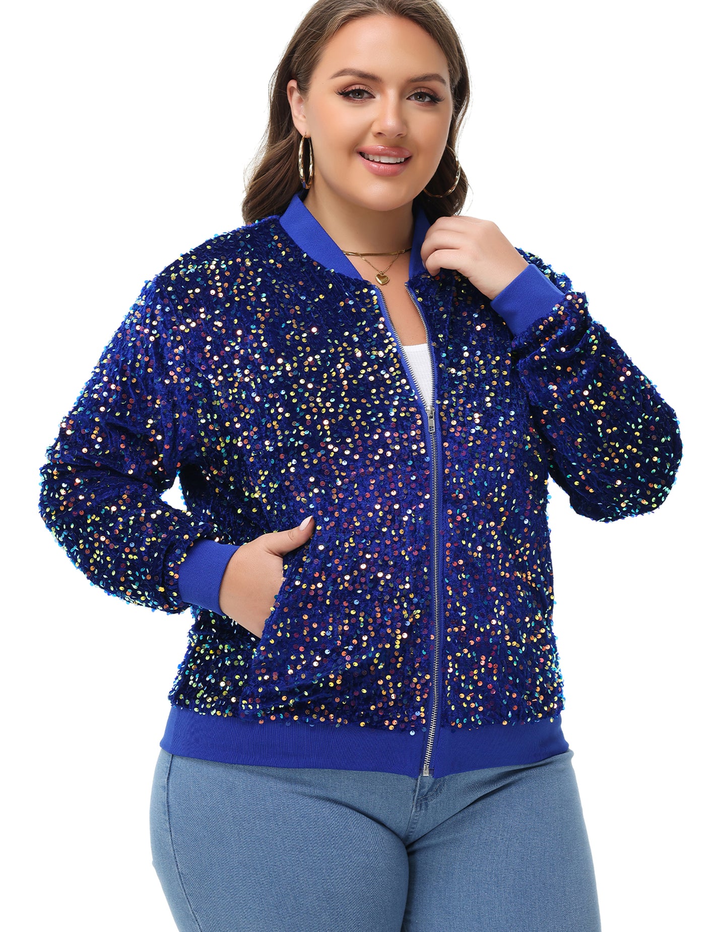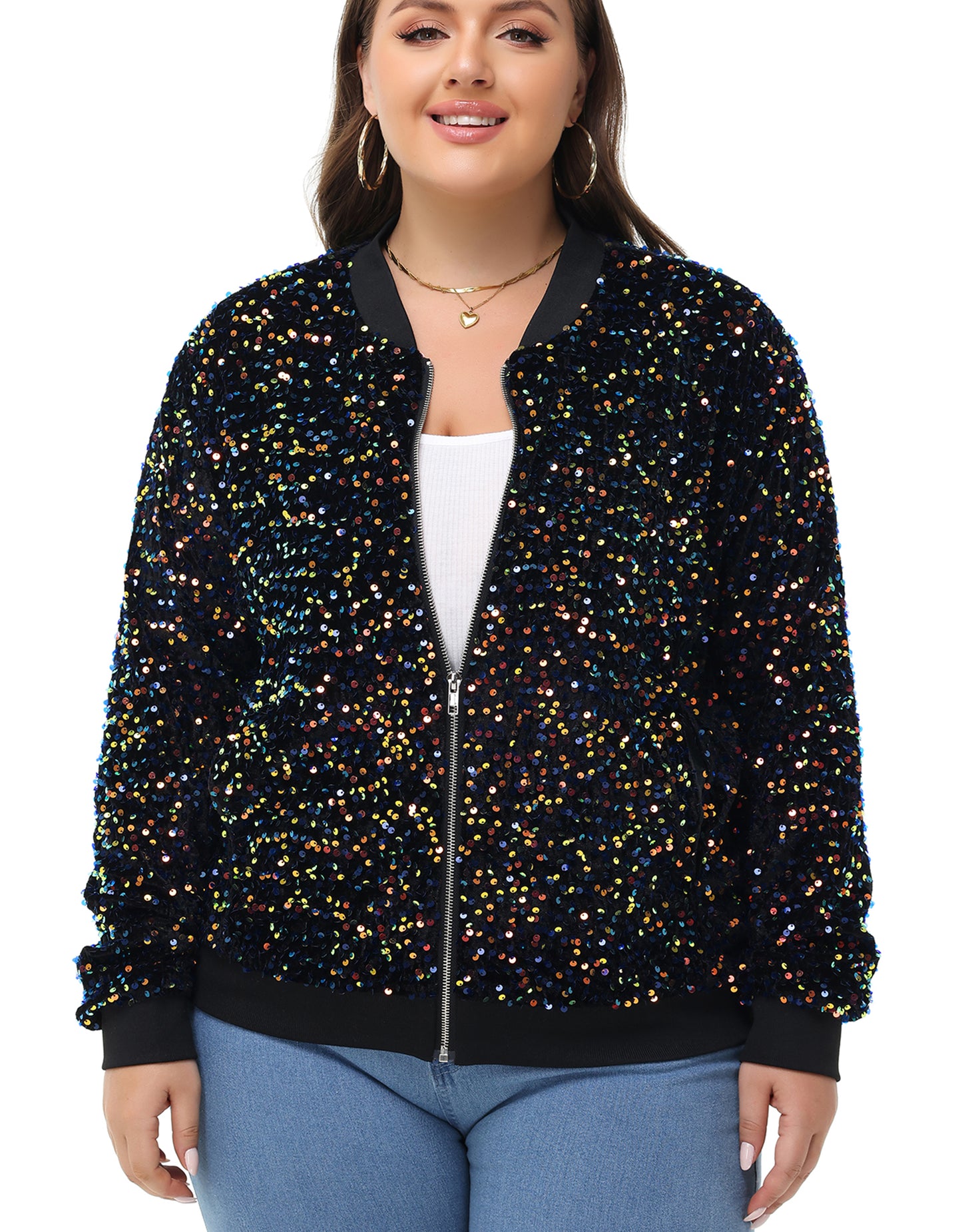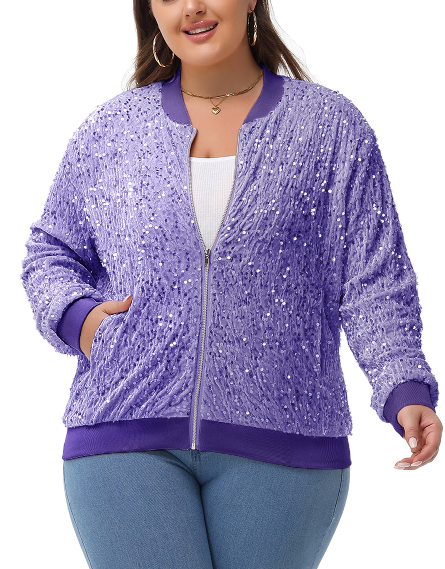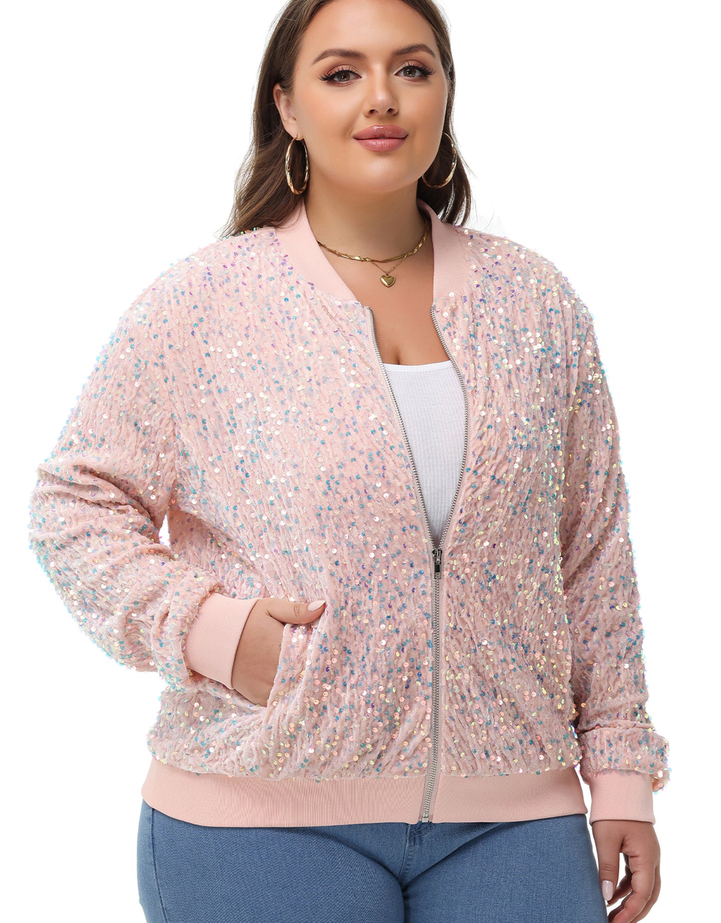 Anna-Kaci Women's Sequin Jacket Plus Size Sparkly Zip Bomber Coat With Pockets For Concert Party