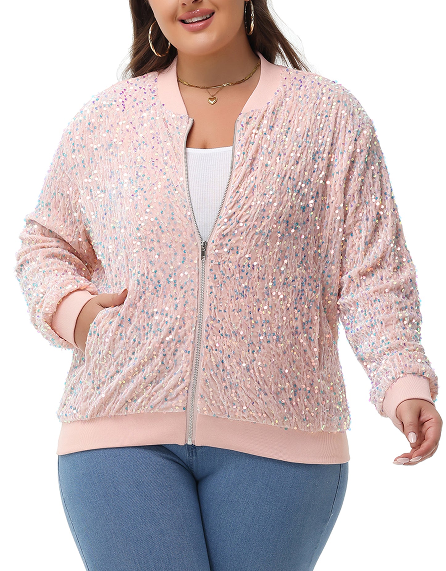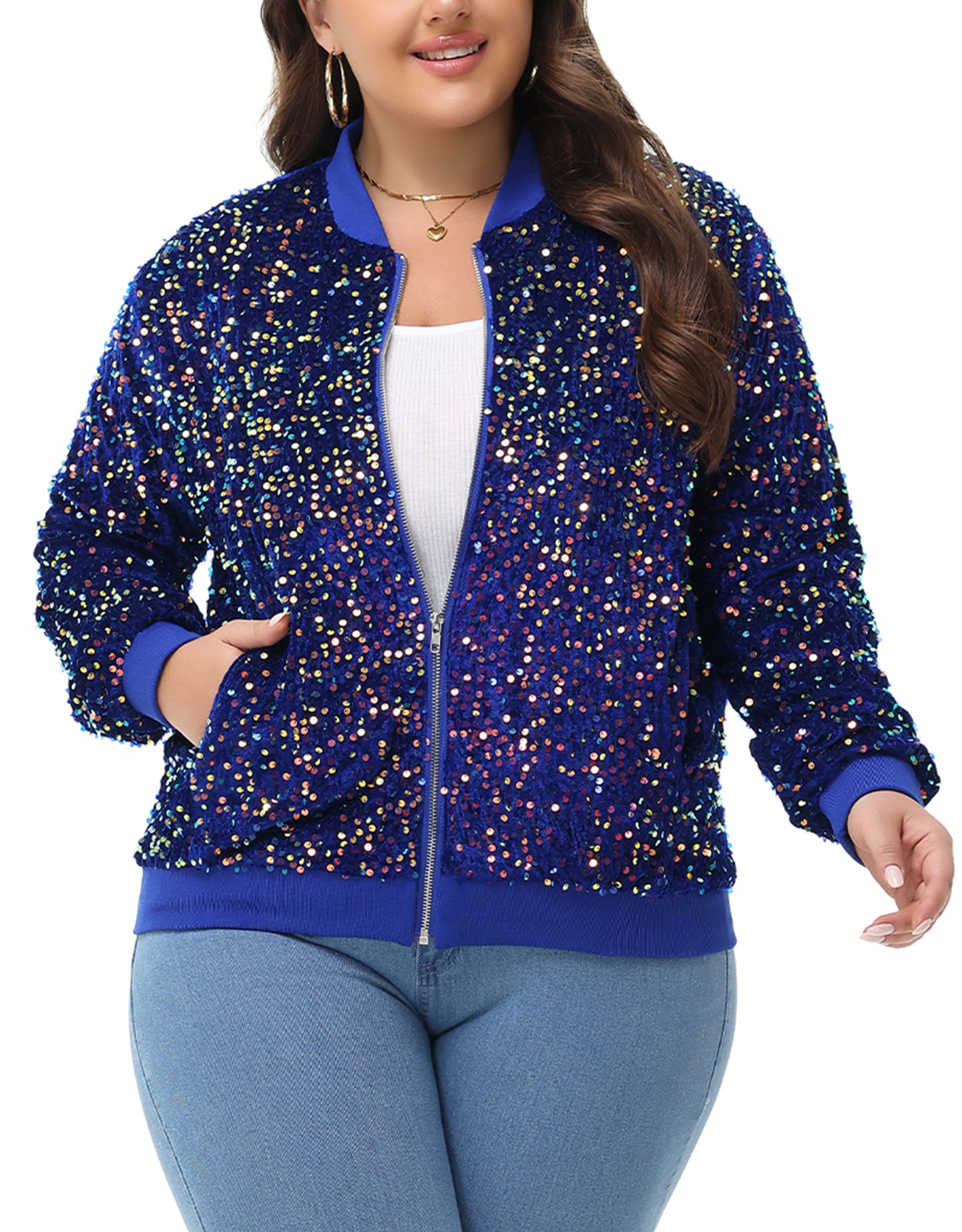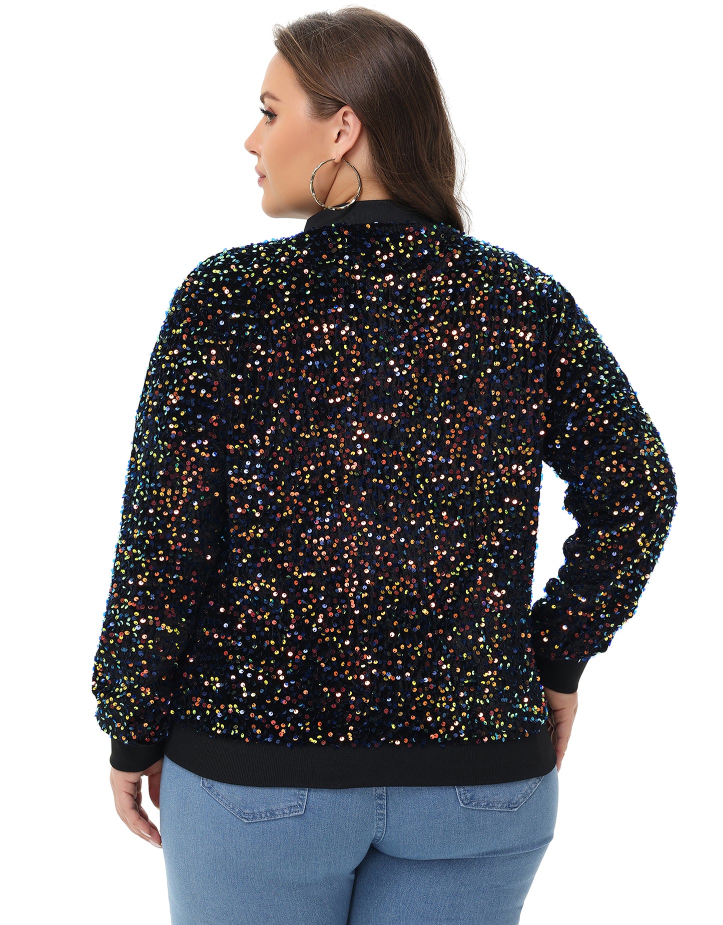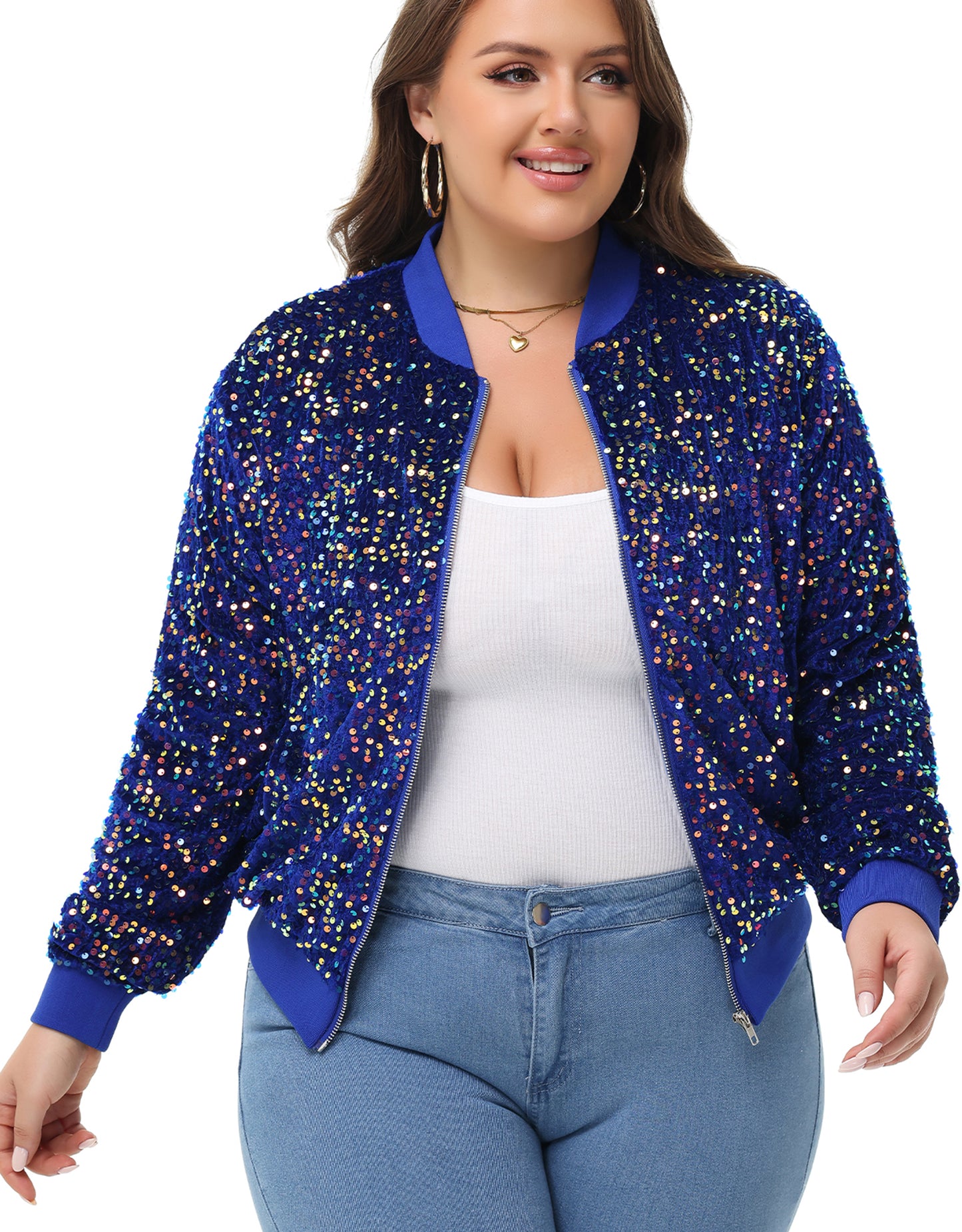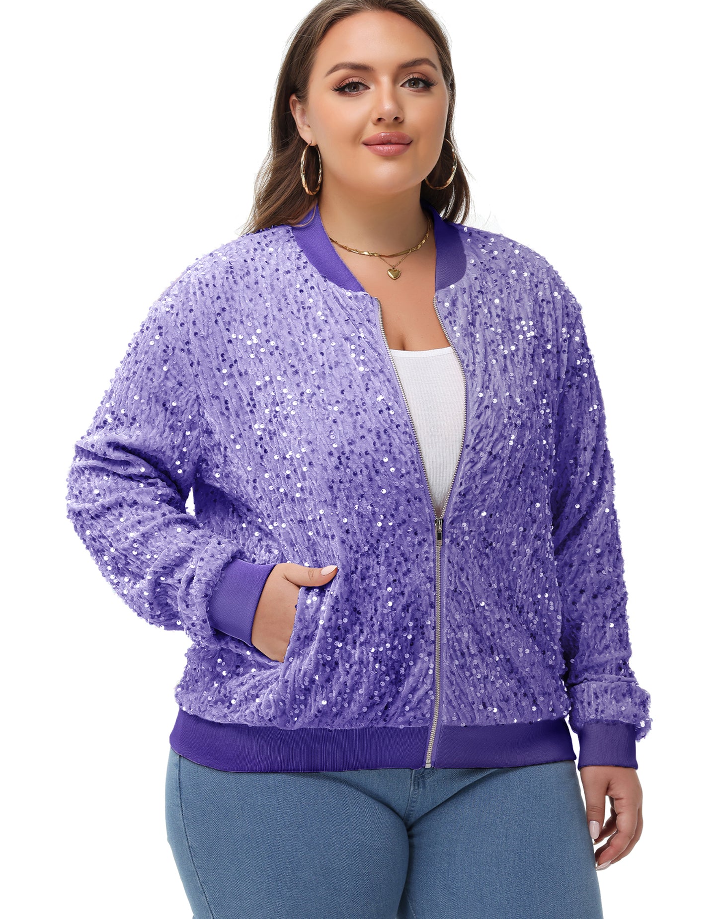 Anna-Kaci Women's Sequin Jacket Plus Size Sparkly Zip Bomber Coat With Pockets For Concert Party
