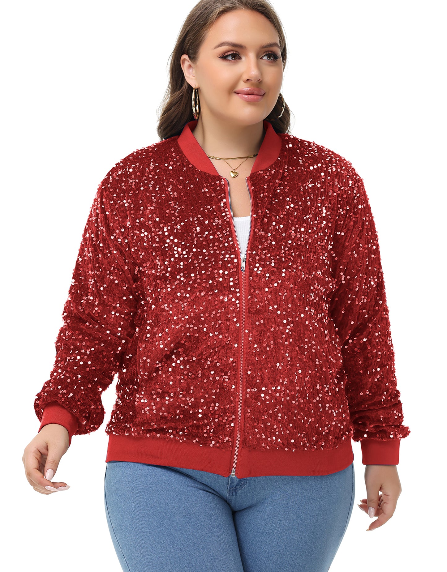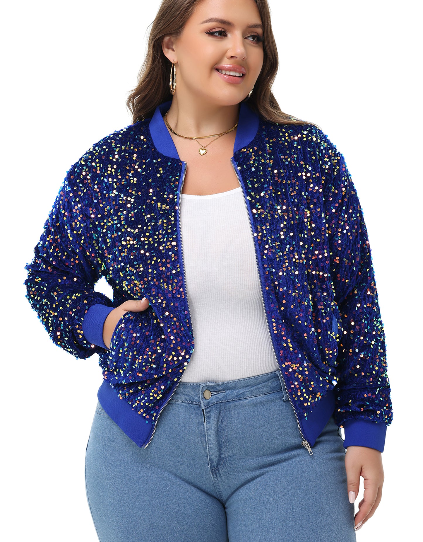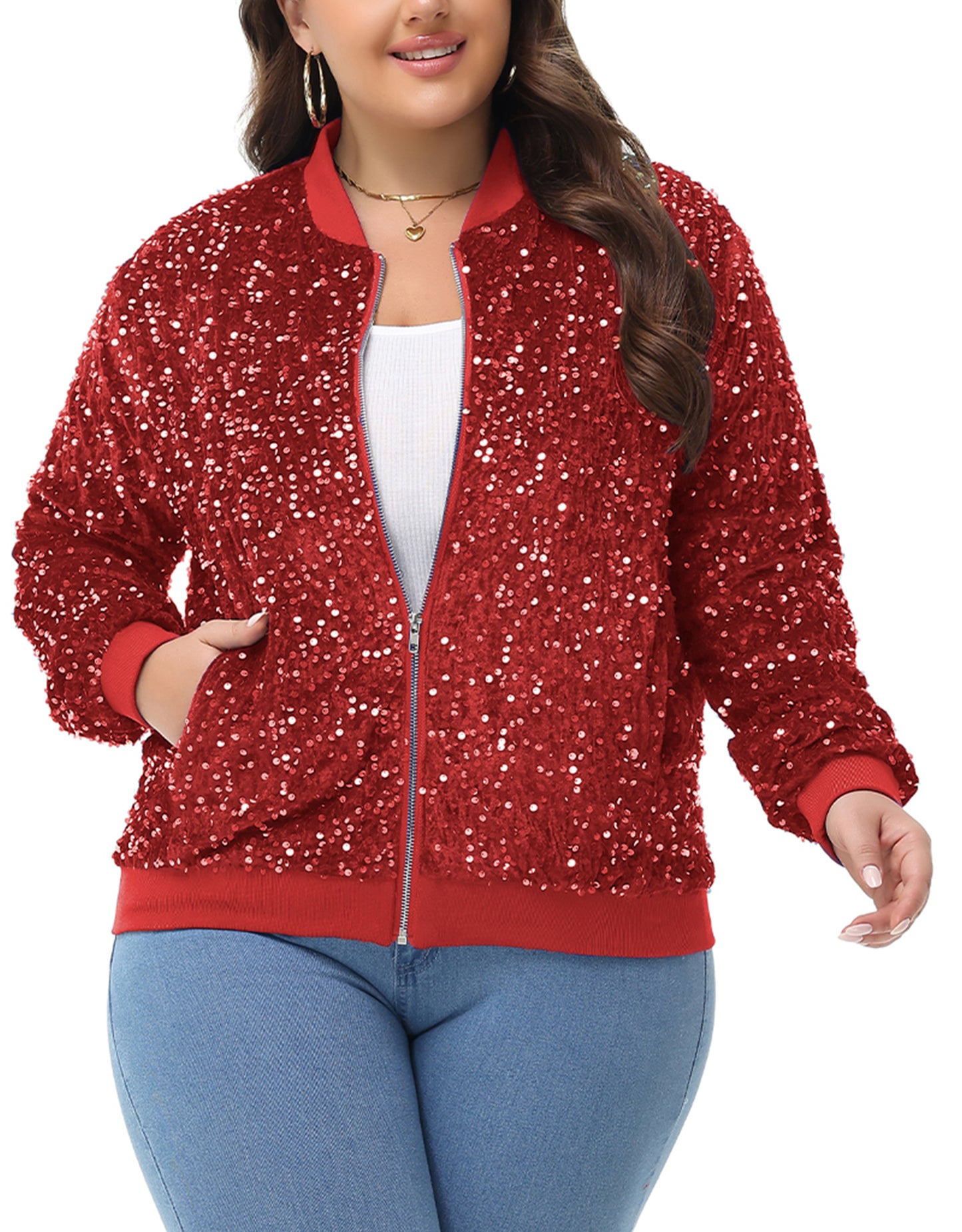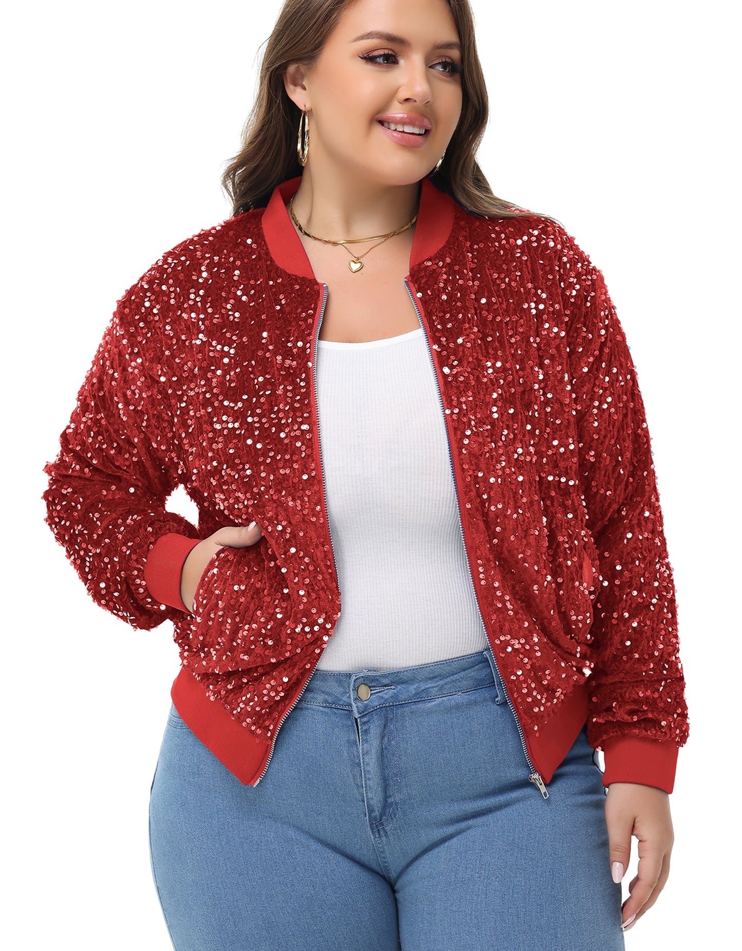 Anna-Kaci Women's Sequin Jacket Plus Size Sparkly Zip Bomber Coat With Pockets For Concert Party