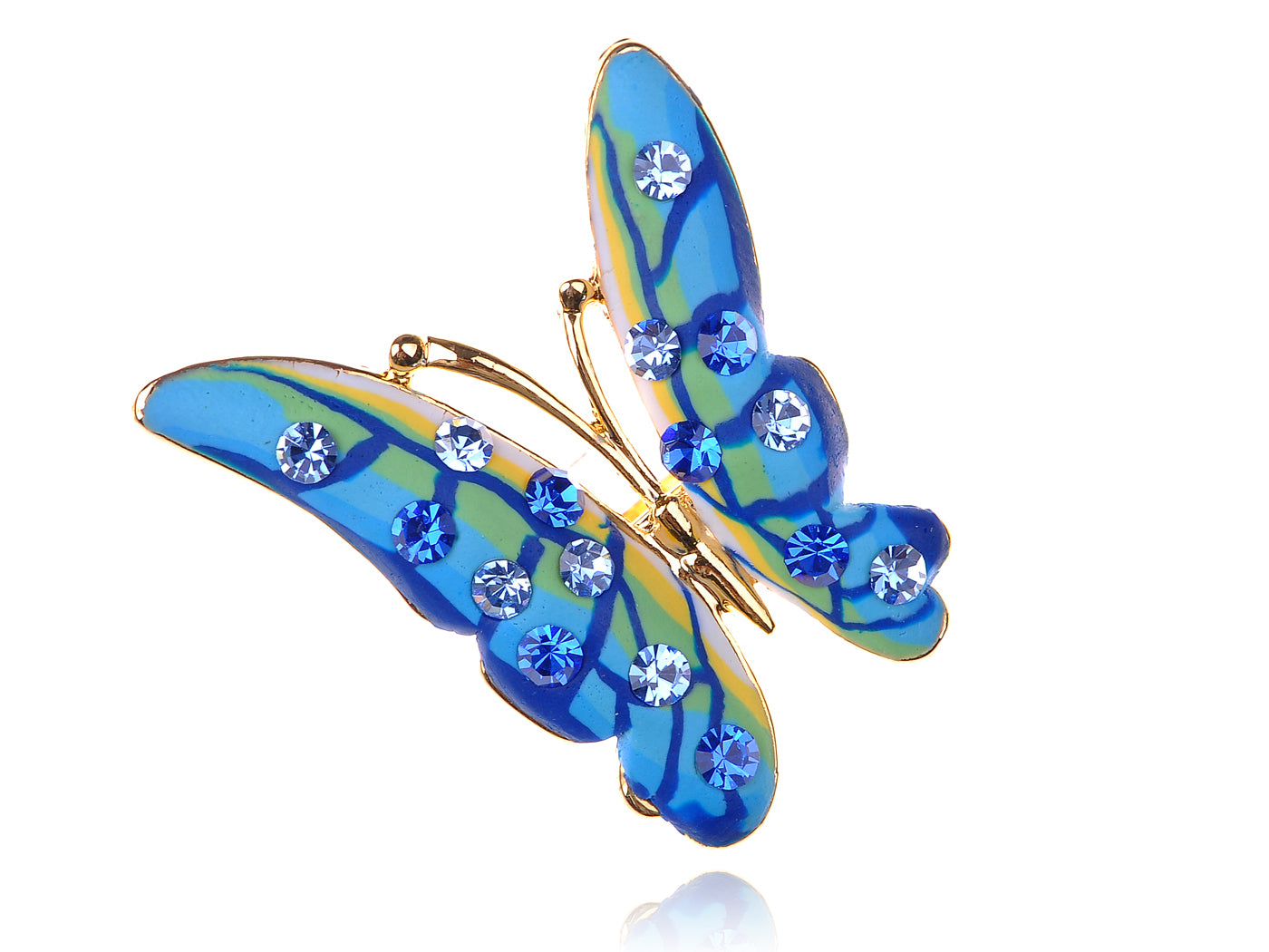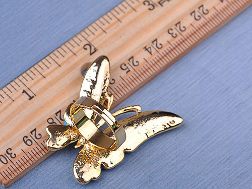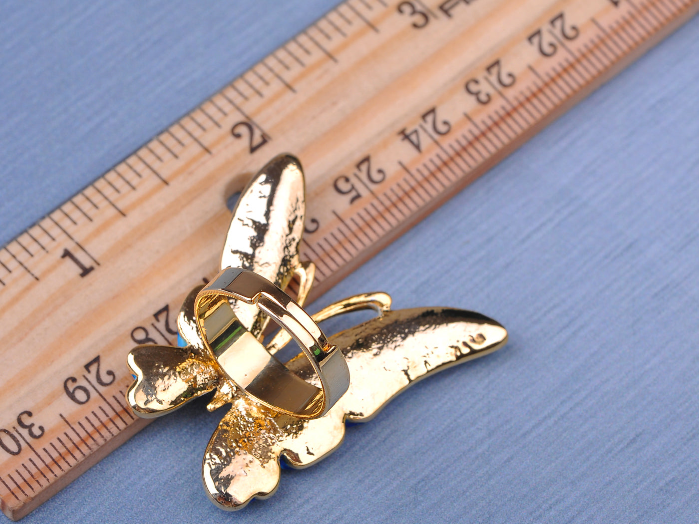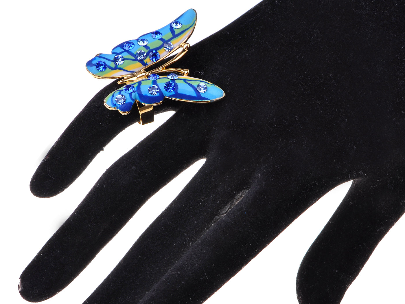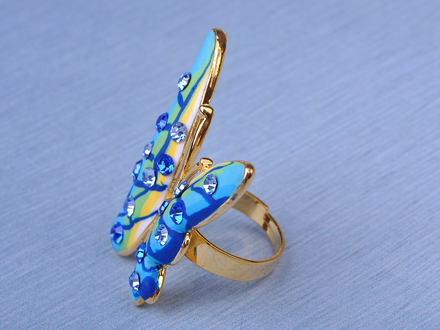 - Beautifly blue tone butterfly fashion ring, metal base in golden tone, beautfily hand painted fimo wrings, embedded with capri blue crystal rhinestones. Adjustable ring fits any size fingers.