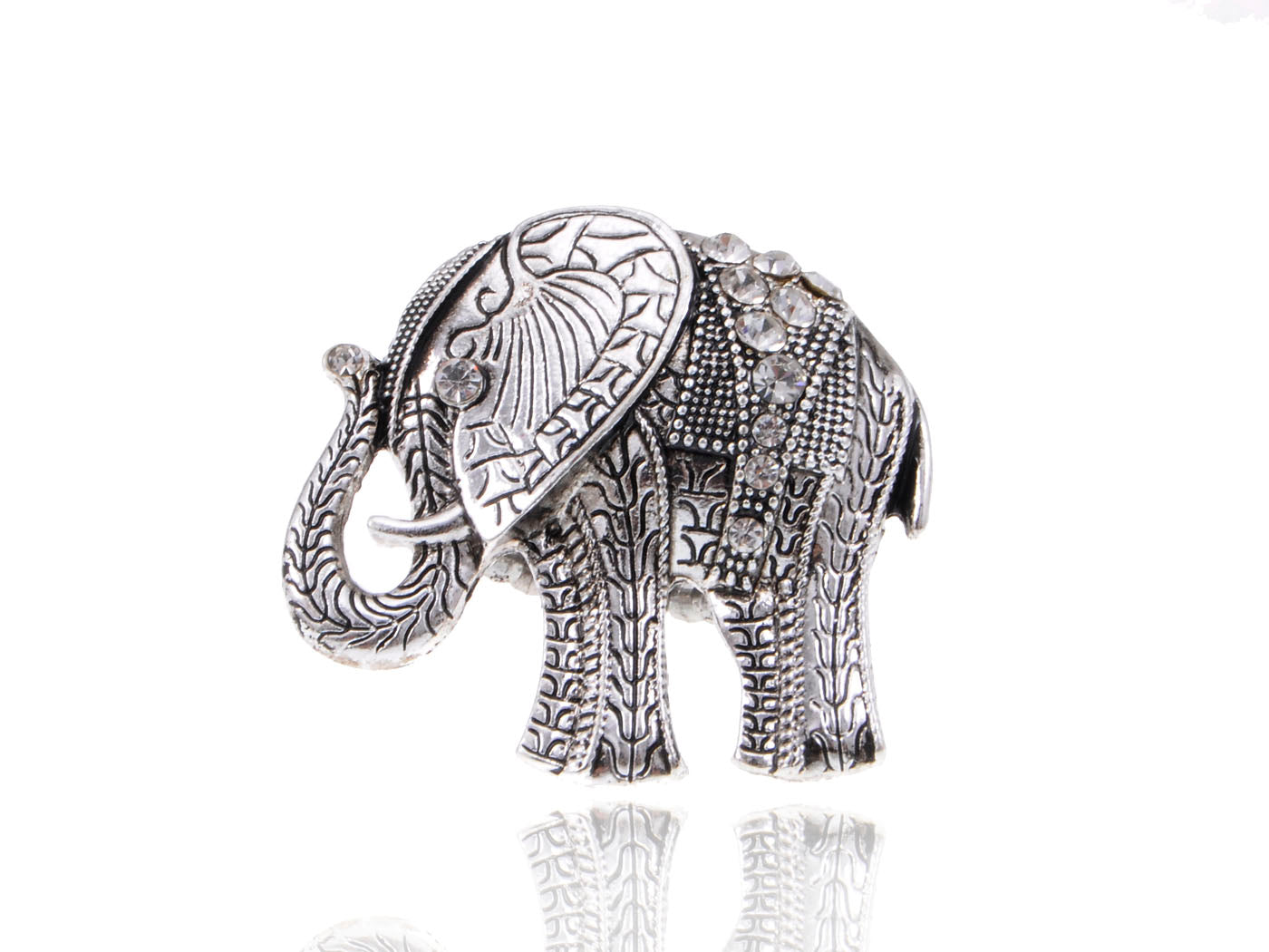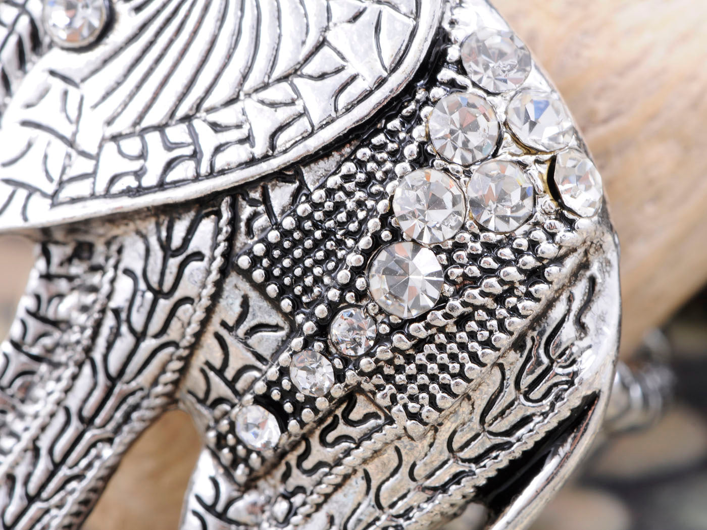 - STUNNING DESIGN - A beautiful silver tone tusked elephant ring is the cutest accessory. There are a variety of stunning details from the intricate engraved designs seen throughout the ring, to the sparkly clear crystal rhinestones.