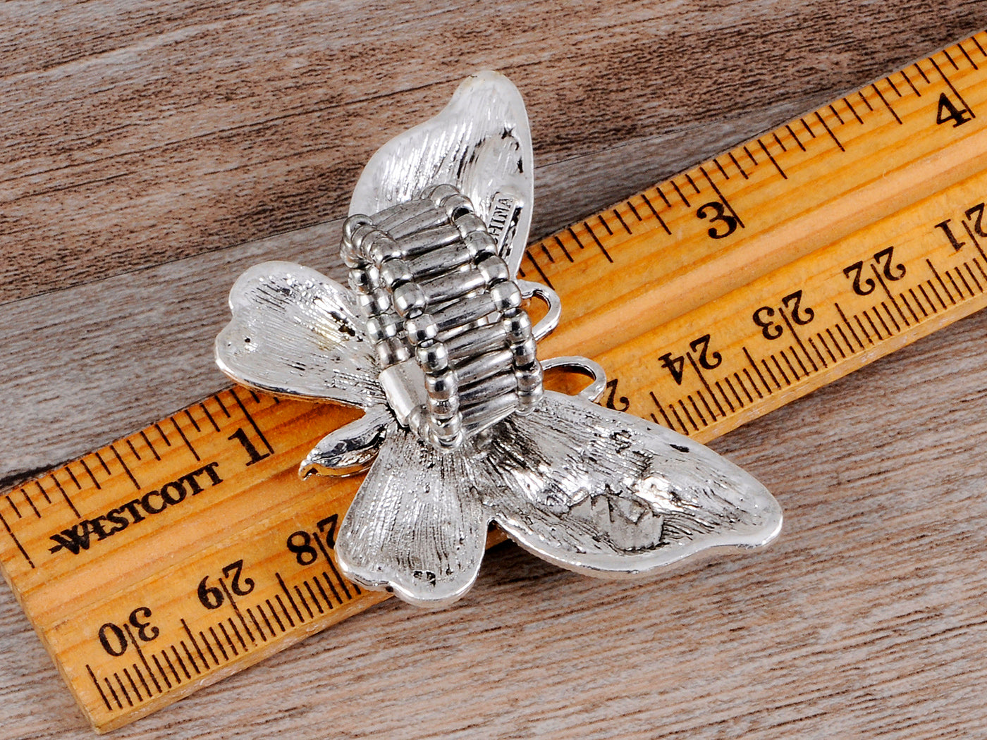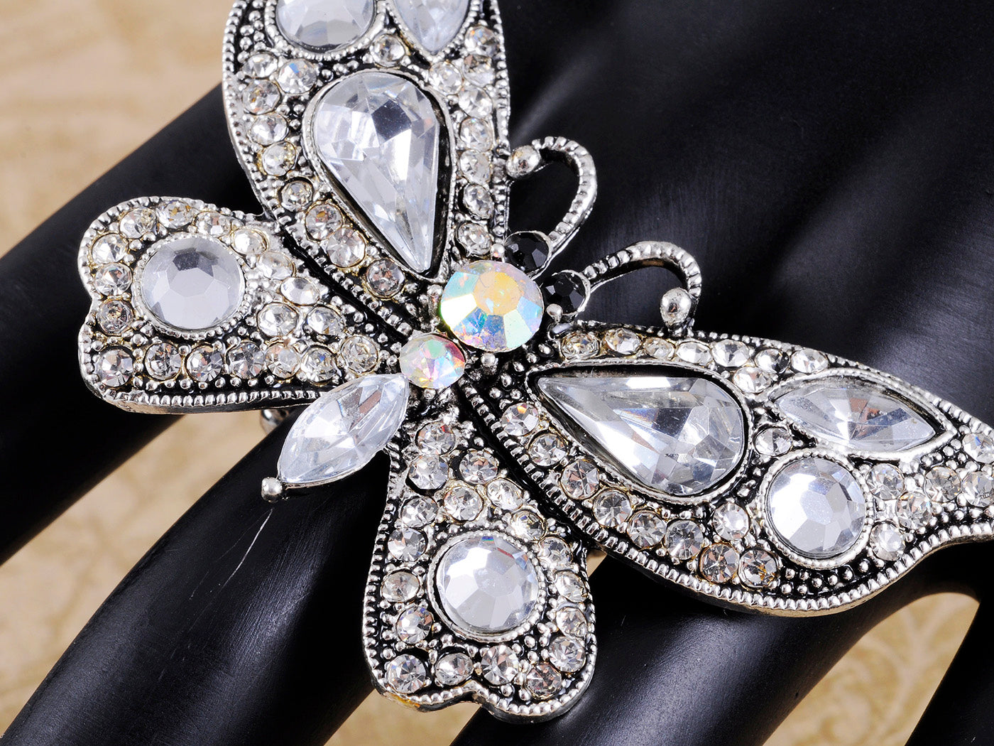 - SHIMMERING RING - Elegant & classy this sparkling butterfly is dripping with clear Czech rhinestone jewels! Featuring silver toned metal accents and adorned with black crystals eyes for detail. This lightweight accessory has a band that is adjustable for your comfort.