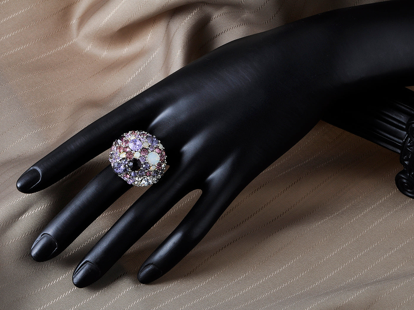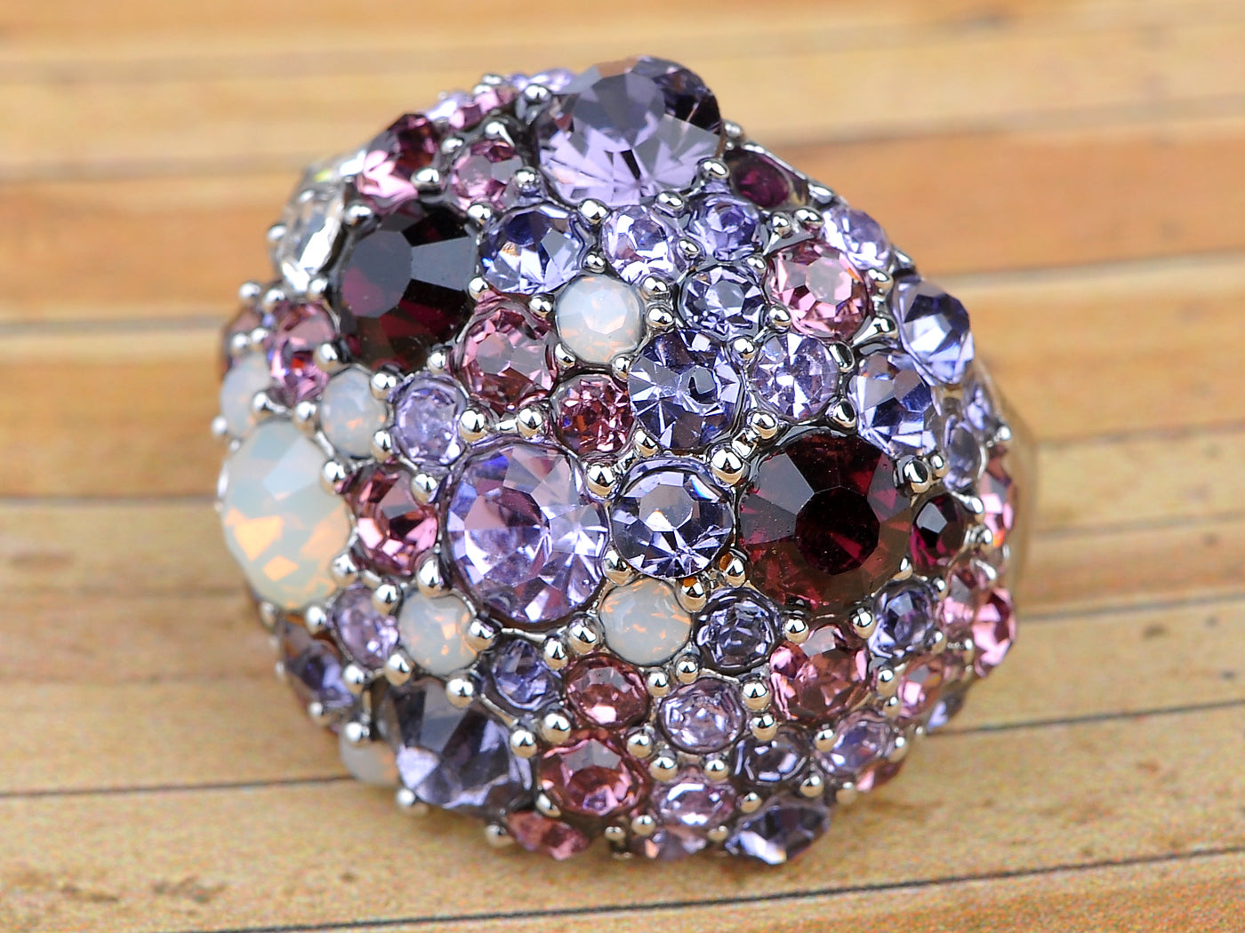 - ALLURING DESIGN - This ring is like bouquet of surprises with interchanging rhinestones in multi tones! Clustered together are various shades of purple, lilac and pink rhinestones mixed with white opalescent bauble stones to create this stunning chunky ring! Silver trim accents finish of the ring for polished and glamorous look.