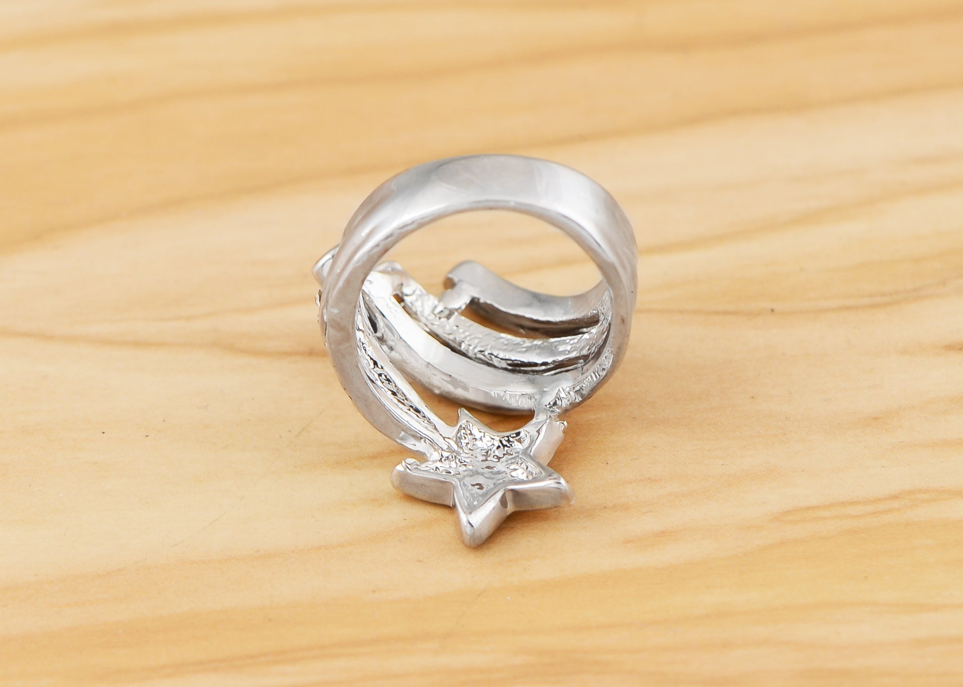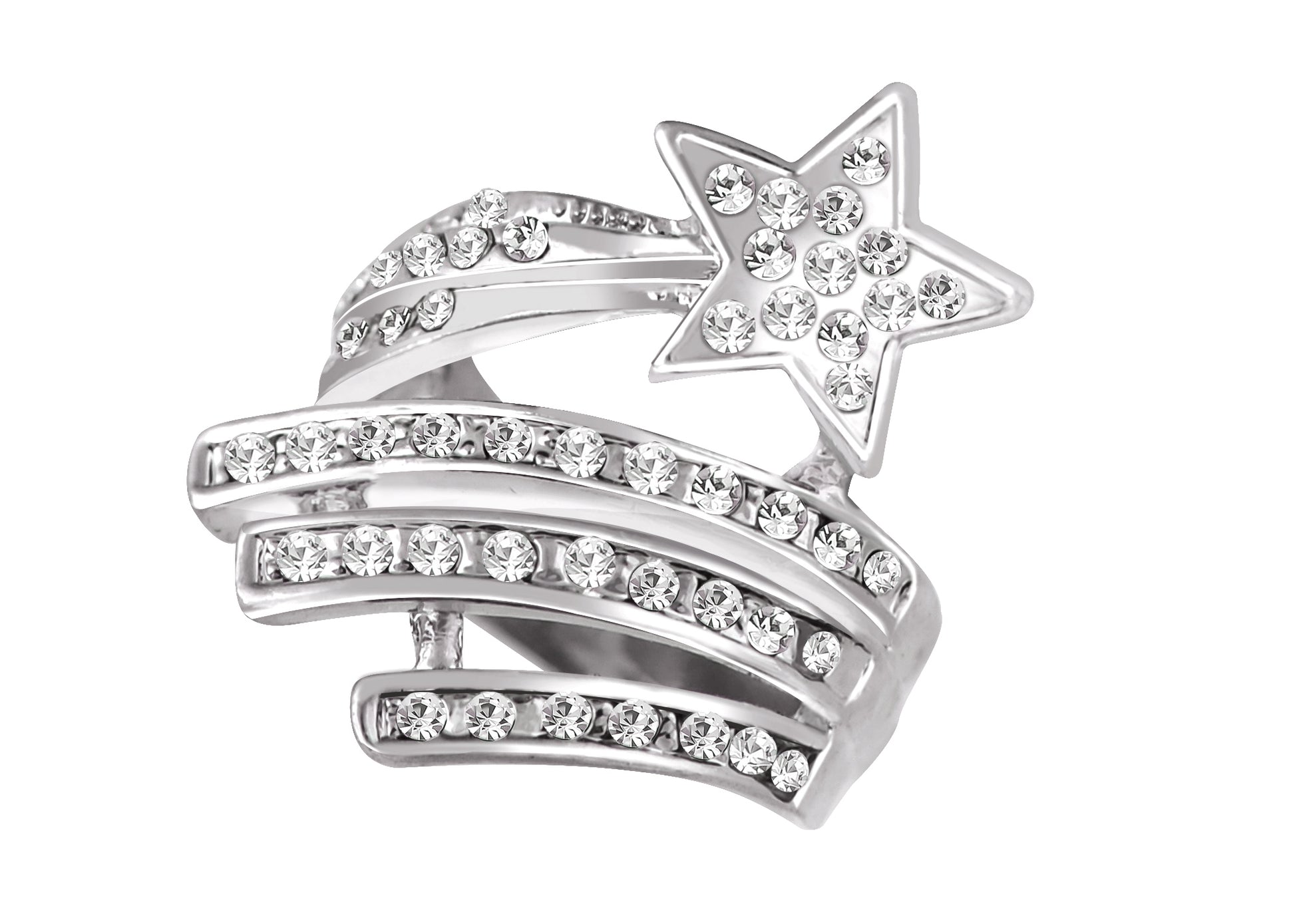 This sparkling shooting star ring features a bold wraparound design with a central rhinestone-encrusted star and shimmering trails that sweep across the finger. Crafted in a polished silver-tone finish, the ring catches the light beautifully for a radiant look. Whether worn alone or layered with other pieces, this statement ring adds a playful and celestial touch to any outfit.