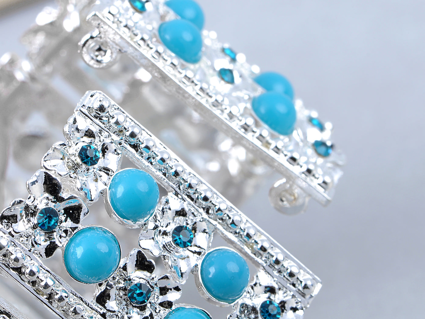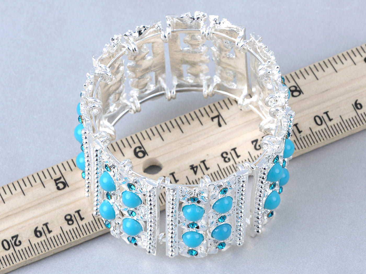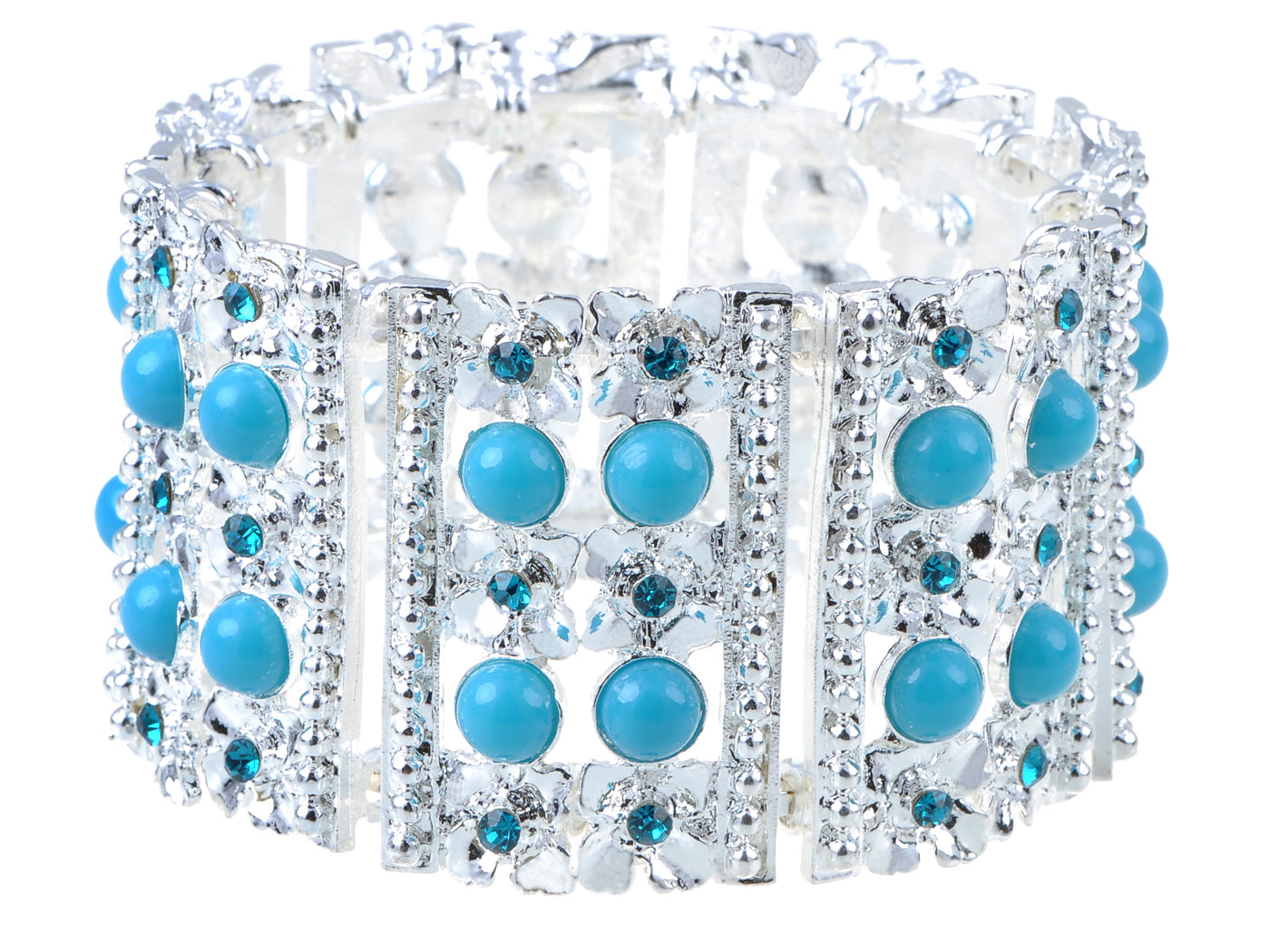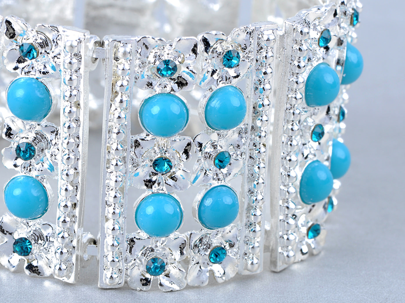 - TURQUOISE-COLORED BEADS - Synthetic turquoise accent beads add a bohemian touch. Pair it with other boho clothing and accessories for a full look. Floral design with aquamarine centers give this bracelet a touch of class and sophistication.