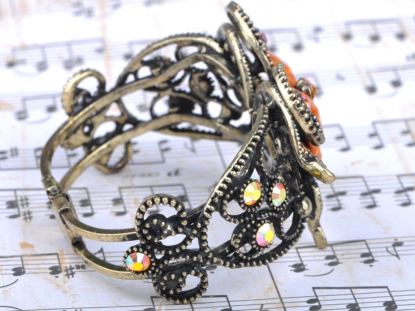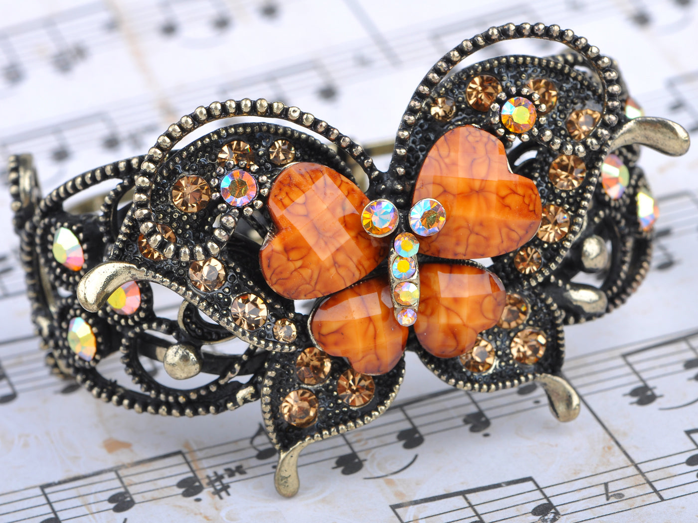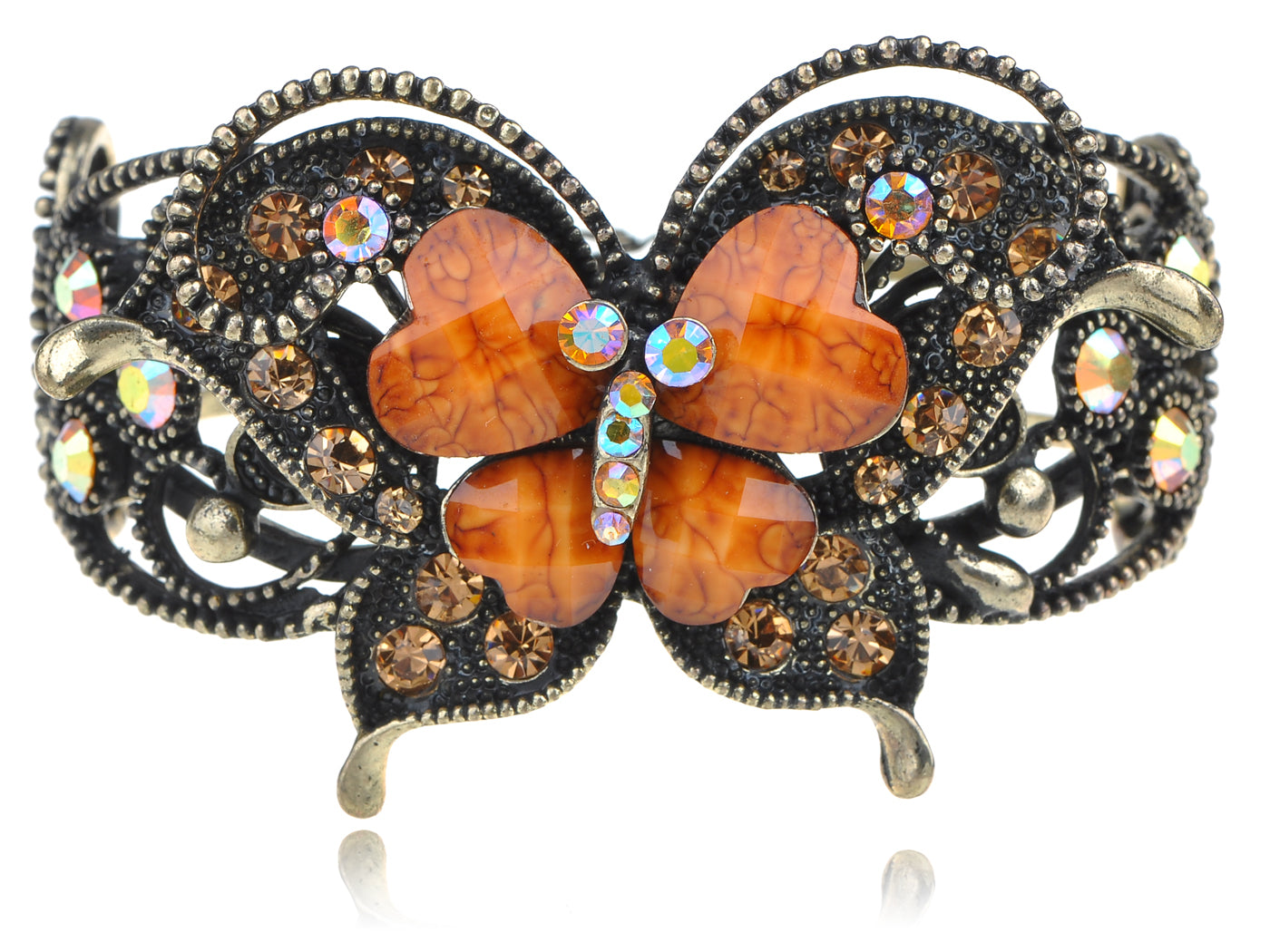 - UNIQUE DESIGN - Bracelet featuring butterfly design with topaz colored rhinestones and orange stones.