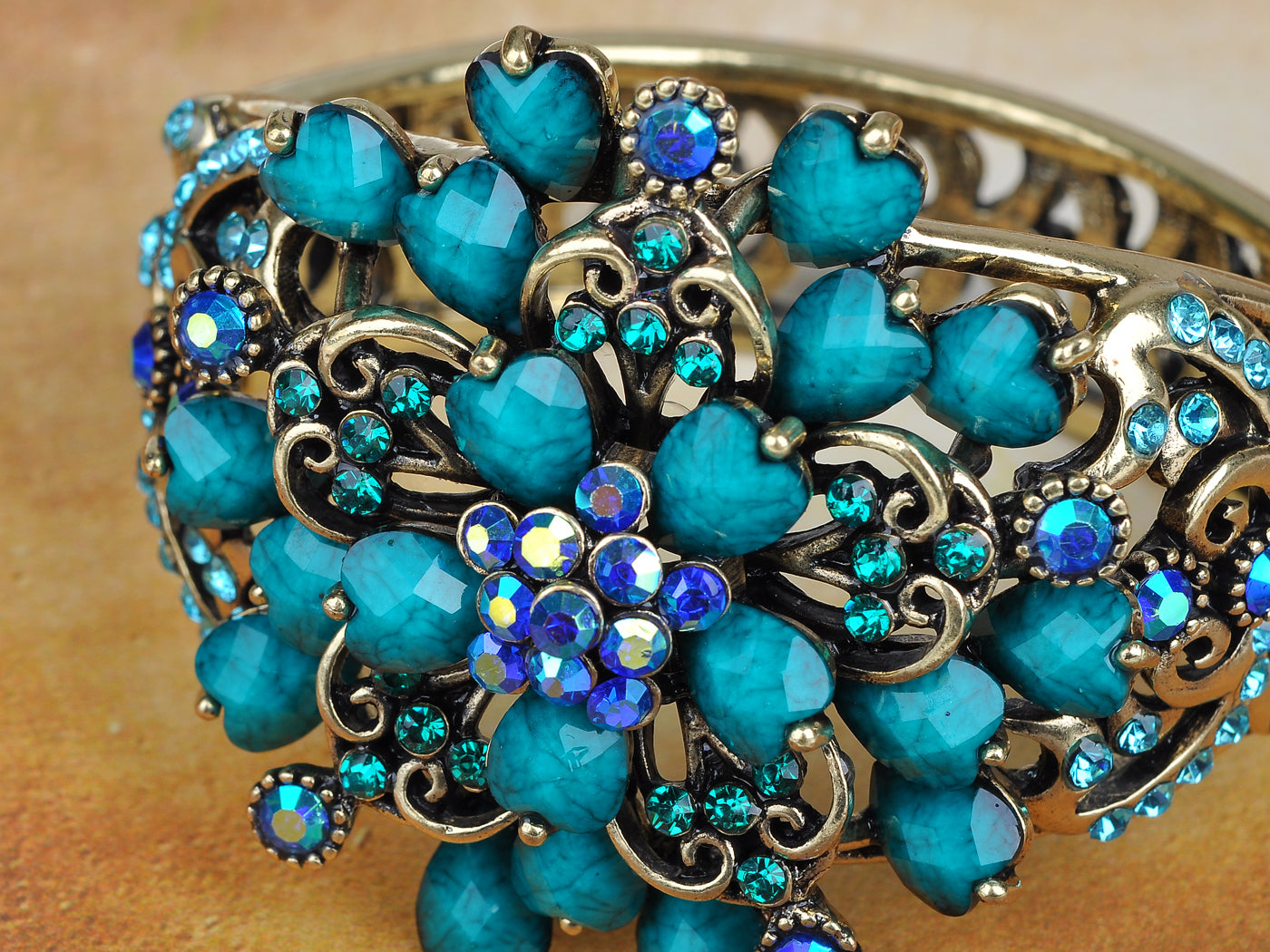 - BEAUTIFUL PAINTED BEAD FLOWERS. The flowers of this bracelet are hand-painted with varying metallic blue turquoises and finished with a glossy shiny blue faux pearl center for a gorgeous variance of cool colors.