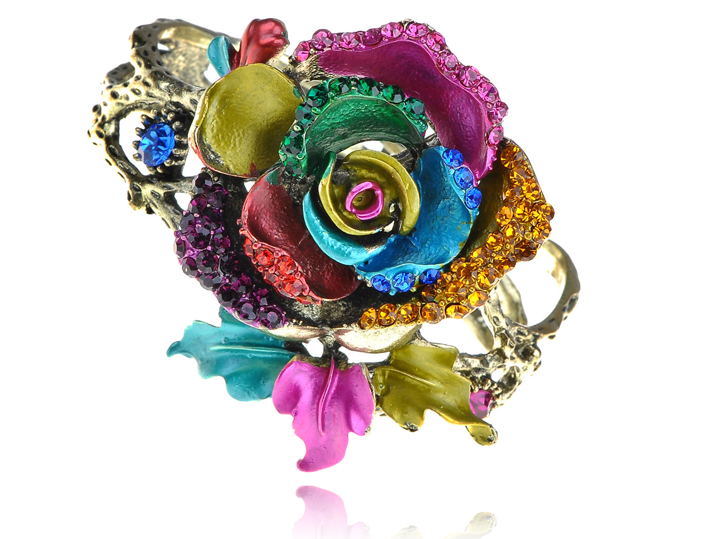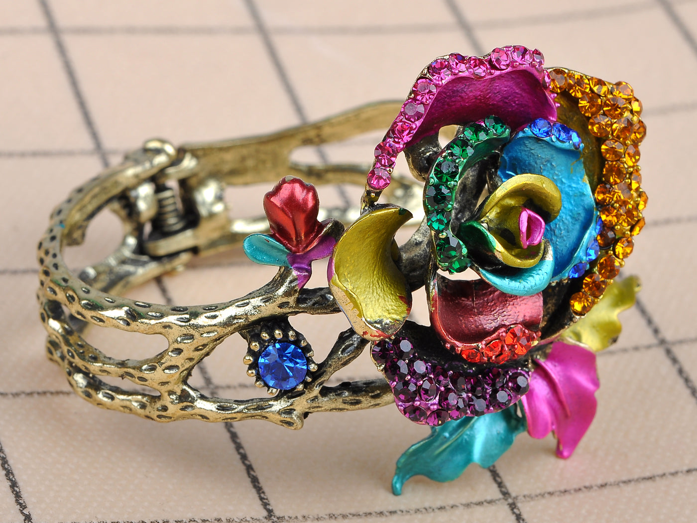 - ORIGINAL DESIGN - Very unique colorful rainbow design. This rose gets all its colors from vibrant enamel paint on the petals. Beautiful bronze colored metal makes up the rest of the bangle.