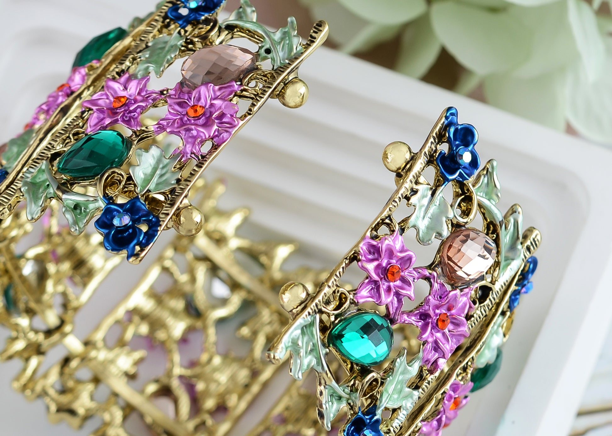Alilang Women Gold Hollow Vintage Floral Crystal Rhinestone Enamel Flower Garden Bracelet Bangle Cuff