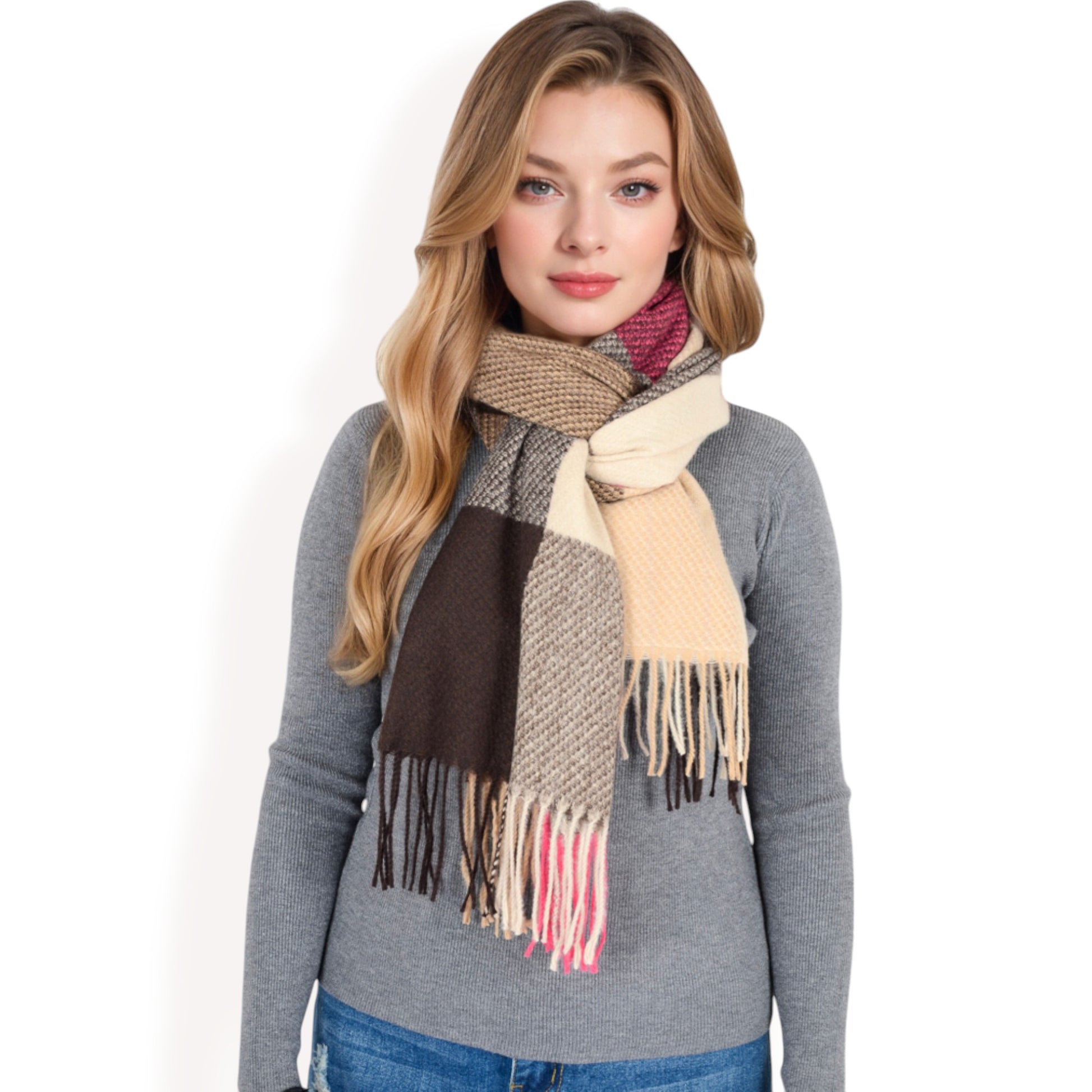 Women's Oversized Plaid Blanket Scarf with Fringe Trim and Soft Textured Fabric