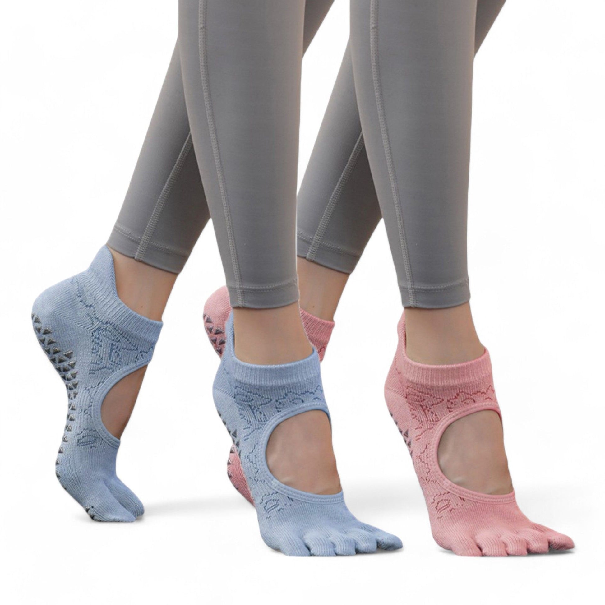 These non-slip five-toe yoga socks are designed to enhance stability and comfort during your workouts. Featuring a breathable open-top design and silicone grip soles, they ensure a secure fit and prevent slipping on studio floors. The individual toe slots promote natural movement, while the soft, durable fabric keeps your feet comfortable. Perfect for yoga, pilates, barre, or dance, these socks combine functionality with style.