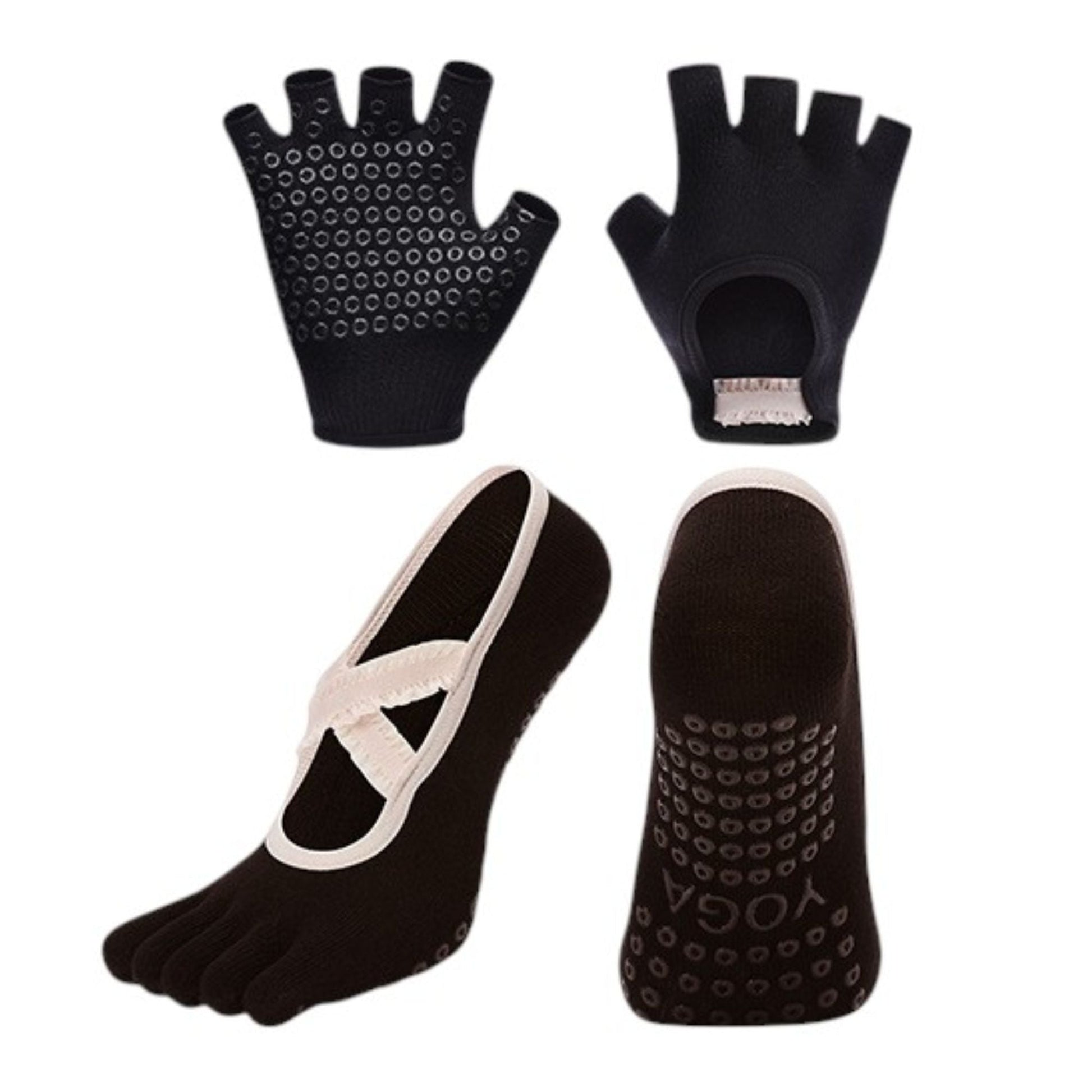 The Anna-Kaci Women's Yoga Socks and Gloves Set is designed to enhance your stability and performance during workouts. The full-toe socks and fingerless gloves both feature non-slip silicone grips, offering improved traction for yoga, Pilates, and barre. Soft, breathable fabric and flexible construction ensure a secure fit and lasting comfort. This coordinated set helps support balance and movement control during your training sessions.