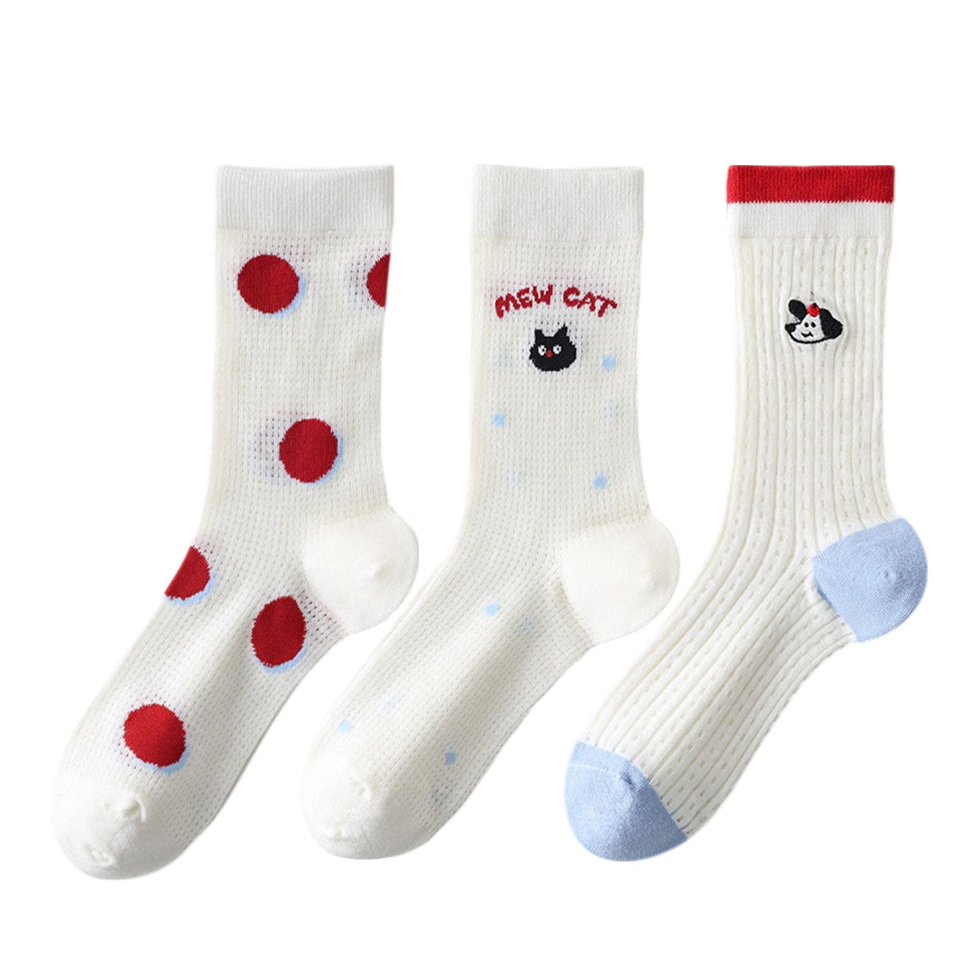 These women's crew socks feature playful embroidered designs including apples, polka dots, and cartoon cats, adding a touch of fun to your everyday wardrobe. Made from a breathable cotton knit with ribbed texture and a soft stretch cuff, they offer all-day comfort without slipping or bunching. Mix and match your favorite styles to create a personalized 3-pack. Perfect for casual outings, relaxing at home, or adding charm to your favorite low-top sneakers.