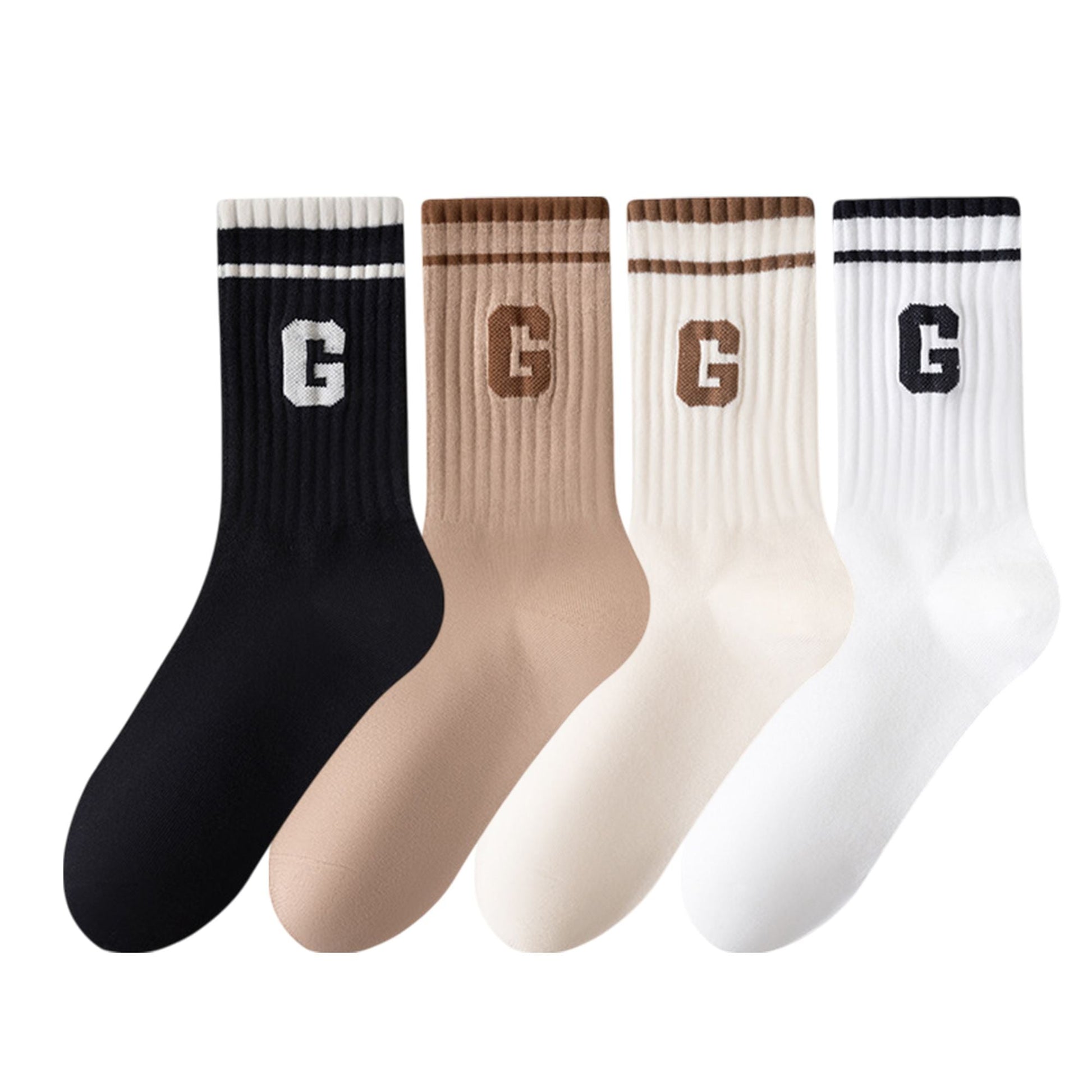 This 4-pair pack of women's crew socks features a bold ribbed texture with sporty striped cuffs and a distinctive ¡°G¡± letter embroidery. Made from soft, breathable cotton, these socks offer a comfortable fit with a fashionable edge. The mid-calf length makes them ideal for pairing with sneakers or casual shoes. Available in five modern color combinations to suit everyday wear or active outfits.