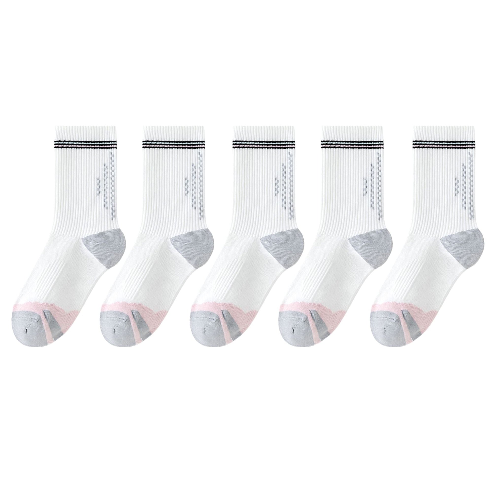 These 5-pair sets of women's mid-crew sport socks offer the ideal combination of support, comfort, and performance. Featuring cushioned soles, arch compression, and breathable mesh zones, they¡¯re designed for intense workouts and daily activities. The elastic cuff and 3D heel keep the sock in place while reducing friction. Available in various color combinations, perfect for pairing with sneakers or running shoes.