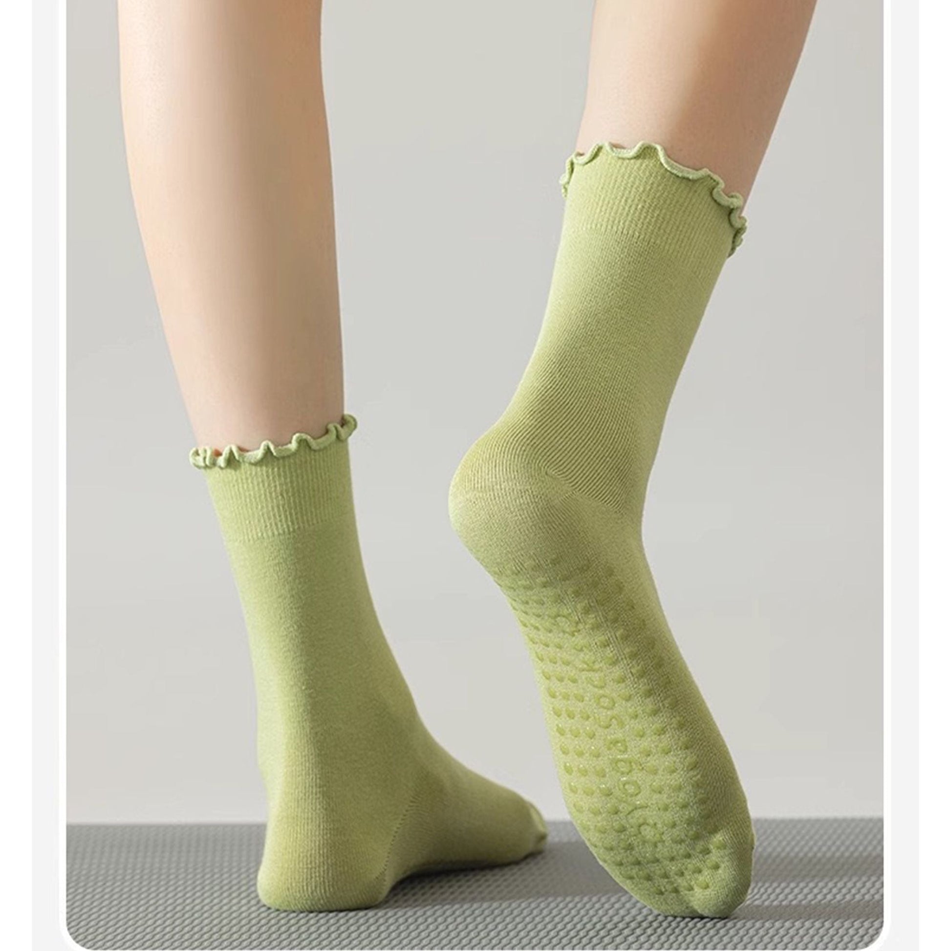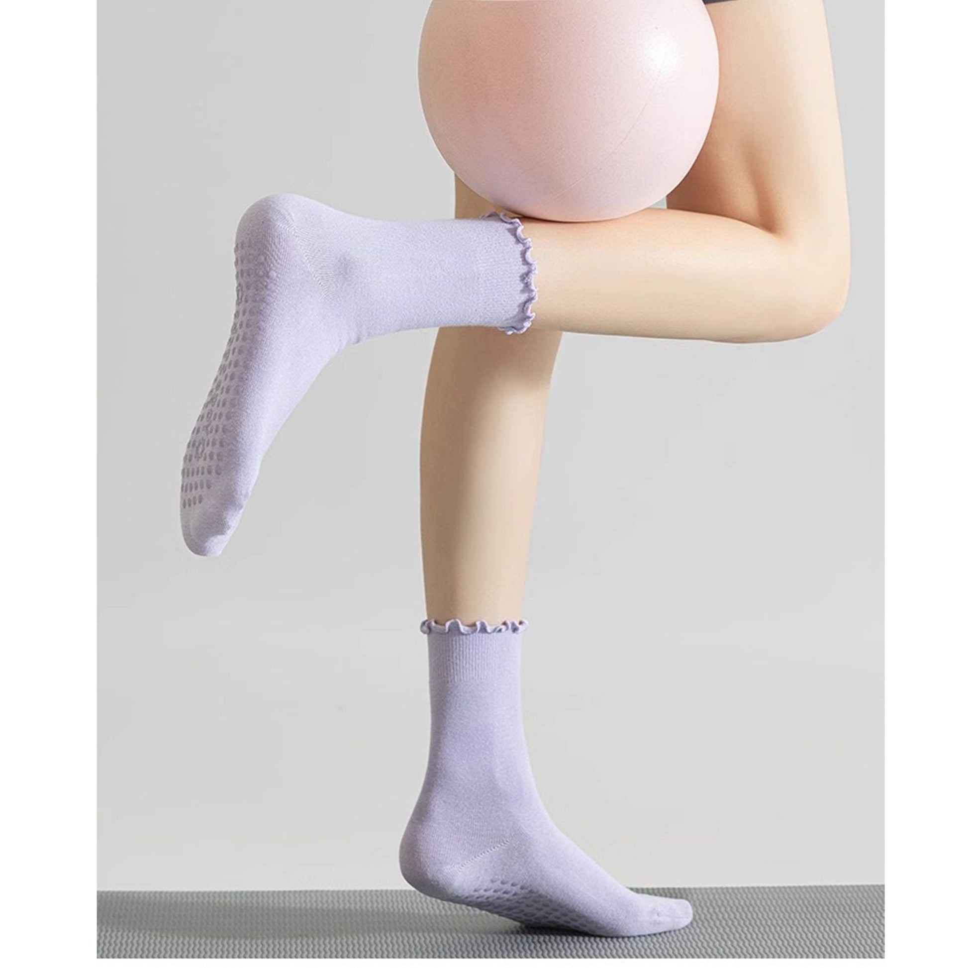 This 5-pair set of women¡¯s yoga socks features soft cotton construction with full-sole silicone grips for enhanced stability and safety during movement. Designed with a seamless toe and ruffled cuffs, these crew-length socks provide a secure, feminine fit while preventing slips during yoga, barre, or indoor workouts. Available in various pastel and neutral color options for stylish comfort.